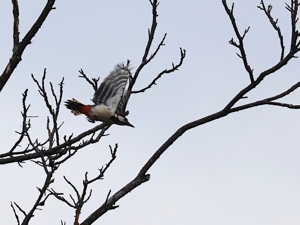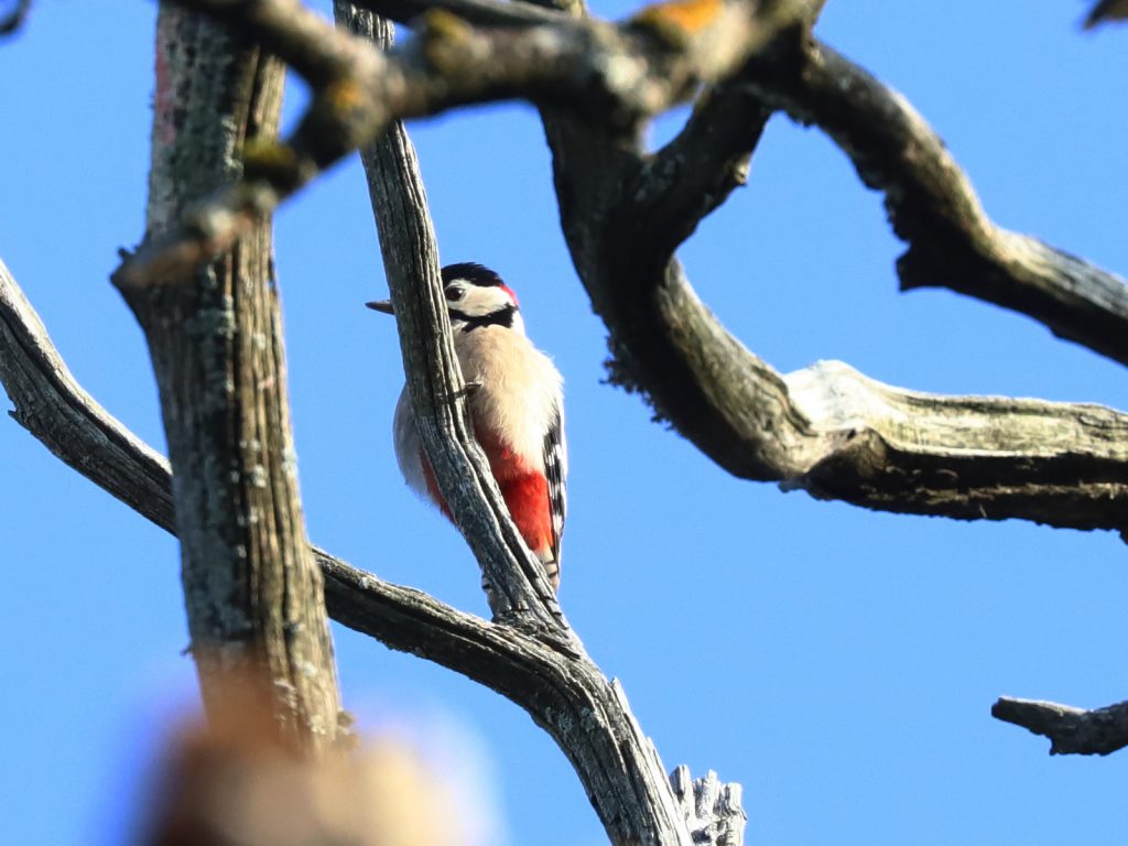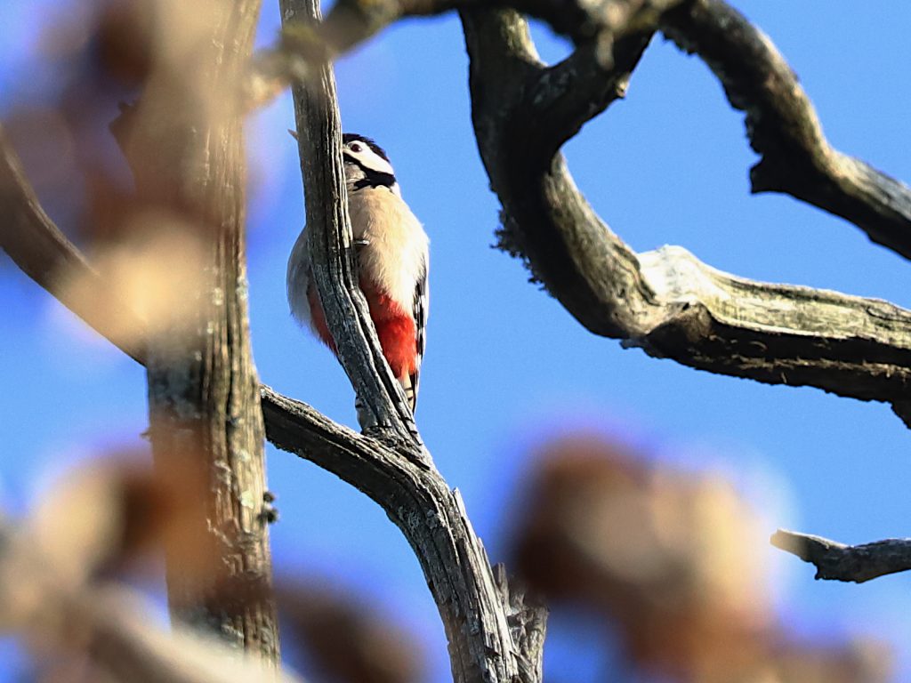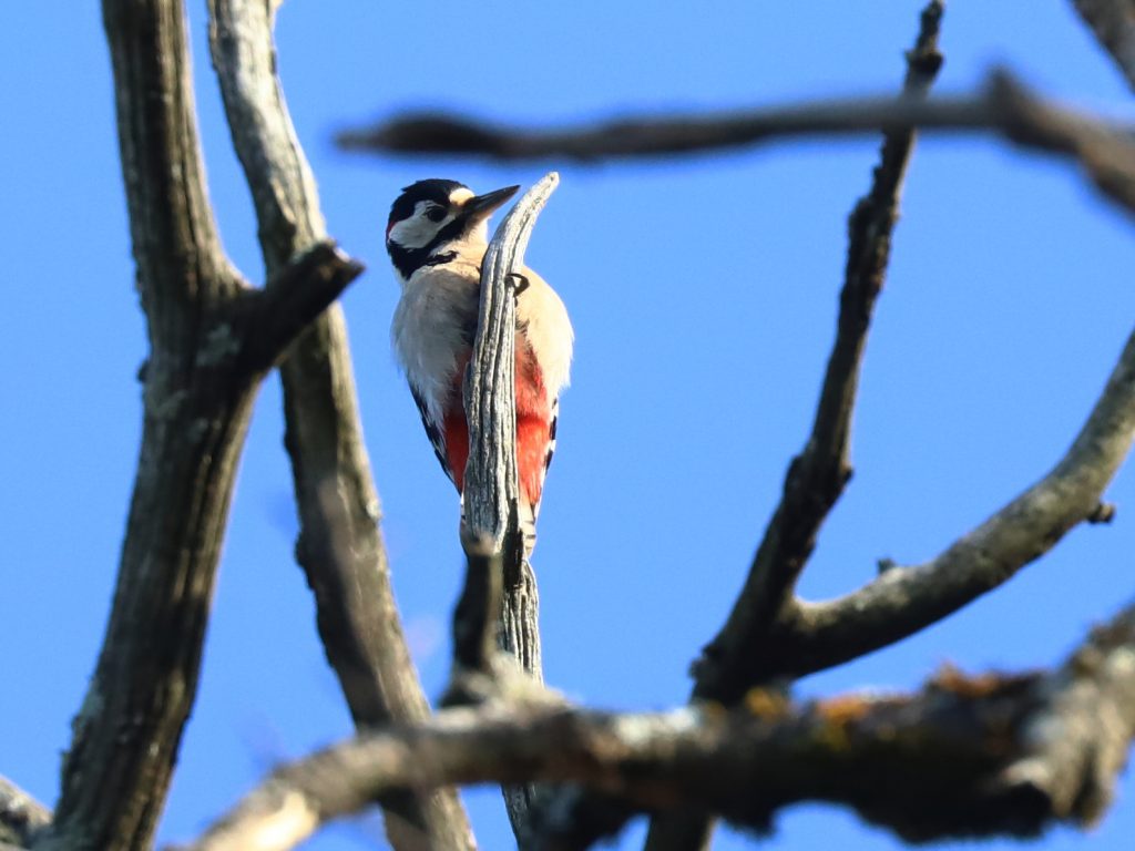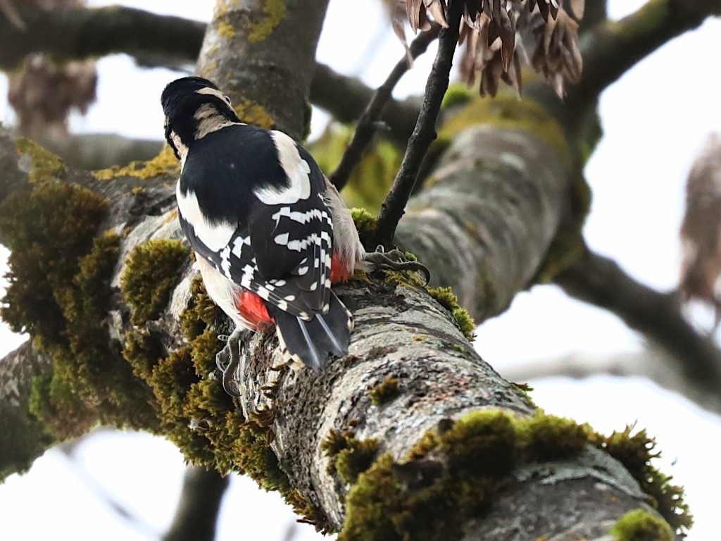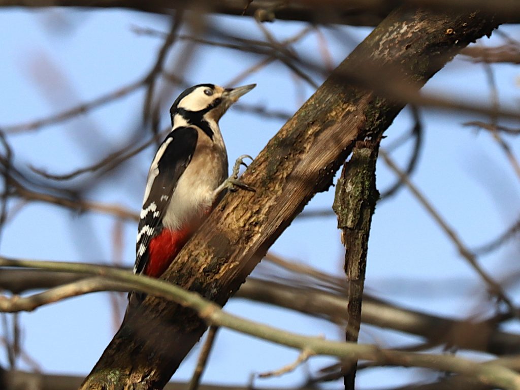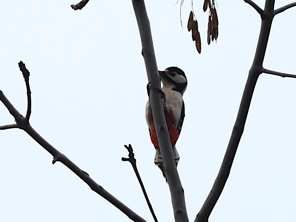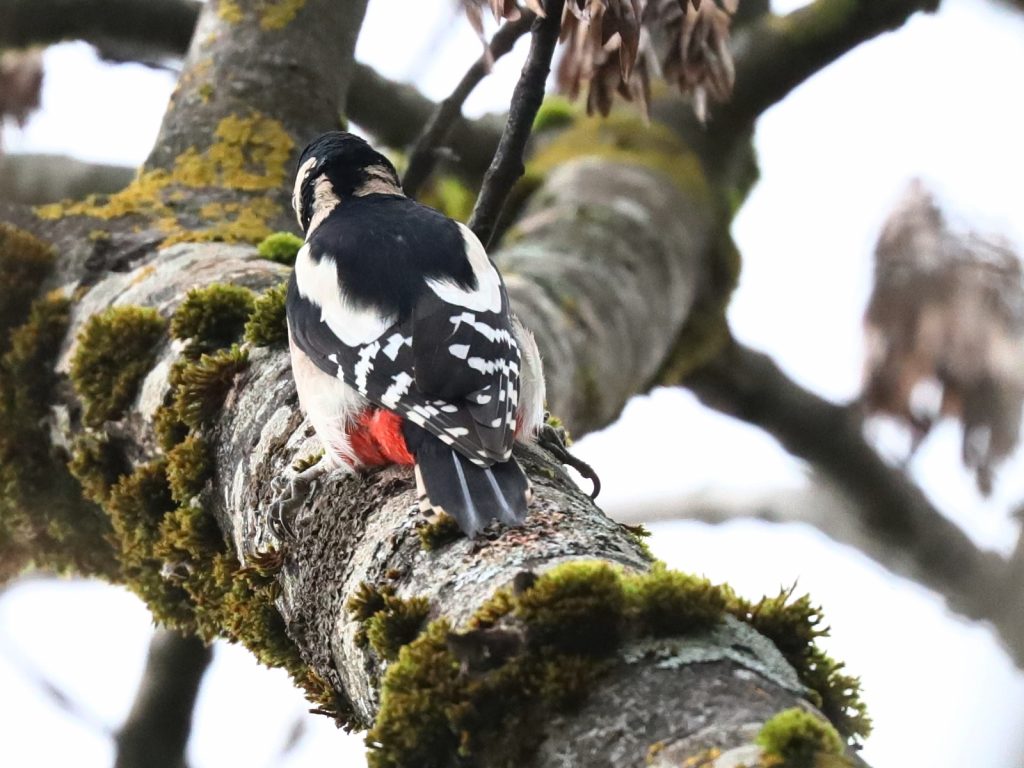 Vous connaissez bien le Pic épeiche Dendrocopos major, avec sa tête noire et blanche, son poitrail blanc et le croupion rouge.