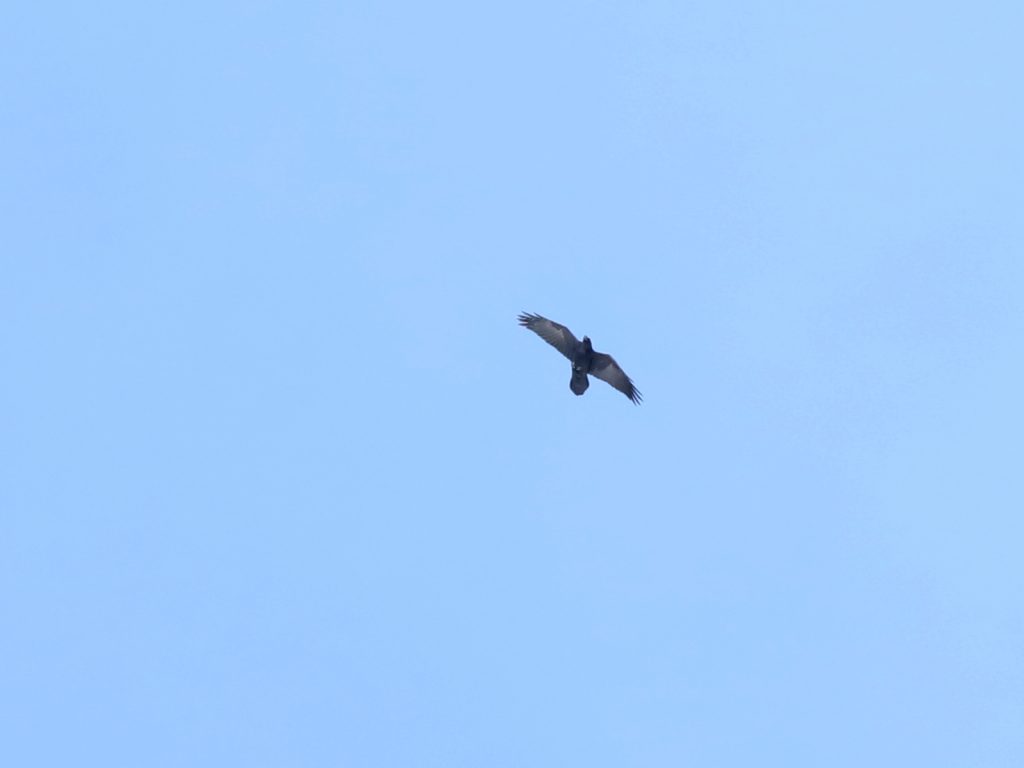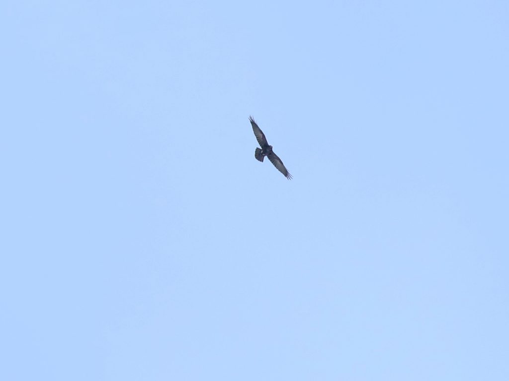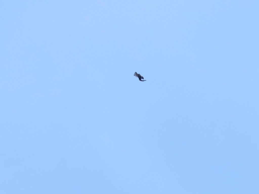 Cet oiseau avait tout le comportement du migrateur : prise d’altitude dans les courants, glissade sur l’aile et reprise d’un courant. Je pense qu’il s’agit d’une femelle d’Epervier d’Europe Accipiter nisus mais je reste mal à l’aise pour différencier de l’Autour des palombes Astur gentilis.