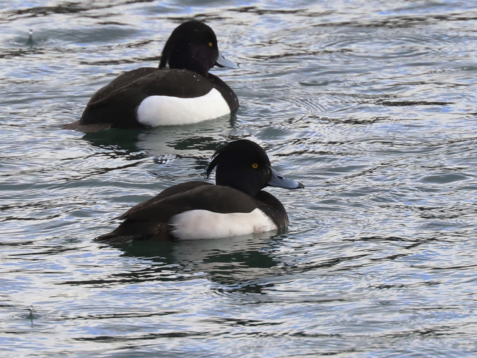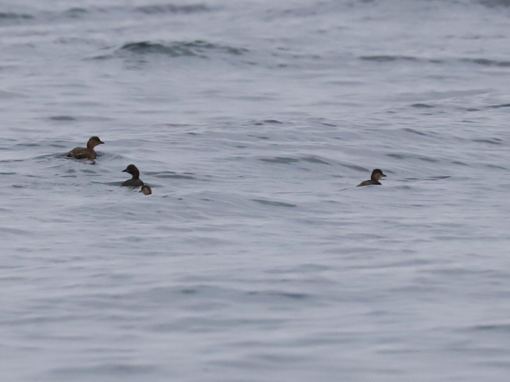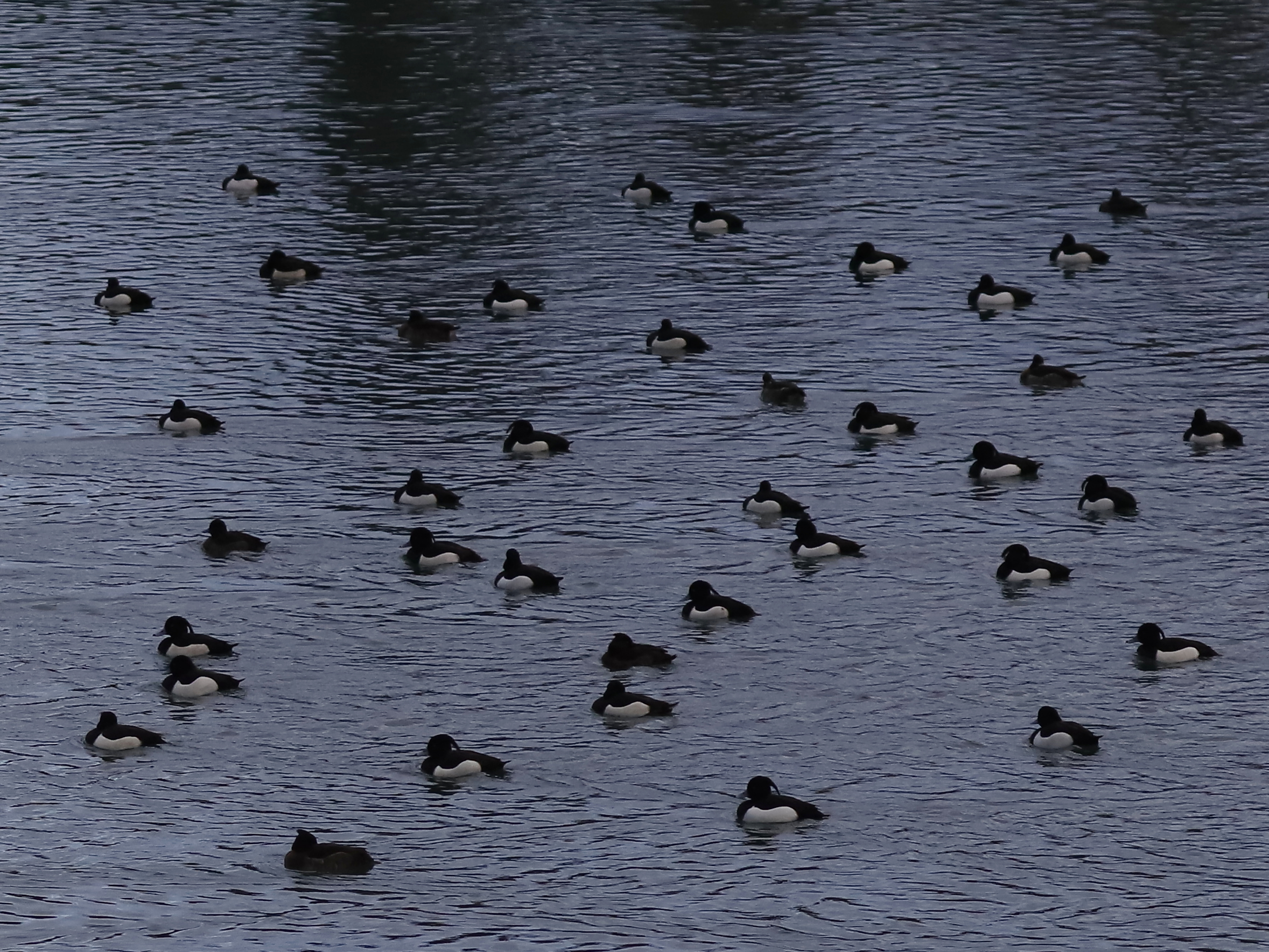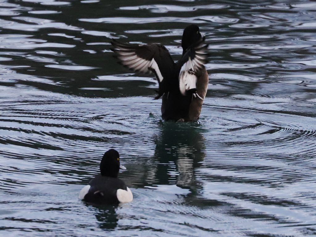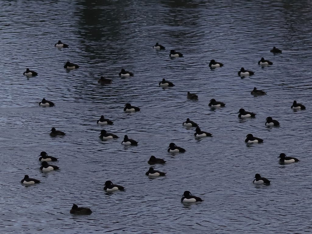 Les Fuligules morillons Aythya fuligula, aussi toujours en groupes, commencent à se rassembler sur le plan d’eau bien calme de la réserve du delta de la Dranse. Les mâles ont le flanc bien blanc, contrairement aux femelles colorées en brunâtre.