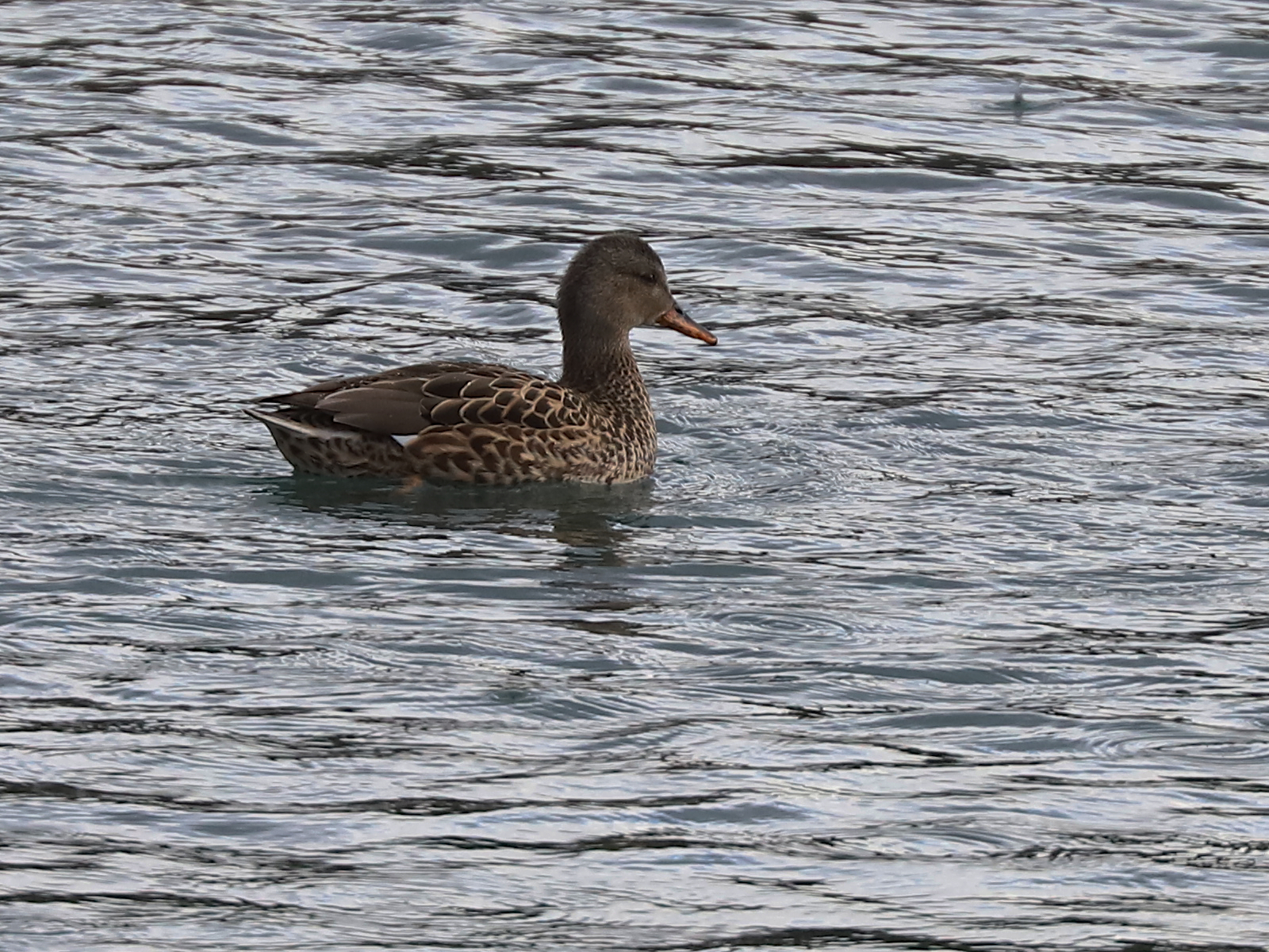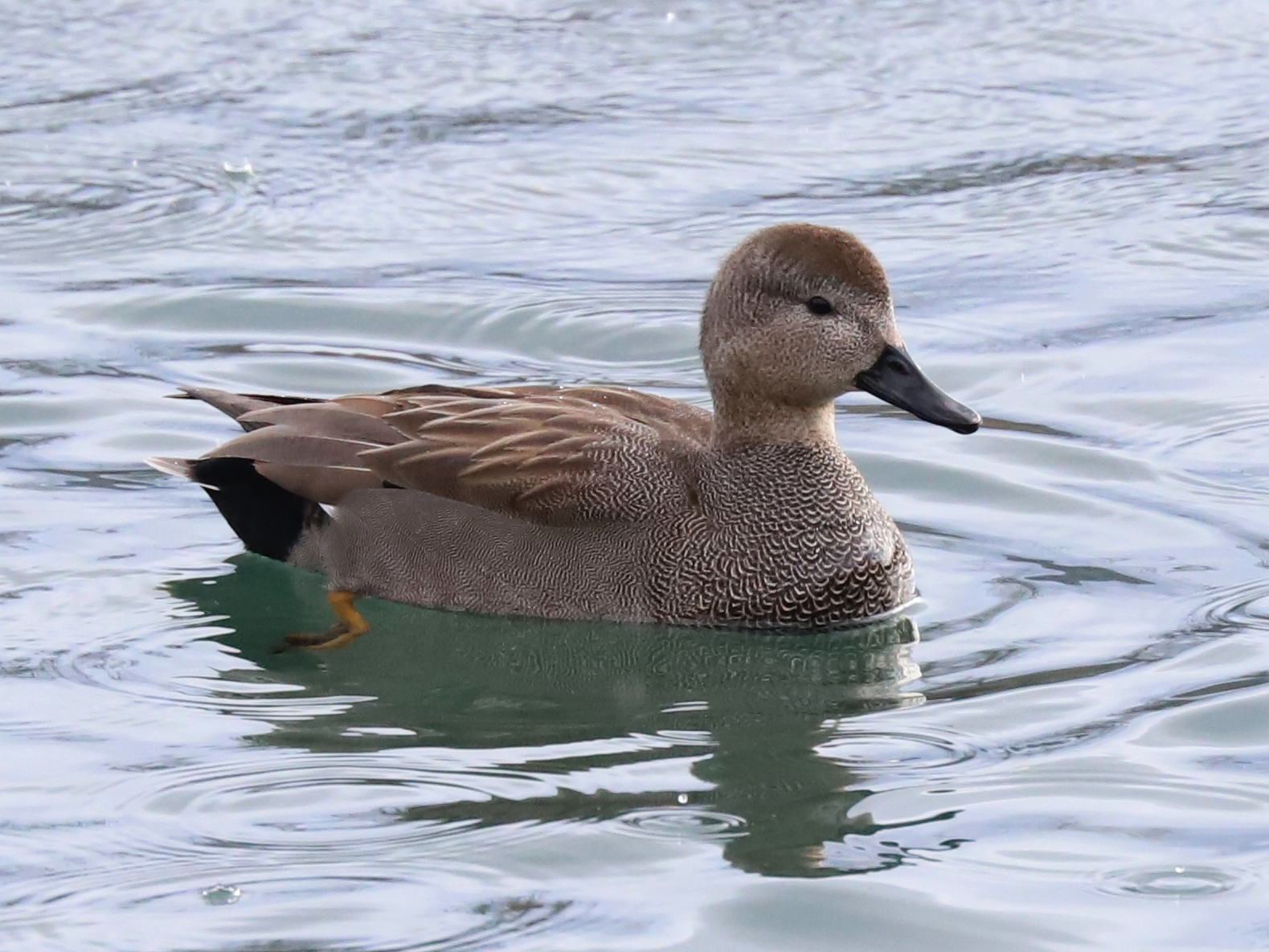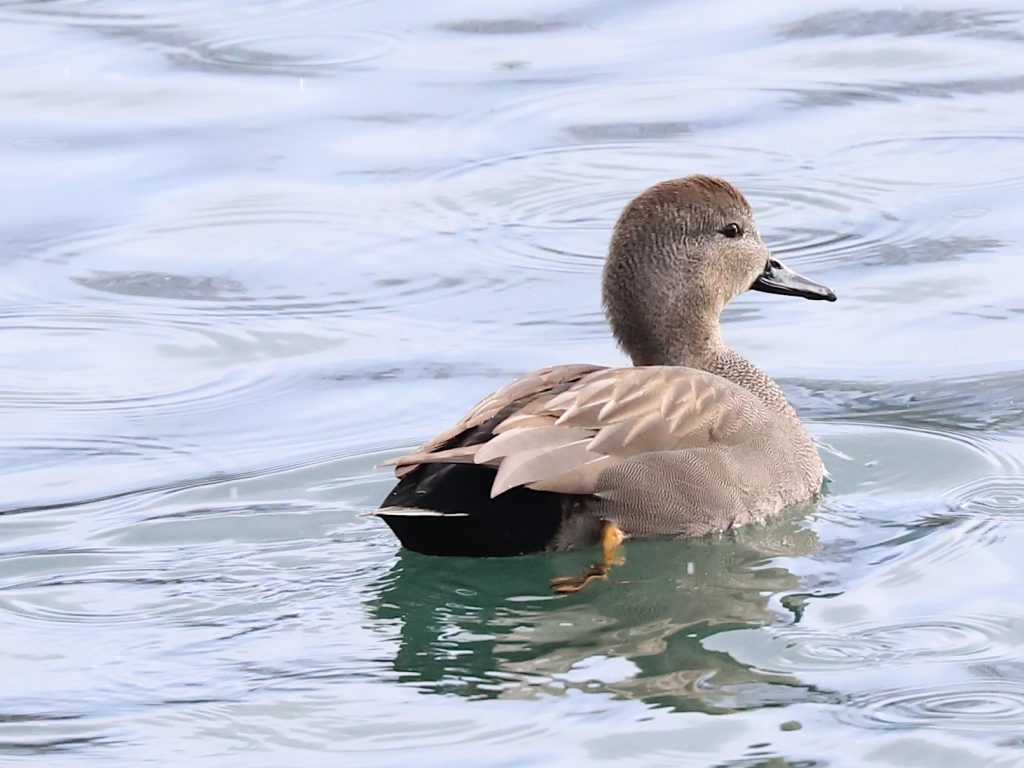 … et quelques Canards chipeau Mareca strepera. Les mâles apparaissent gris mais la poitrine est un joli gris chiné et les plumes du dos sont brunes quand le plumage nuptial est complet. Les femelles ont la tête grise et le corps brun mais composé de motifs qui en font un bel animal.