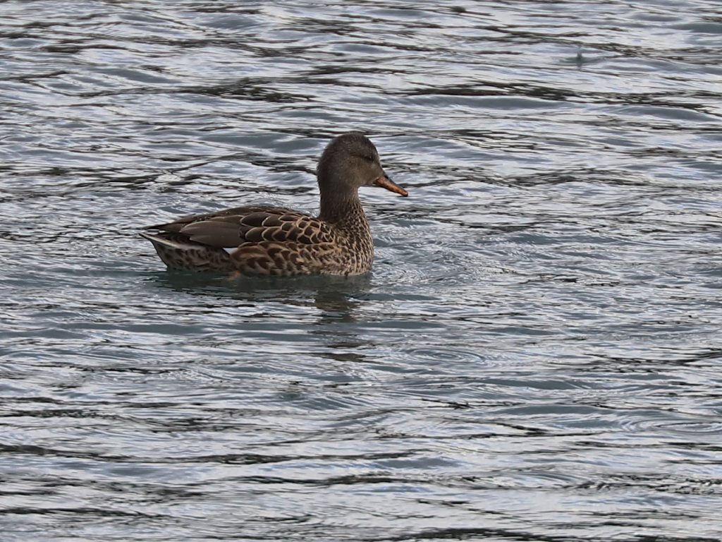 Une espèce de canards, le Canard chipeau Mareca strepera fréquente aussi le plan d’eau. Il y a des groupes mais lâches, ce n’est pas une espèce grégaire, ce sont simplement les prémices de la formation des couples. La femelle a un plumage brun avec de jolis motifs tandis que le mâle est gris aussi avec des motifs sur la base du cou.