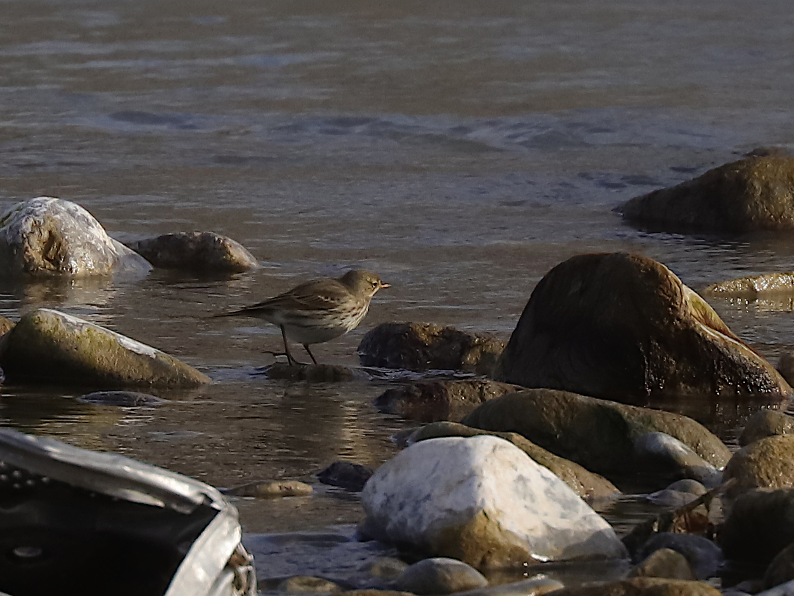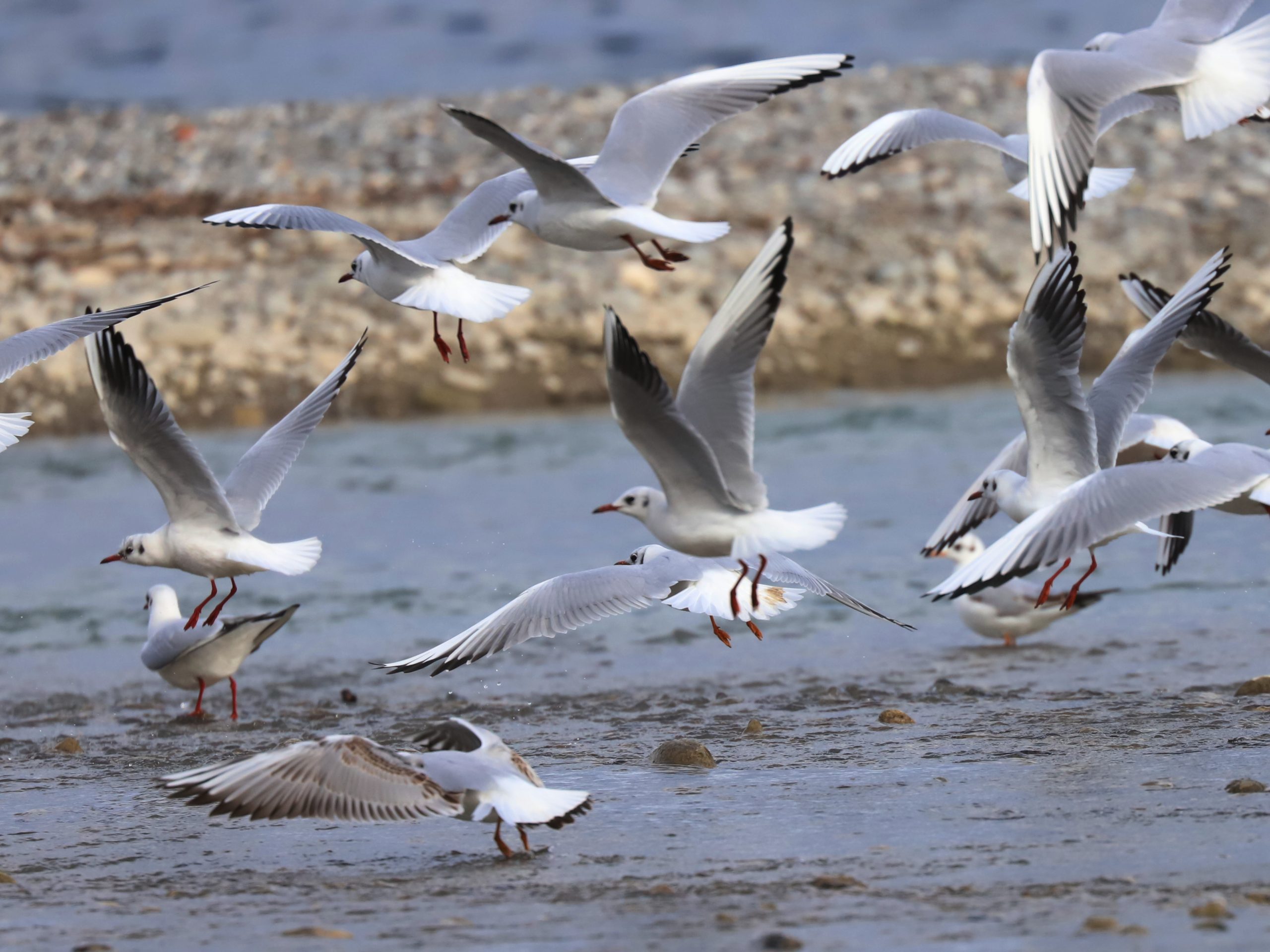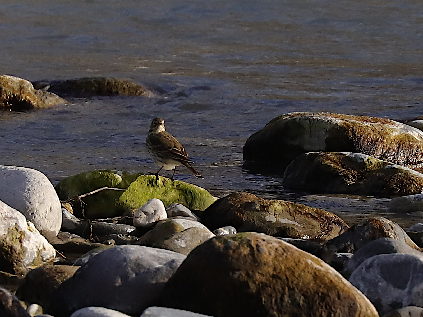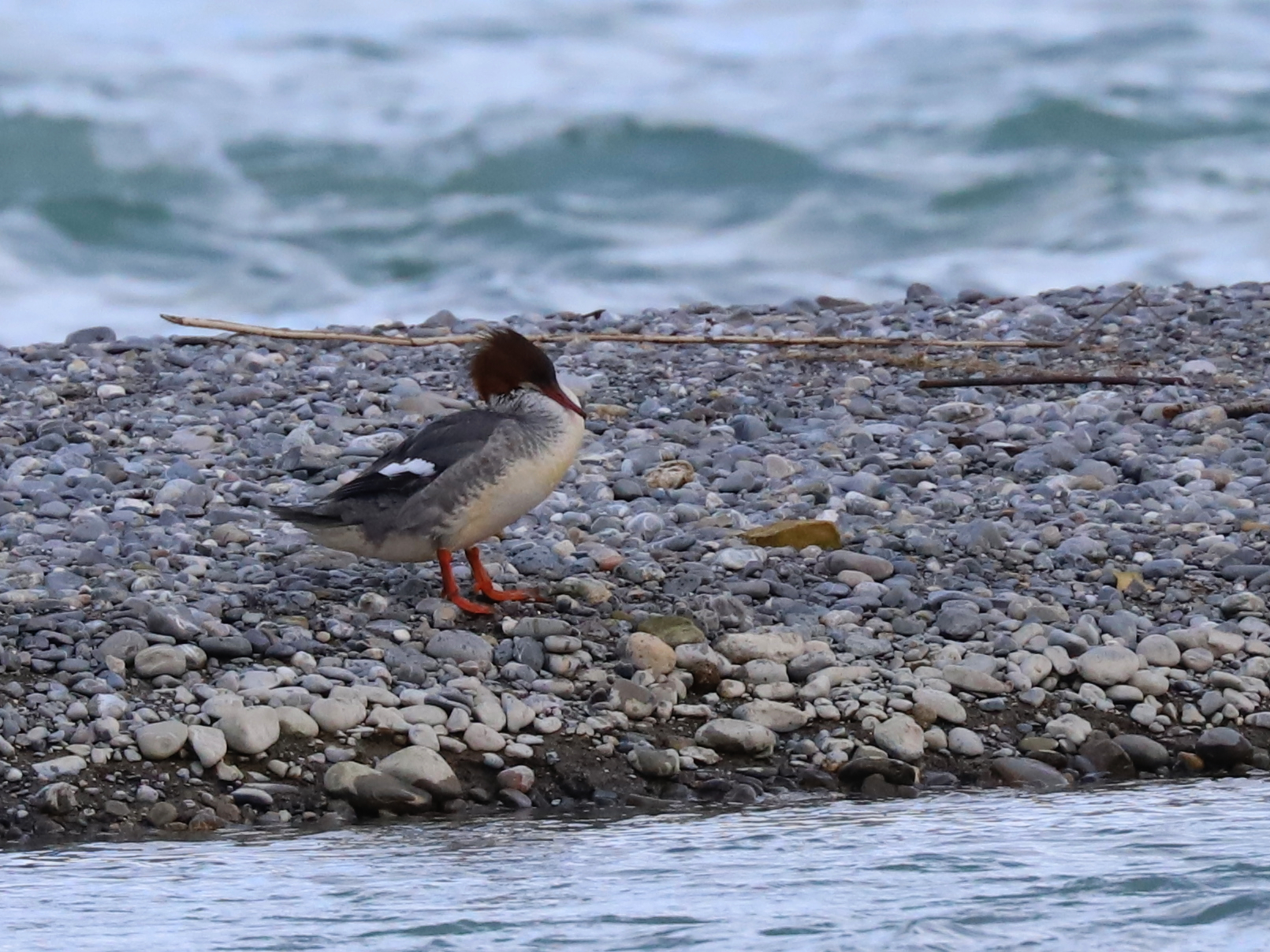 Les galets constituent une aire de repos pour les Harles bièvres Mergus merganser. Il n’y a là que des femelles, les mâles sont passés trop loin ce jour là.