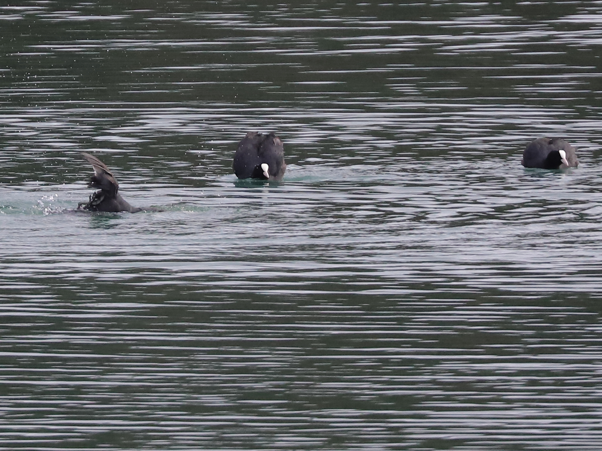 Pour terminer, une histoire de Grands cormorans Phalacrocorax carbo et d’espace vital. Un oiseau, seul, avait trouvé une place de choix pour sécher ses ailes. Evidemment, à deux puis à trois, ça devient un peu serré.