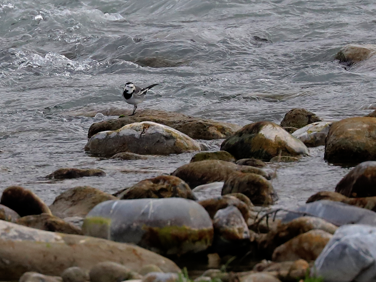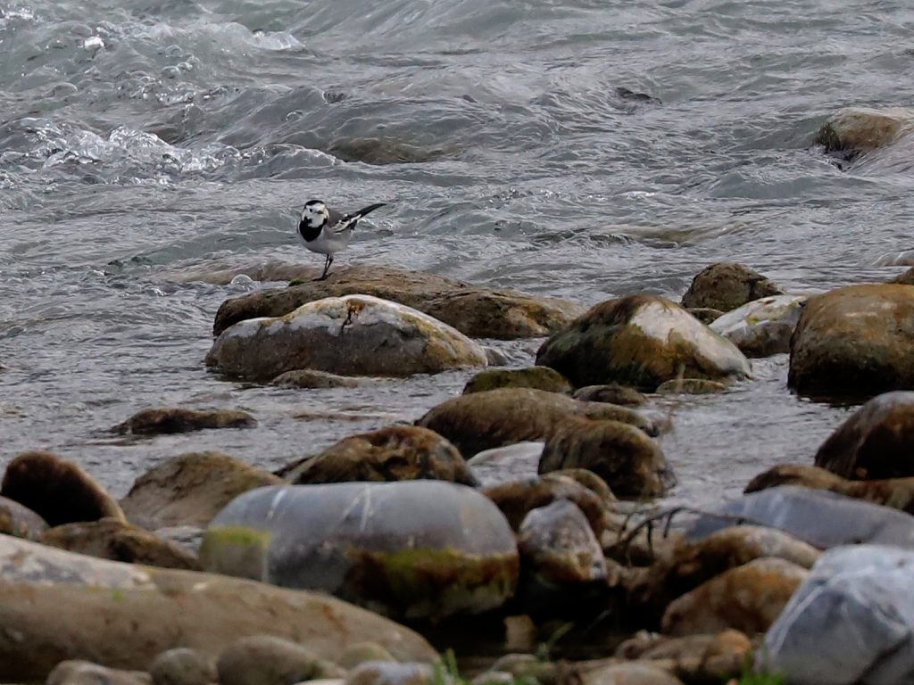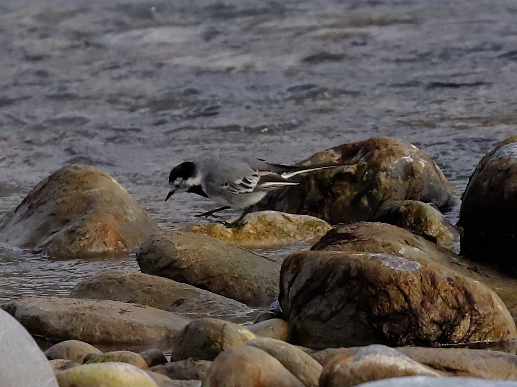 Une Bergeronnette grise Motacilla alba fouille les galets à la recherche de nourriture …