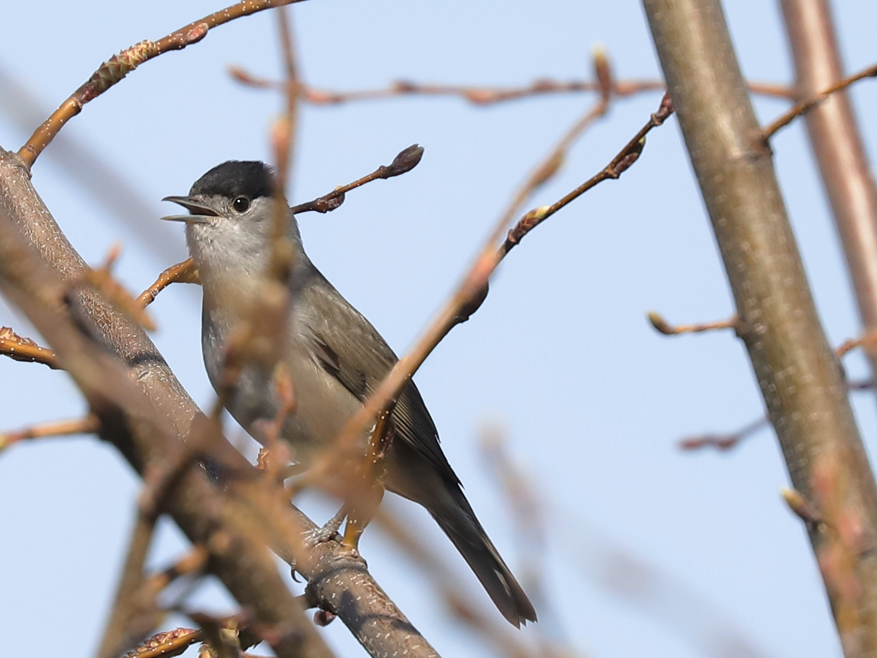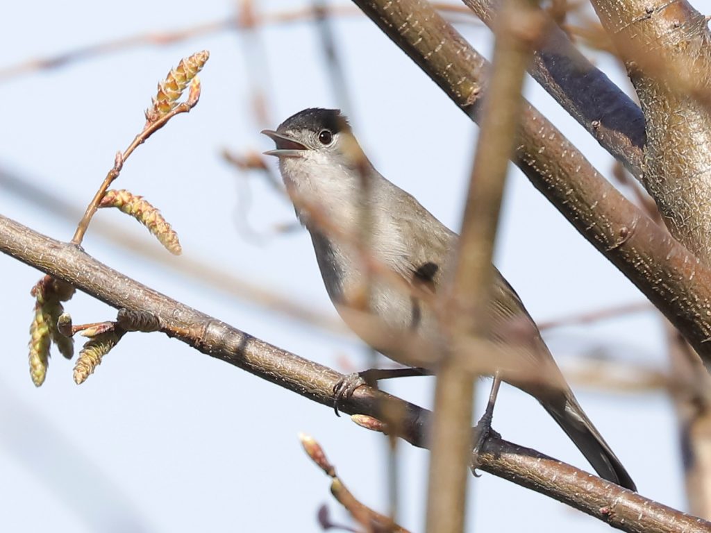 … alors que le mâle de la Fauvette à tête noire Sylvia atricapilla, de retour de migration, chante peut-être pour attirer une possible partenaire.
