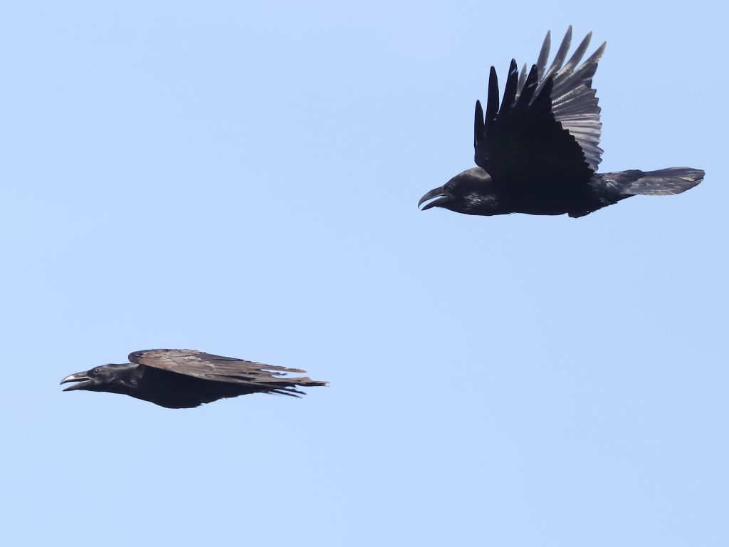 Les Corneilles noires Corvus corone commencent à se livrer à des poursuites, peut-être des vols nuptiaux …