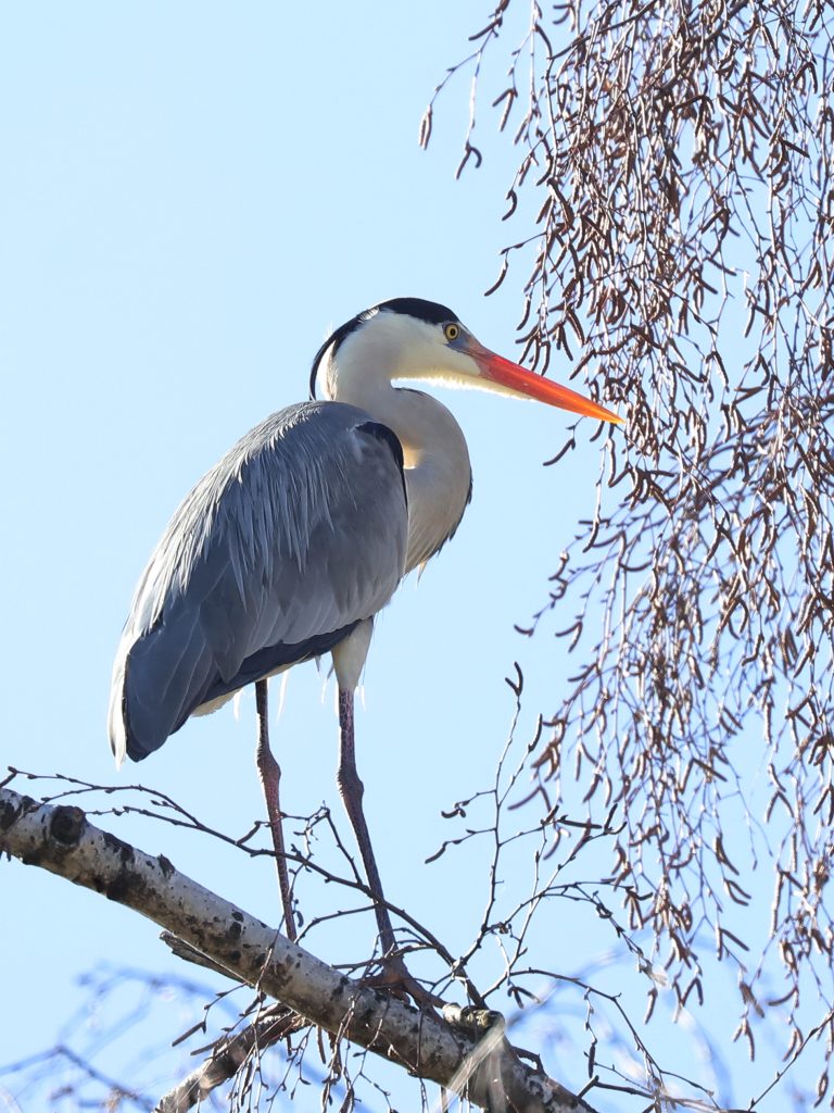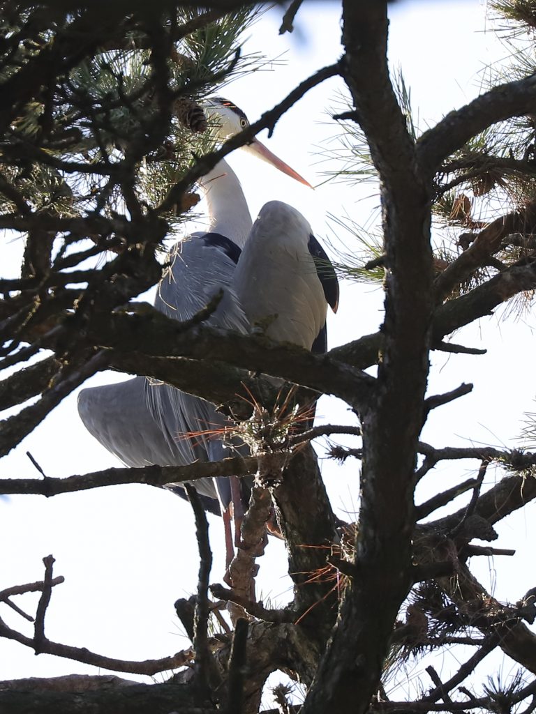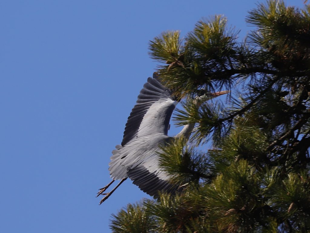 Dans les grands pins, les Hérons cendrés Ardea cinerea s’occupent aussi de leurs nids, commençant à transporter toutes sortes de branches et brindilles.