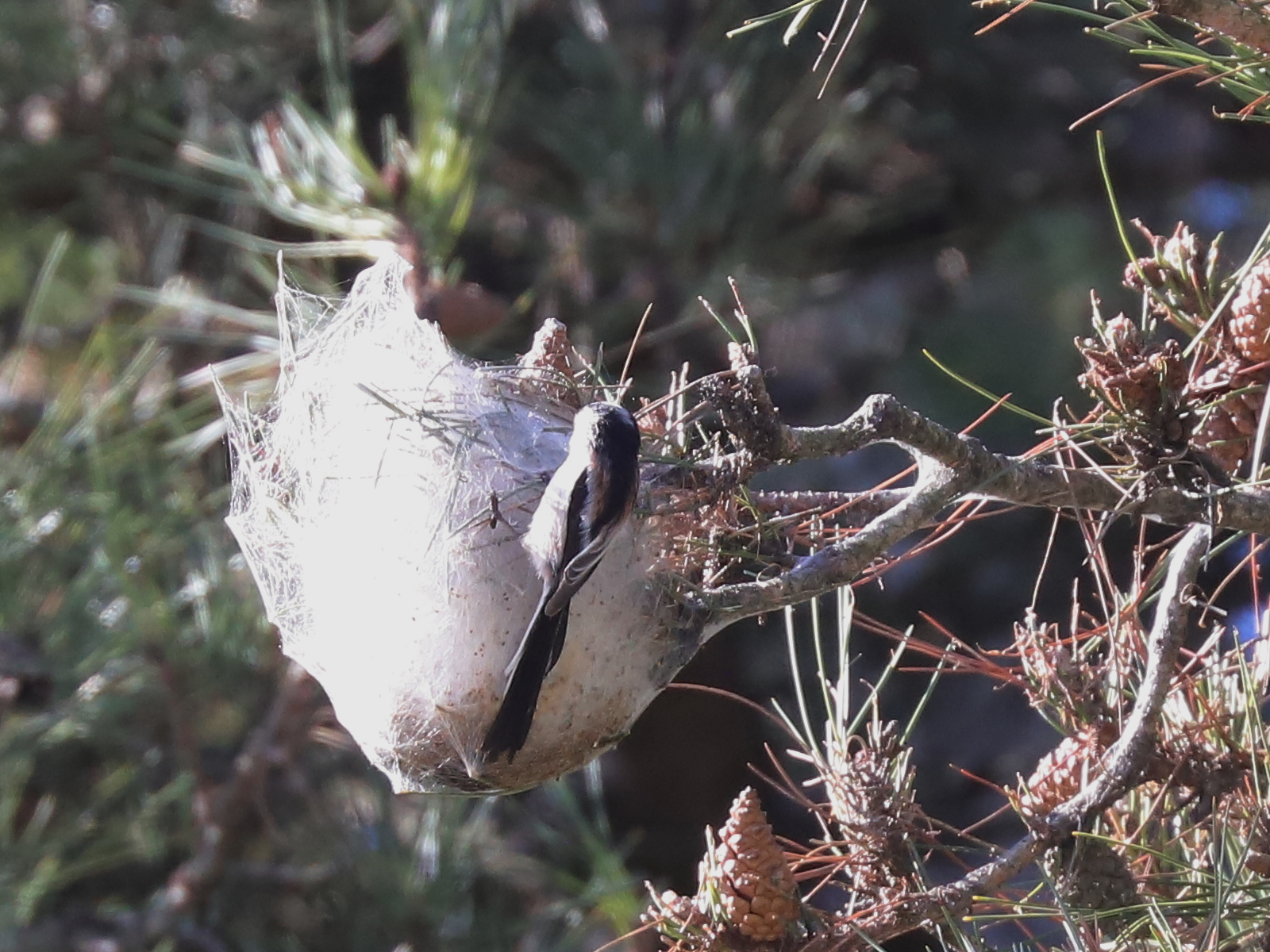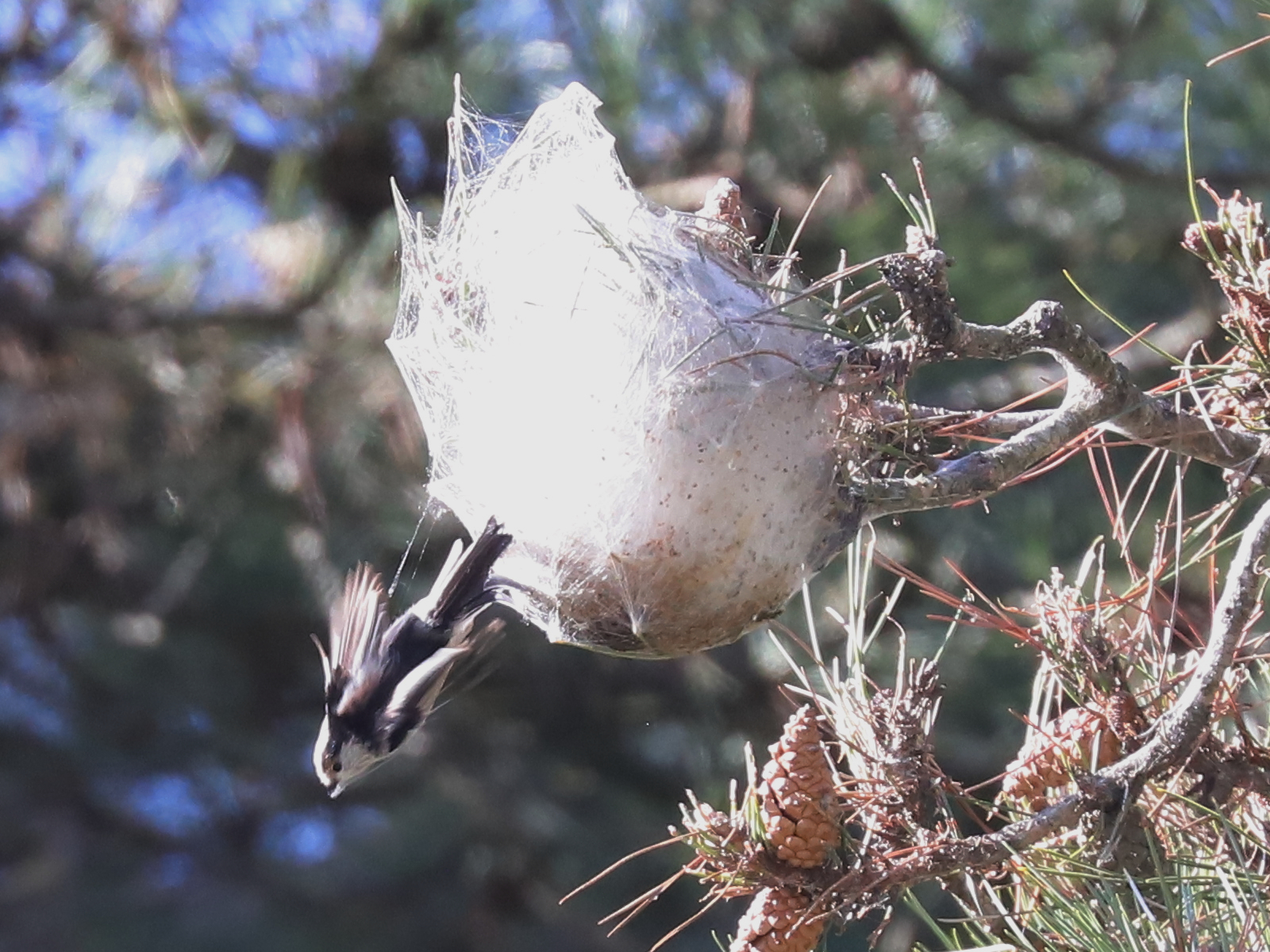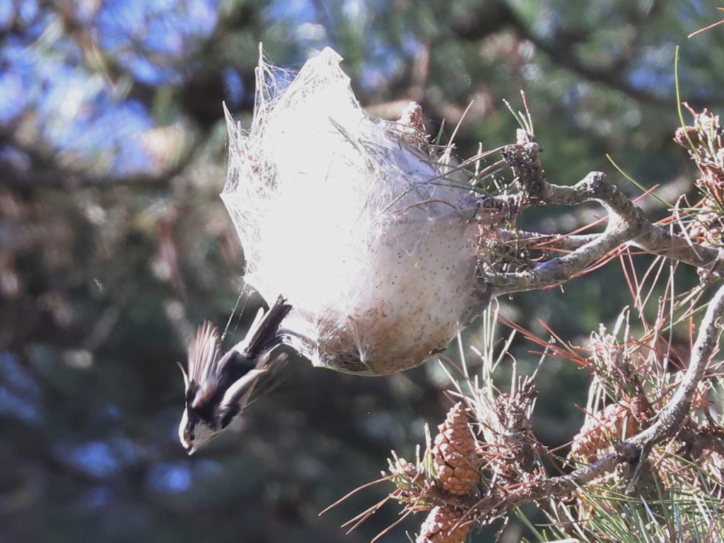 Les Orites ou Mésanges à longue queue Aegithalos caudatus s’occupent de tisser leur nid, n’hésitant pas à venir prélever de la soie sur les nids de chenilles processionnaires. Je doute que cette action affaiblisse significativement les nids de ces chenilles.