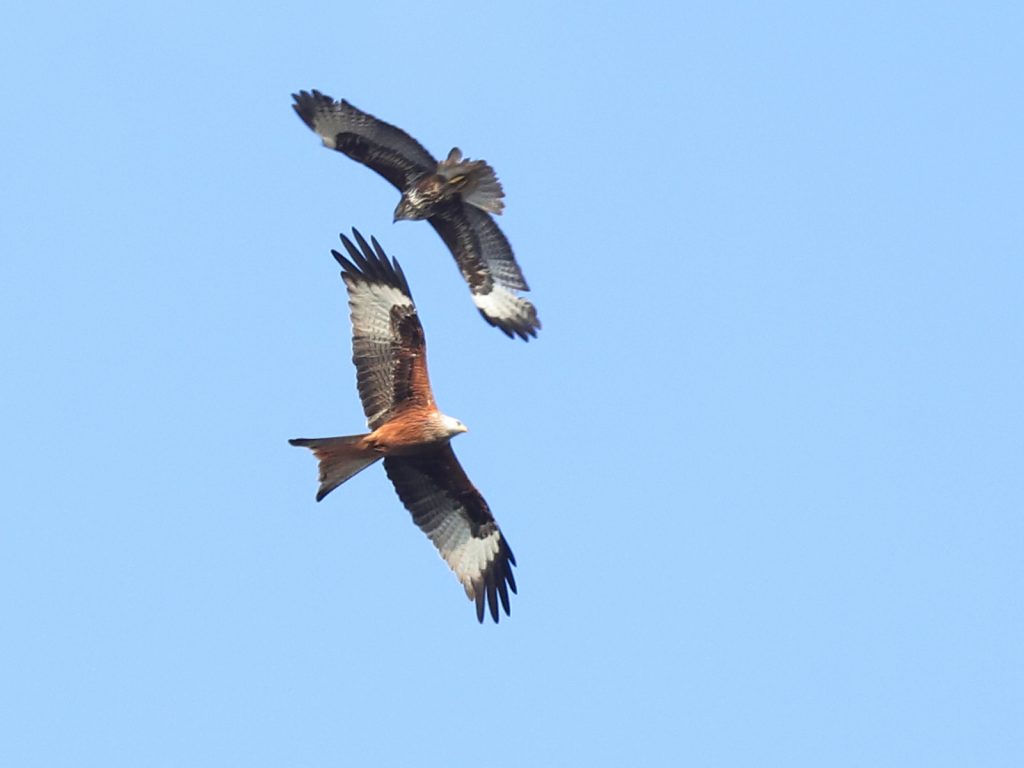 A une altitude variable selon les courants thermiques, les rapaces poursuivent leurs passages, voici un Milan royal Milvus milvus en bas et une Buse variable Buteo buteo en haut.