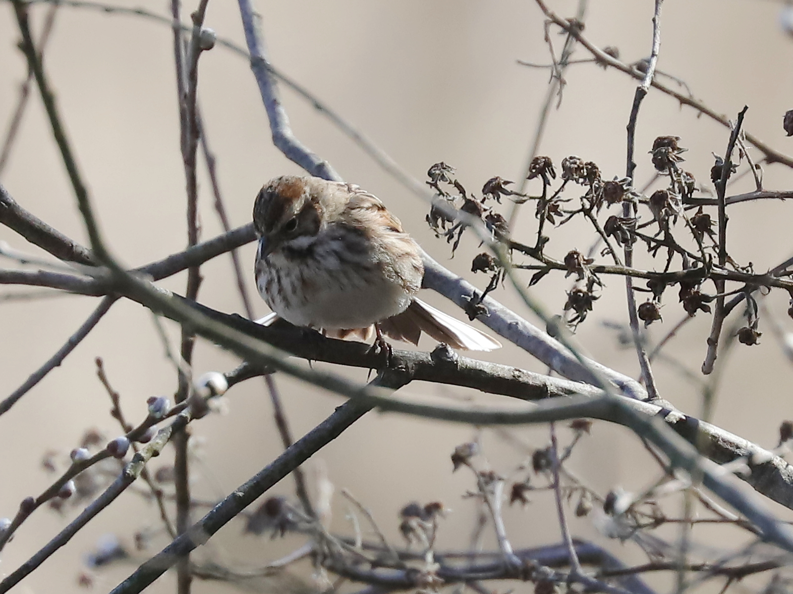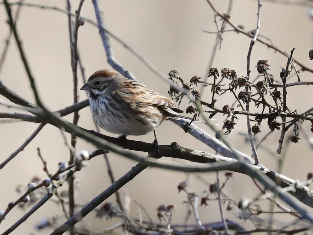 Un petit passereau fait son retour sur les rives du Léman pour la saison de nidification, le Bruant des roseaux Emberiza schoeniclus, ici une femelle.