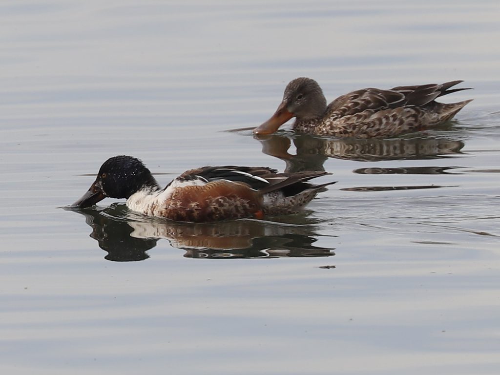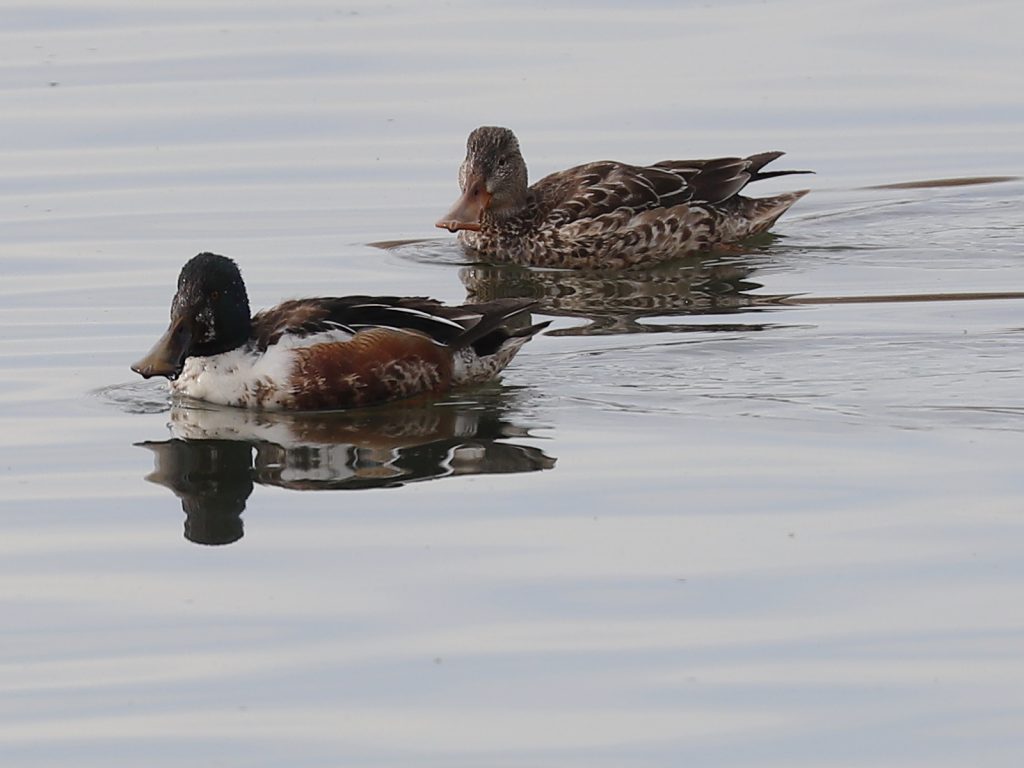 Un autre canard, particulier par la largeur de son bec et sa façon de se nourrir en en bougeant la tête de droite et de gauche juste à la surface de l’eau, a aussi pris ses couleurs nuptiales. C’est le Canard souchet Spatula clypeata.