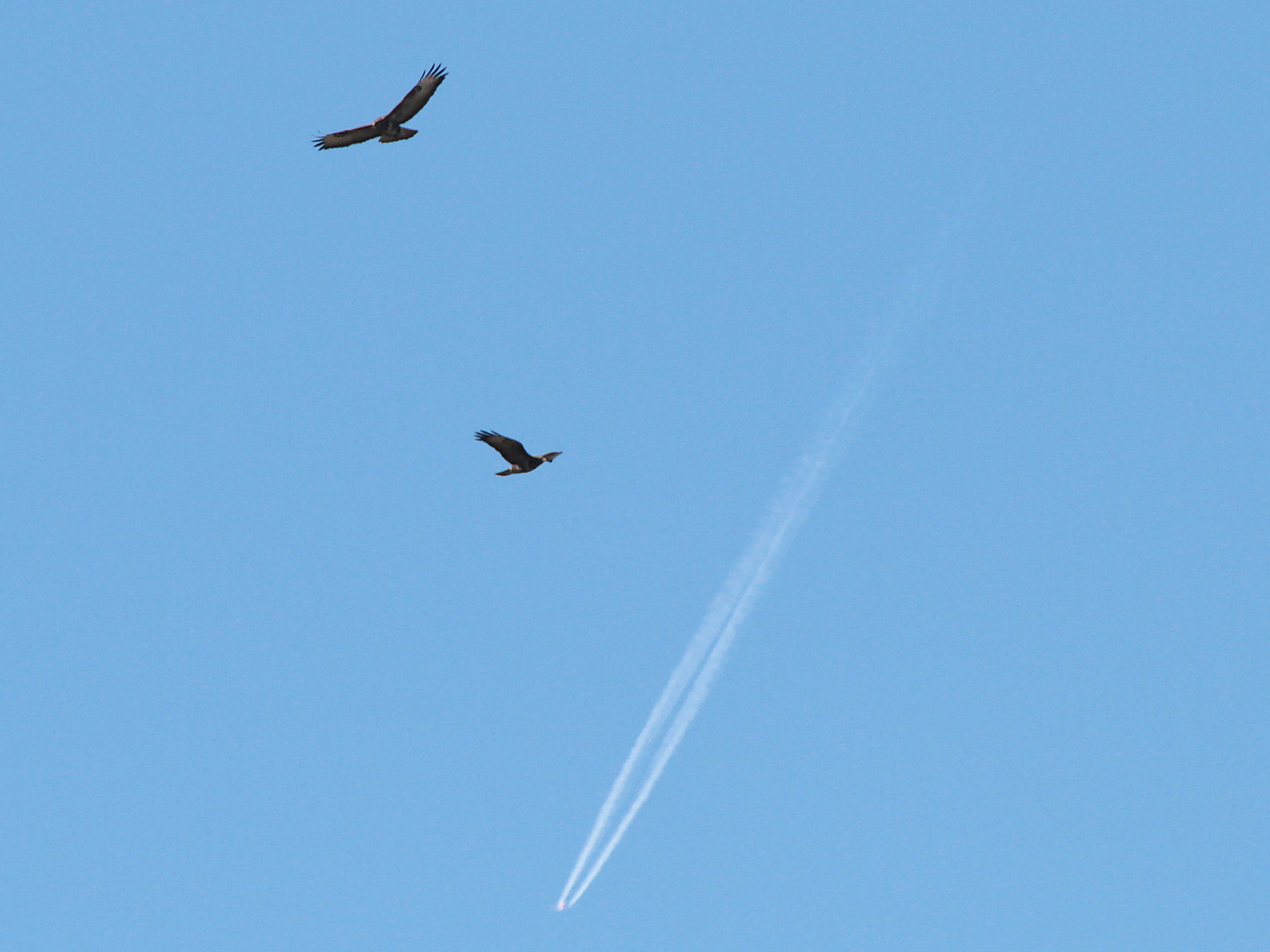 La confusion entre l’Epervier d’Europe (au-dessus) et l’Autour des palombes (au-dessous) est possible. La distinction se fait surtout à la largeur des hanches.