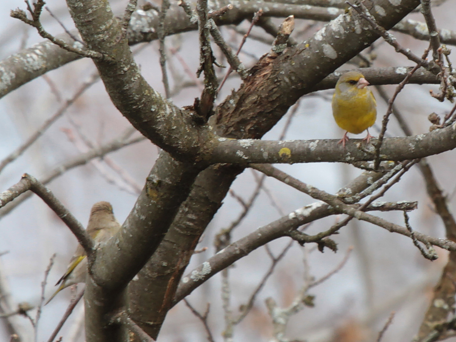 Un Verdier d’Europe, mâle, et la femelle plus discrète en arrière-plan.