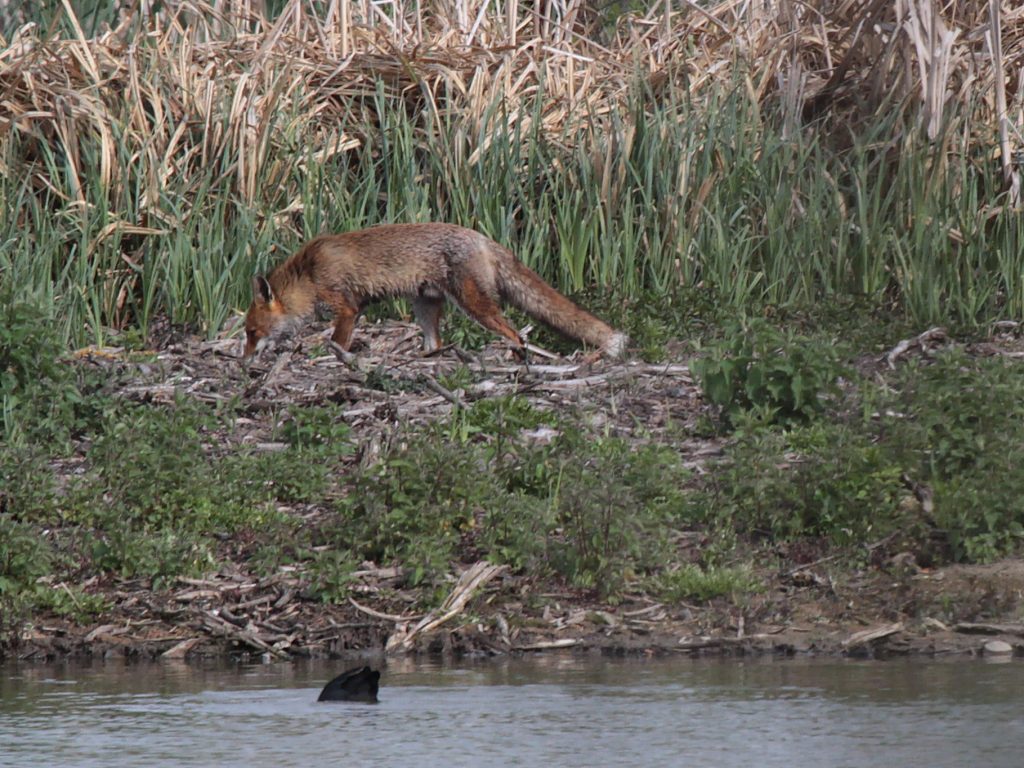 Le renard est tout d’abord passé sur la rive de l’étang, assez loin derrière le dortoir du bihoreau. C’était donc une surprise pour moi d’en retrouver un (le même ?) en contournant un bosquet plus loin dans la zone de réserve du Creux de terre. Il -ou elle- était en compagnie de quatre renardeaux. Même en me plaquant rapidement au sol, j’ai tout de suite été repéré : l’adulte s’est éloigné en terrain ouvert à l’opposé de la haie dans laquelle les renardeaux ont battu en retraite. J’étais tout de même une source de curiosité et deux des jeunes sont ressortis quelques instants pour humer l’air dans ma direction avant de retourner sagement à l’abri de leur haie.