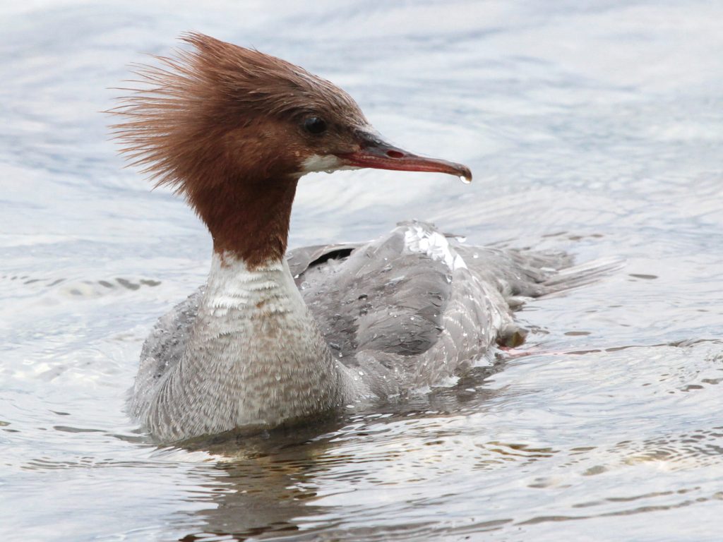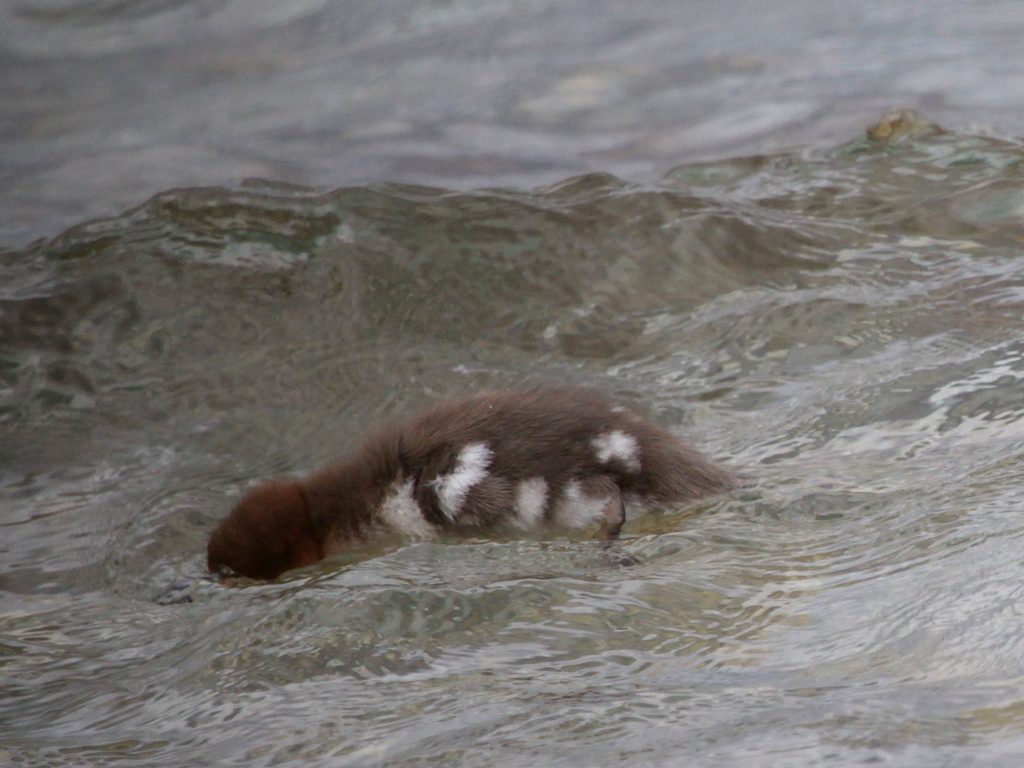 La femelle de Harle bièvre, photographiée il y a dix jours à la cime d’un châtaignier montre où ces canards vont nicher. Dès que les cannetons sont éclos, la femelle les descend au lac, soit sur son dos soit en les poussant dans un ruisseau. Les petis sont immédiatement actifs à la recherche de proies avec la même technique que les adultes : vigoureux coups de palmes pour avancer, avec la tête sous l’eau. Mais si le courant est trop fort, s’il y a un risque quelconque ou s’il y a un peu de fatigue, hop, les petits grimpent à nouveau sur le dos de la mère.