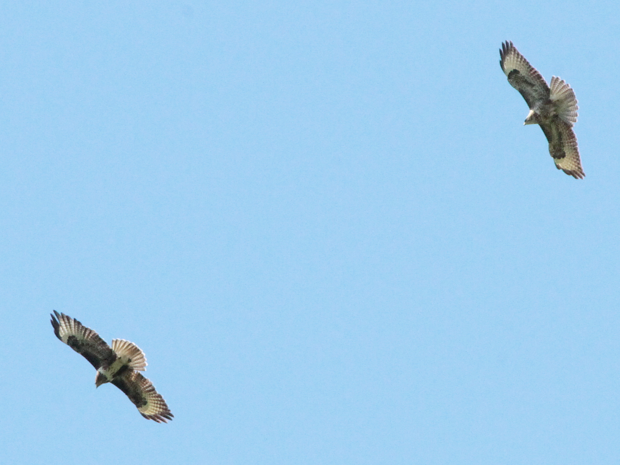 La preuve que la Buse variable porte bien son nom est ici : deux plumages assez différents sur le corps. L’absence de barre noire terminale sur la queue indiquerait des individus pas encore adultes. je vais en demander confirmation.