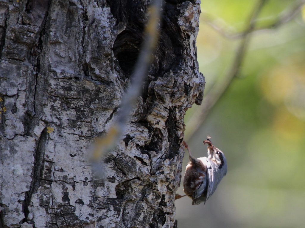 Un autre nid, de Sittelle torchepot. Les poussins ne sont pas encore visibles, sur la deuxième photo, c’est un adulte qui contrôle s’il peut sortir sans risque. La preuve qu’il y a des poussins, c’est bien sûr que les adultes entrent avec des proies dans le bec mais aussi qu’ils sortent avec un sac fécal (photo 3). Les déjections des poussins sont enveloppées de mucus, que les adultes peuvent évacuer facilement pour maintenir le nid propre.