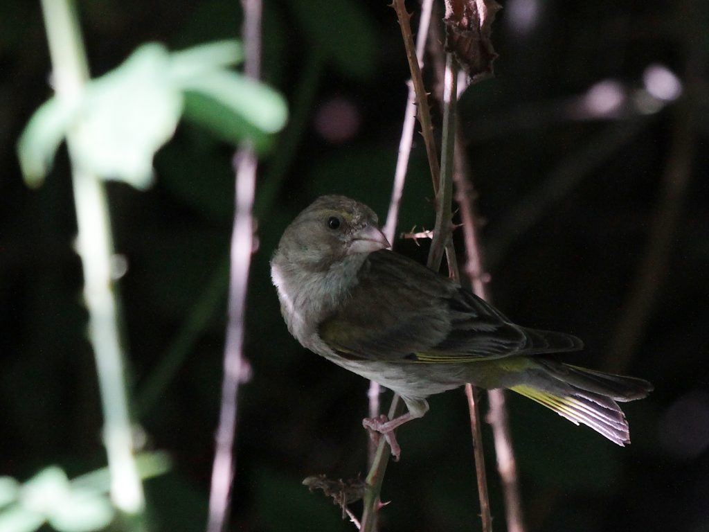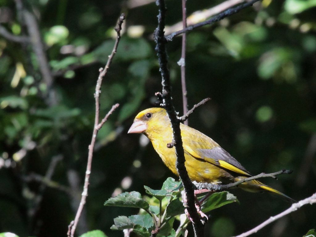 … des verdiers d’Europe, femelle à gauche et trois mâles dont le premier très coloré …