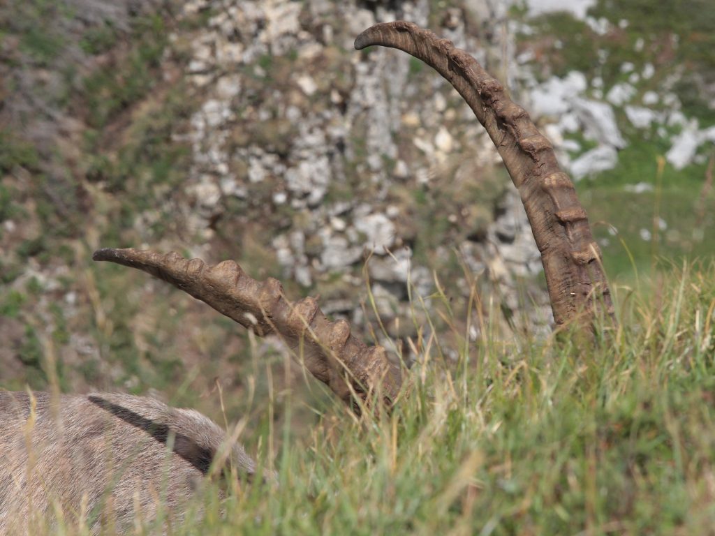 Et la fin est réservée aux bouquetins. Nous avons pris nos casse-croûtes respectifs à quelques mètres les uns des autres. Au début, ils étaient à mes pieds car j’avais grimpé au-dessus de la falaise où j’avais vu le premier mâle (par un passage facile pour le piéton moyen, je n’approche même pas les passages des bouquetins). Ensuite, ils m’ont contourné et sont passés à quelques mètres au dessus de moi. Il y avait cinq grands mâles et ainsi que quelques femelles et des jeunes plus loin.