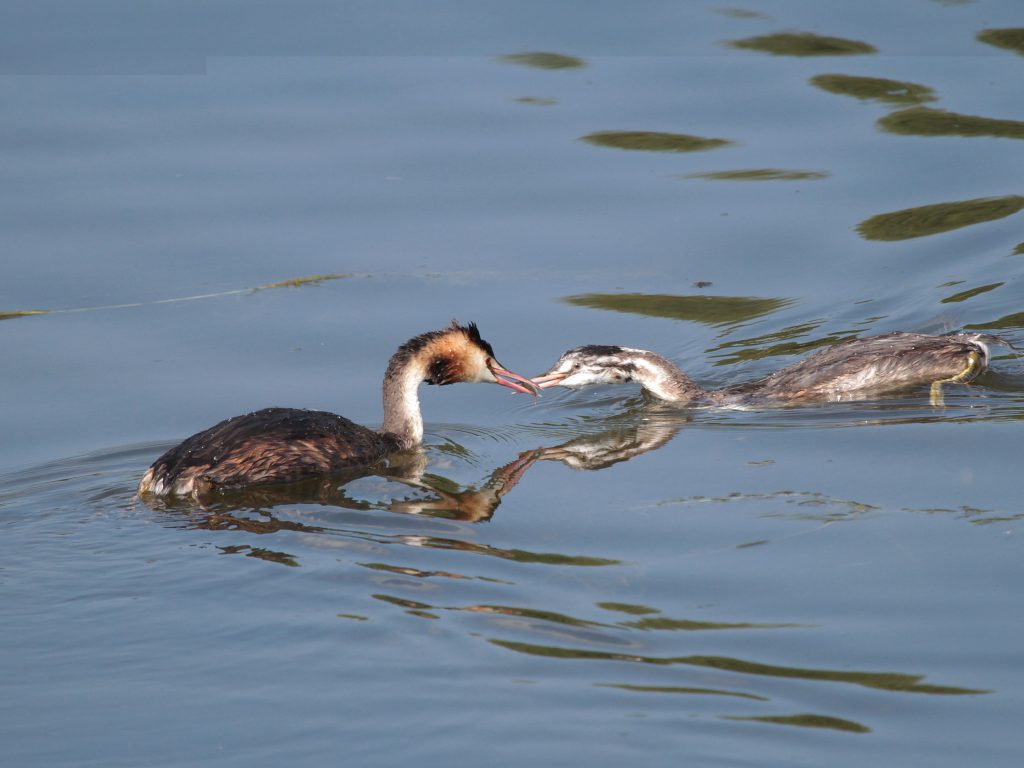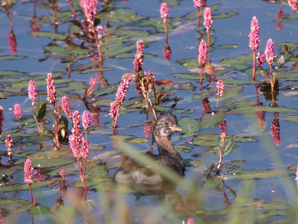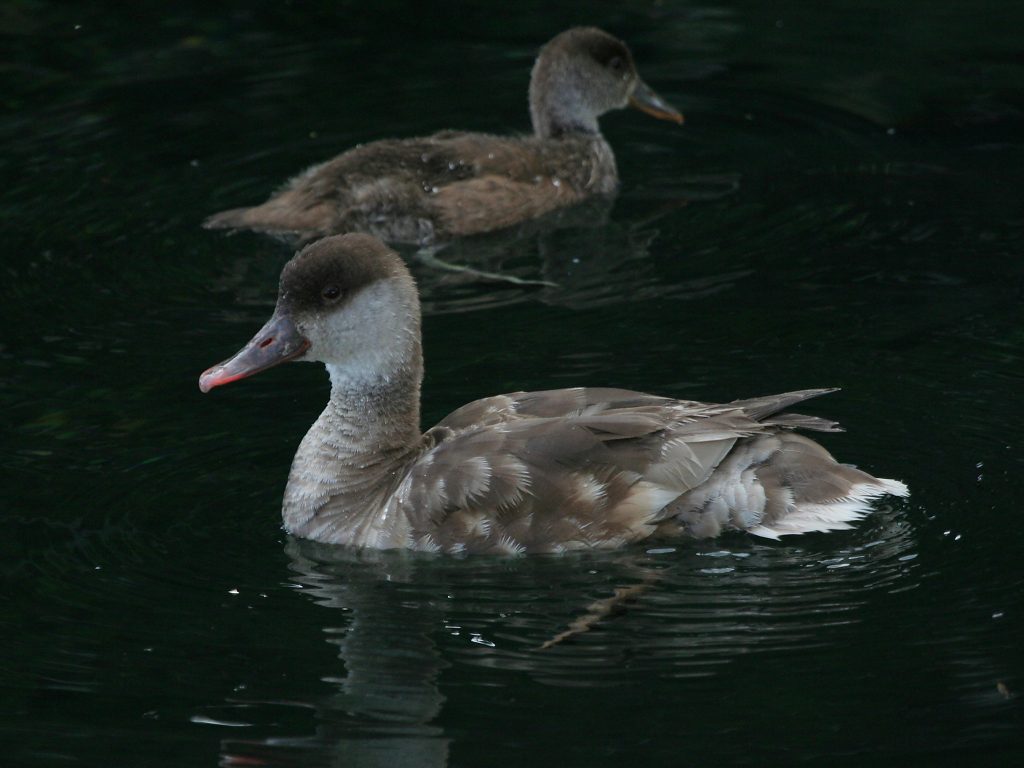 La Nette rousse, ici une femelle avec un de ses petits est « vegan », se nourrissant d’herbes aquatiques. Elle reste donc la plupart du temps dans l’eau et n’a pas besoin de se poser sur les rives.