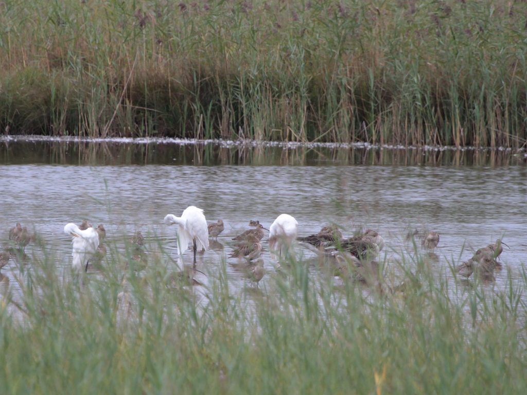 Trois Grandes aigrettes parmi des Courlis cendrés