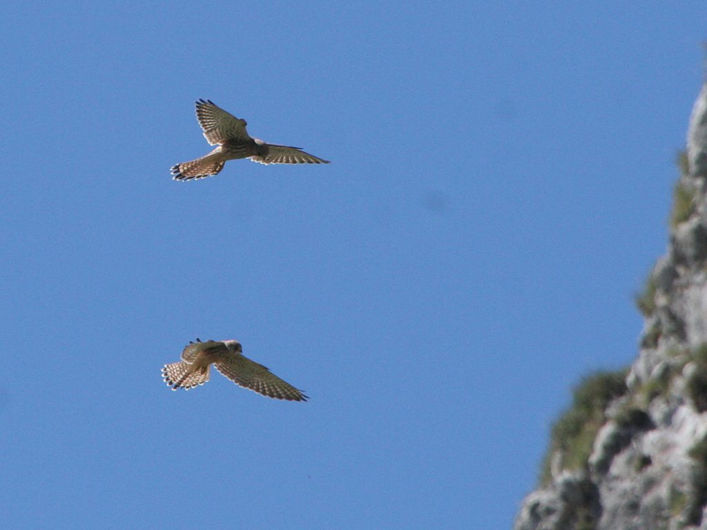 … ou le Faucon crécerelle. il capture des insectes au vol ou au sol mais il chasse aussi des petits rongeurs ou des petits batraciens. Le premier est un individu de plaine et les autres photos ont été prises en montagne, vers 1900-2000 m d’altitude. La spécialité du Faucon crécerelle est l’affut en vol sur-place, on parle de la position en Saint-Esprit. C’est la première fois que j’observe deux oiseaux le faire simultanément.