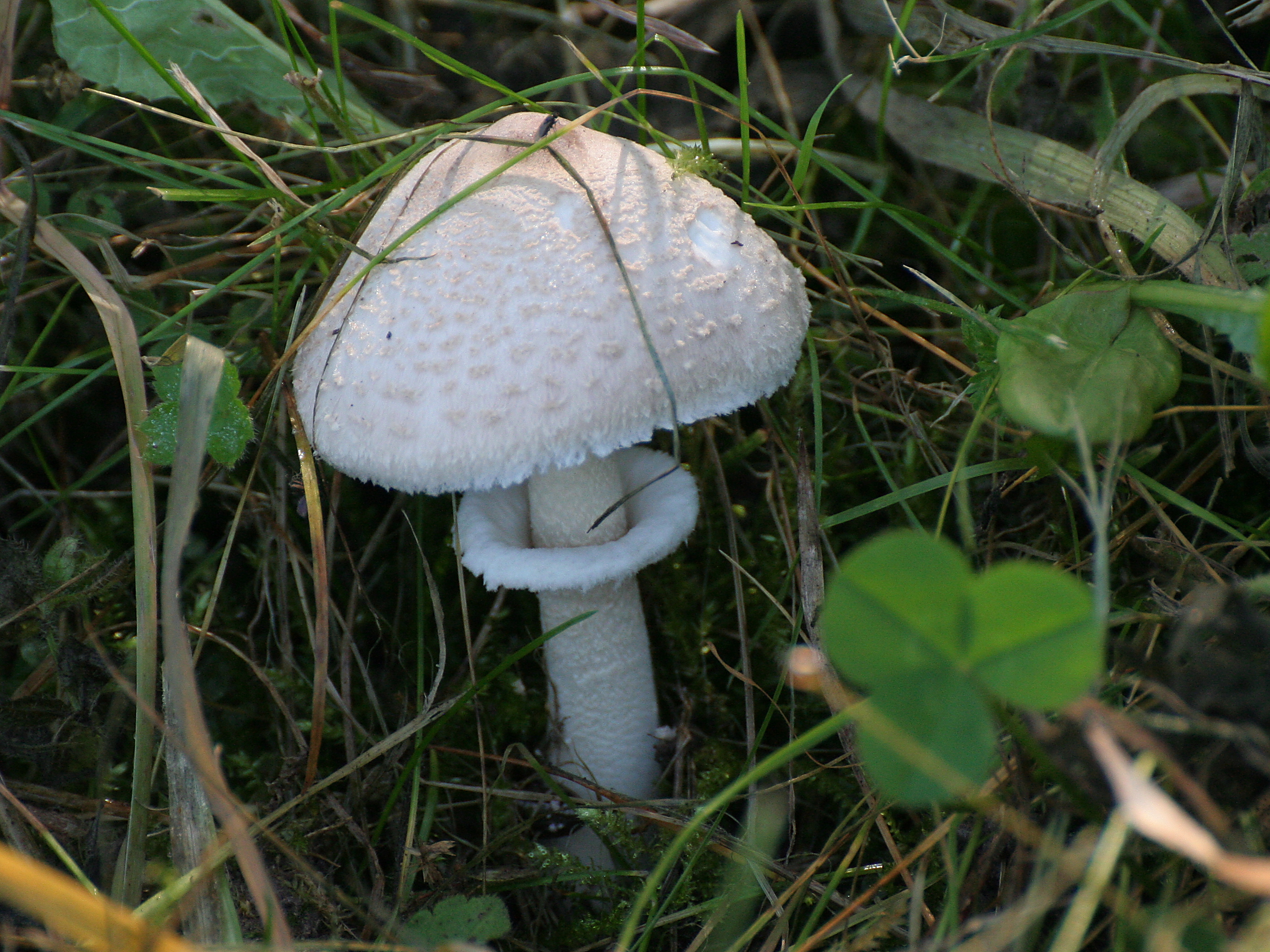 La lépiote, probablement la variété toxique dite brun-incarnat, apparaît en lisière de haie en profitant de l’humidité de la rosée.