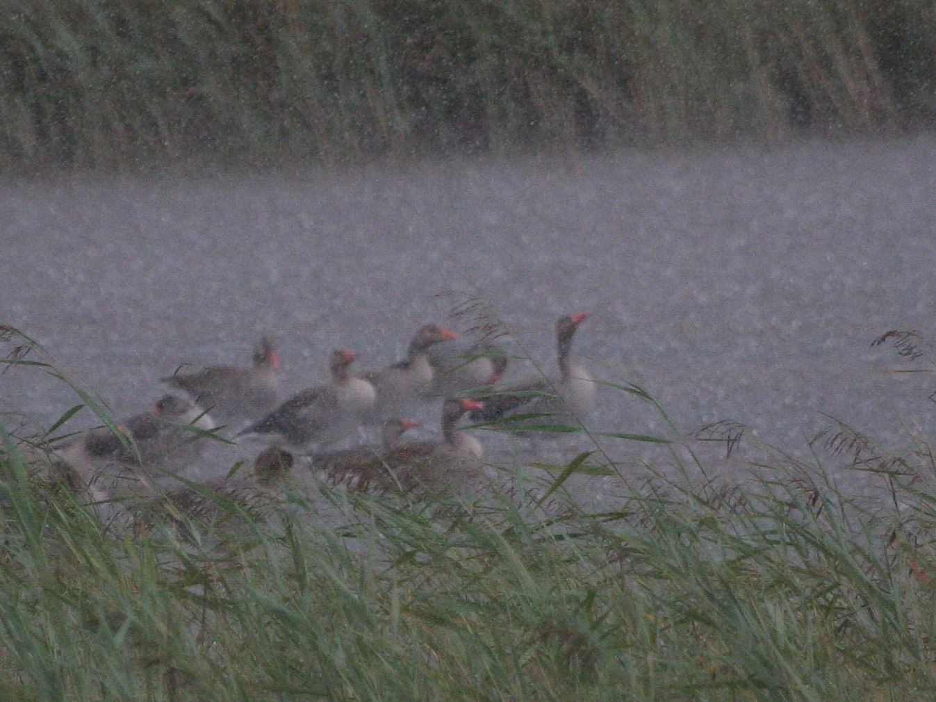 Et l’orage à éclaté, au sens propre, tambourinant sur la tête des Oies cendrées qui ont attendu stoïquement que l’averse passe (ce qui explique la grisaille de la photo). J’avais eu le temps de me réfugier sous un bout de toit couvrant très partiellement un observatoire.