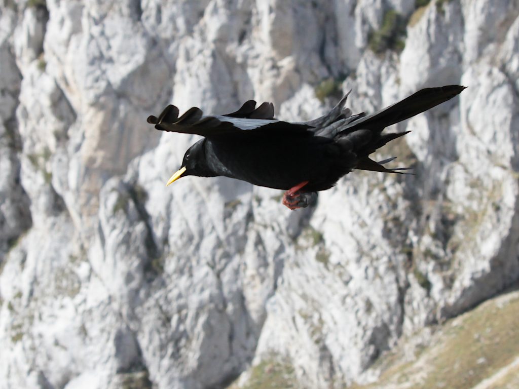 En montagne, les Chocards à bec jaune sont des oiseaux qui vivent en bandes bruyantes. Peu farouches, ils viennent près des randonneurs au moment du casse-crôute. J’en ai profité pour une photo en vol, prise avec un objectif de 55mm tellement l’oiseau était proche.