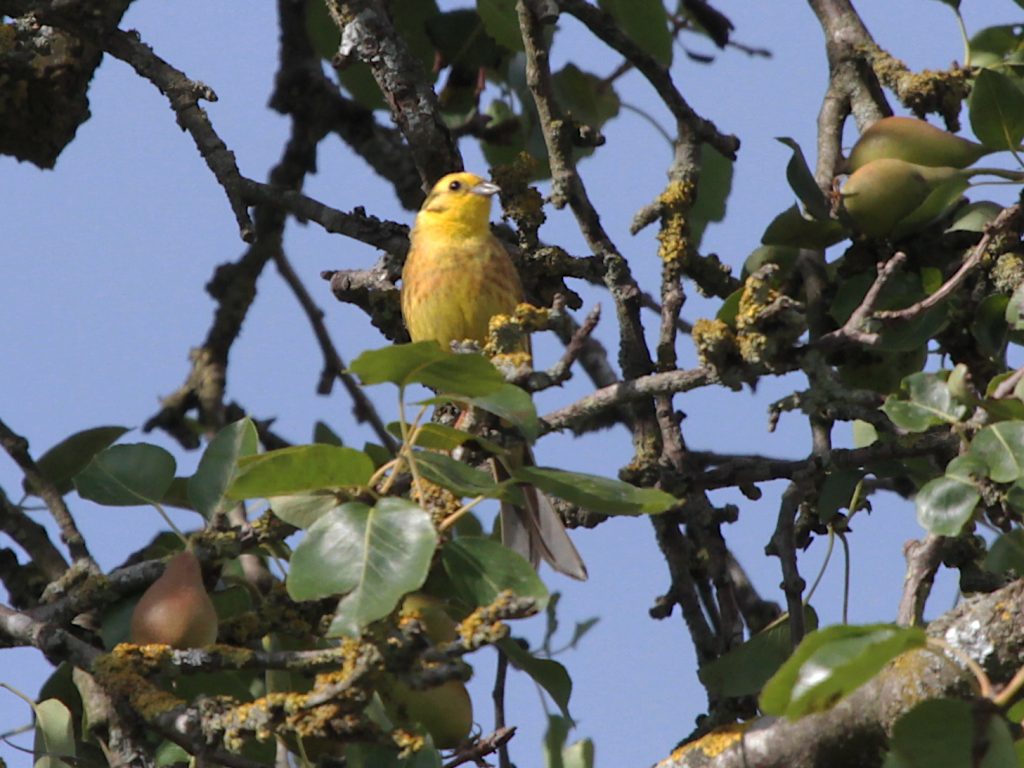 Et voici le Serin cini mâle adulte qui, malgré ses couleurs, est difficile à voir dans les arbres.