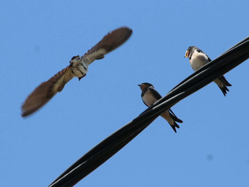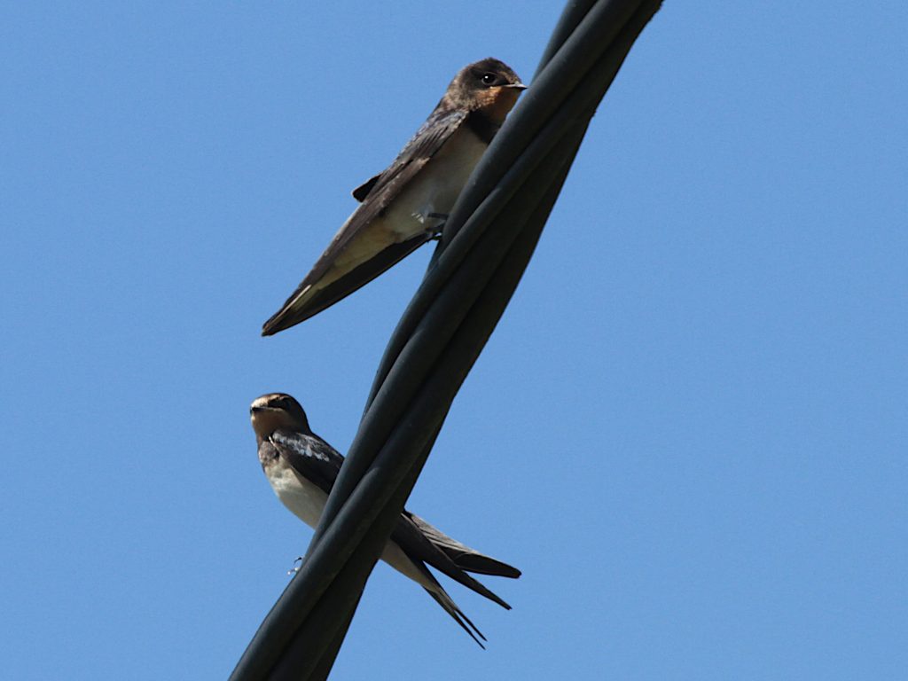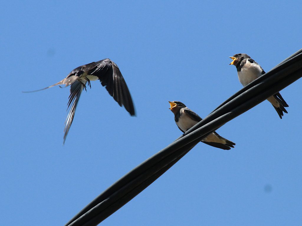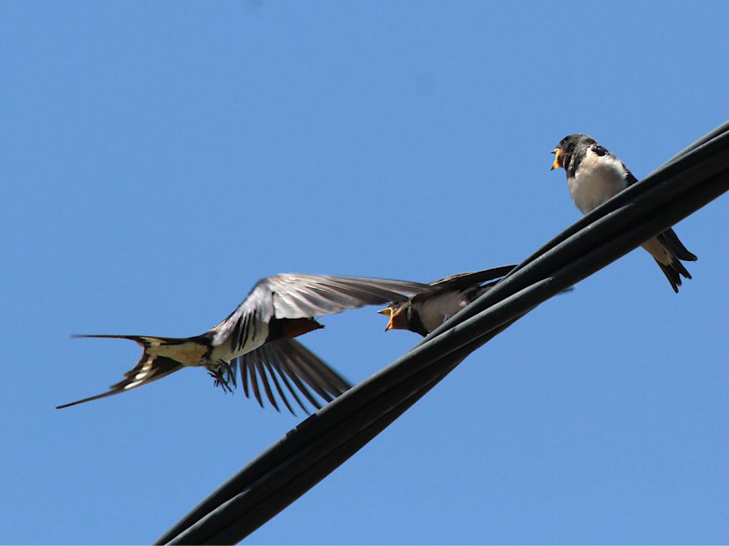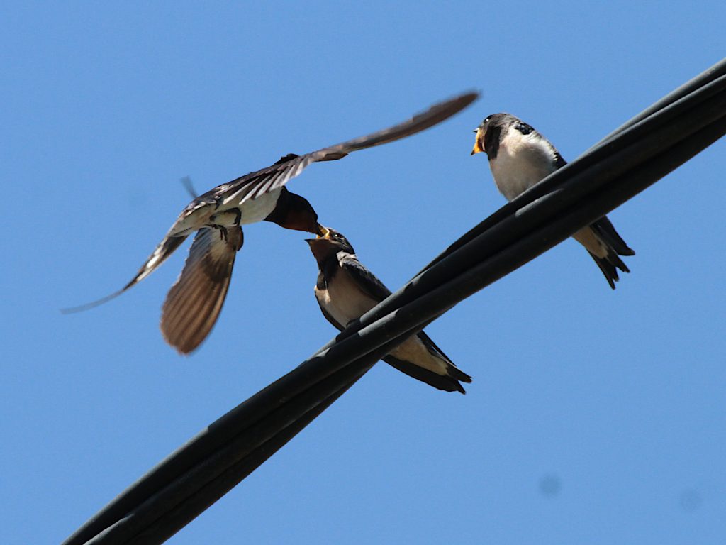 Les parents Hirondelles rustiques se donnent à fond pour leur progéniture, même quand les jeunes sont sortis du nid et sont capables de voler. Je suppose qu’il faut tout de même de l’entraînement avant de pouvoir passer sa journée en vol à chasser les insectes à grande vitesse.