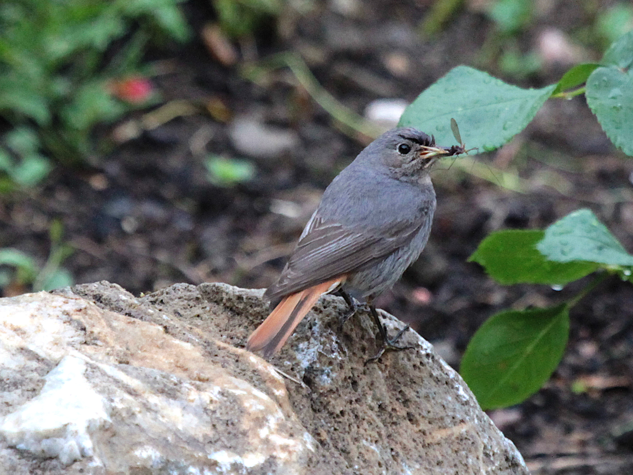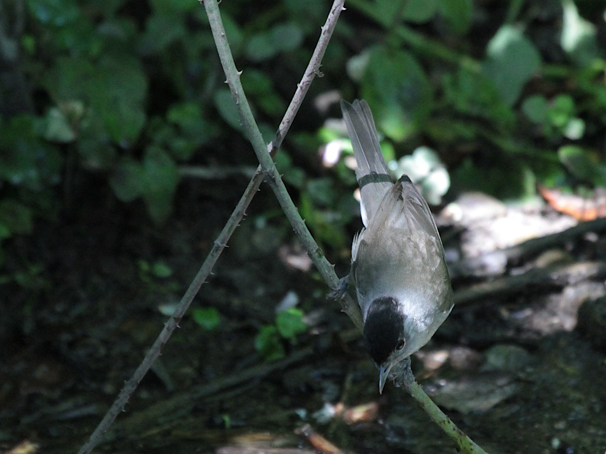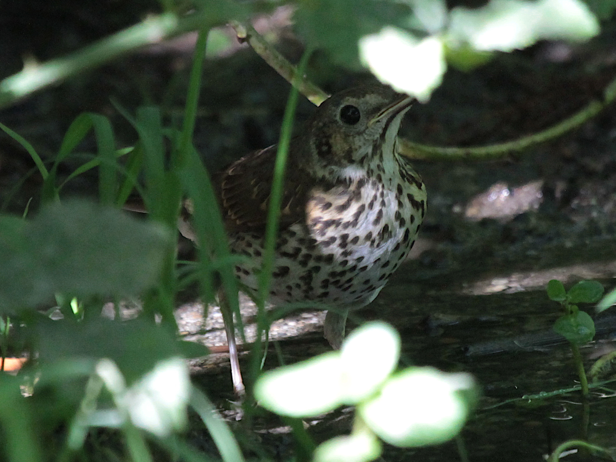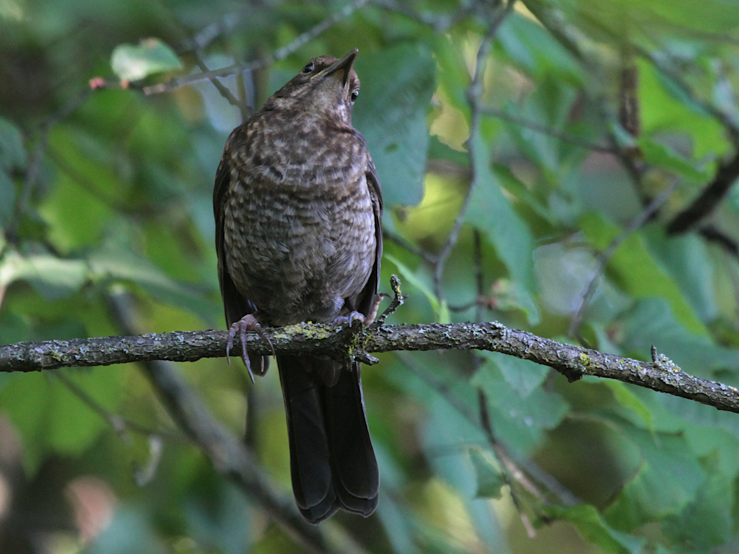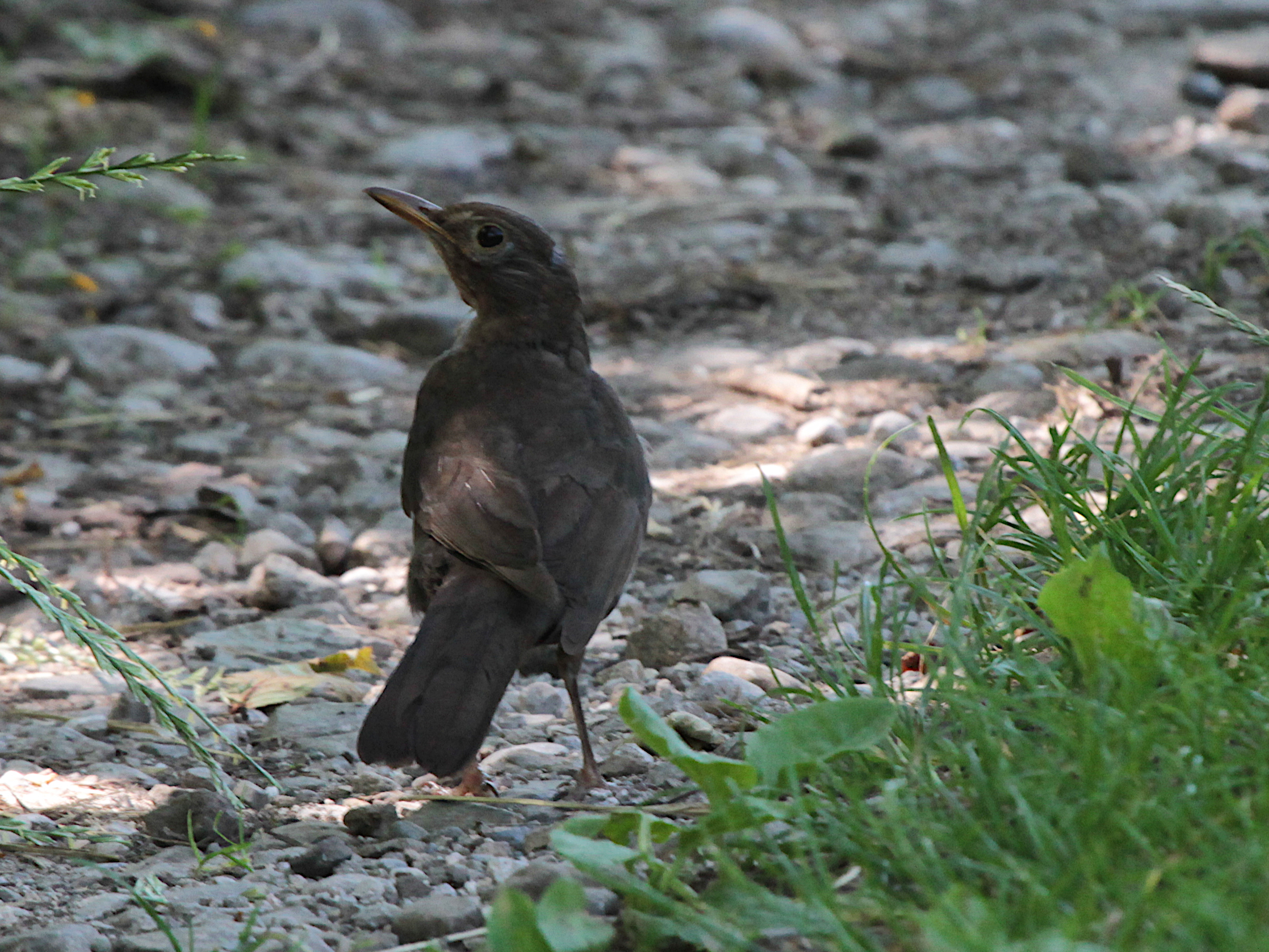 Le Merle noir, avec son plumage tacheté, est beaucoup moins farouche que les adultes et prend le temps d’apprécier si je constitue une menace ou non.