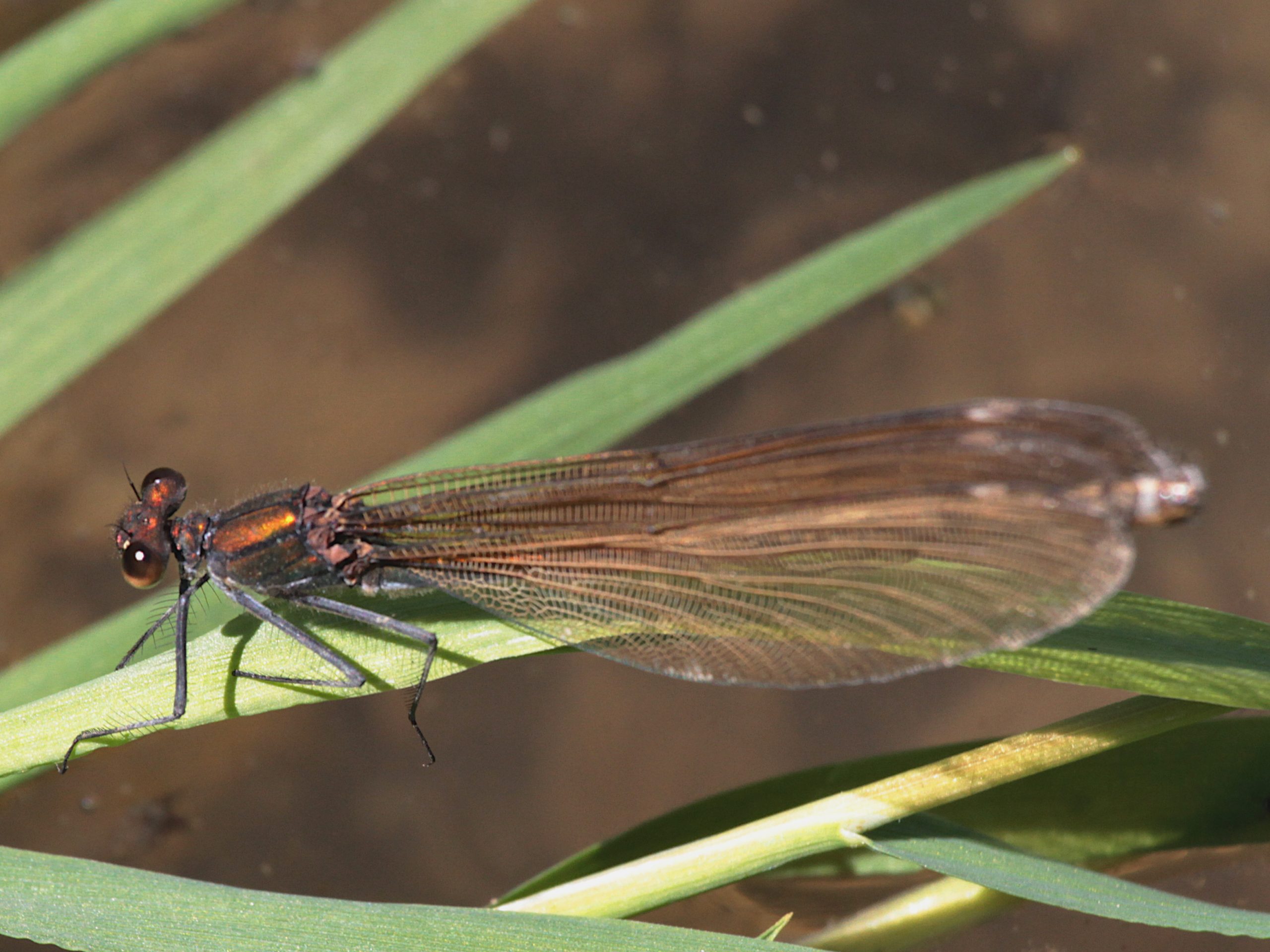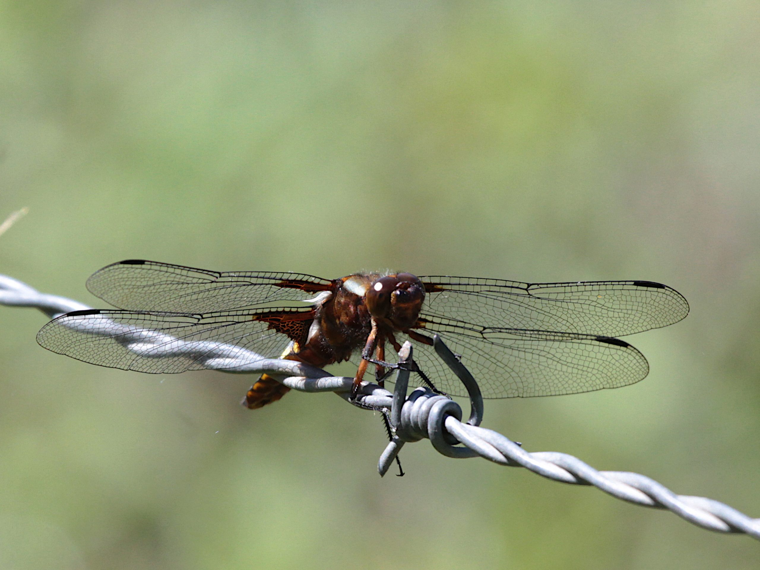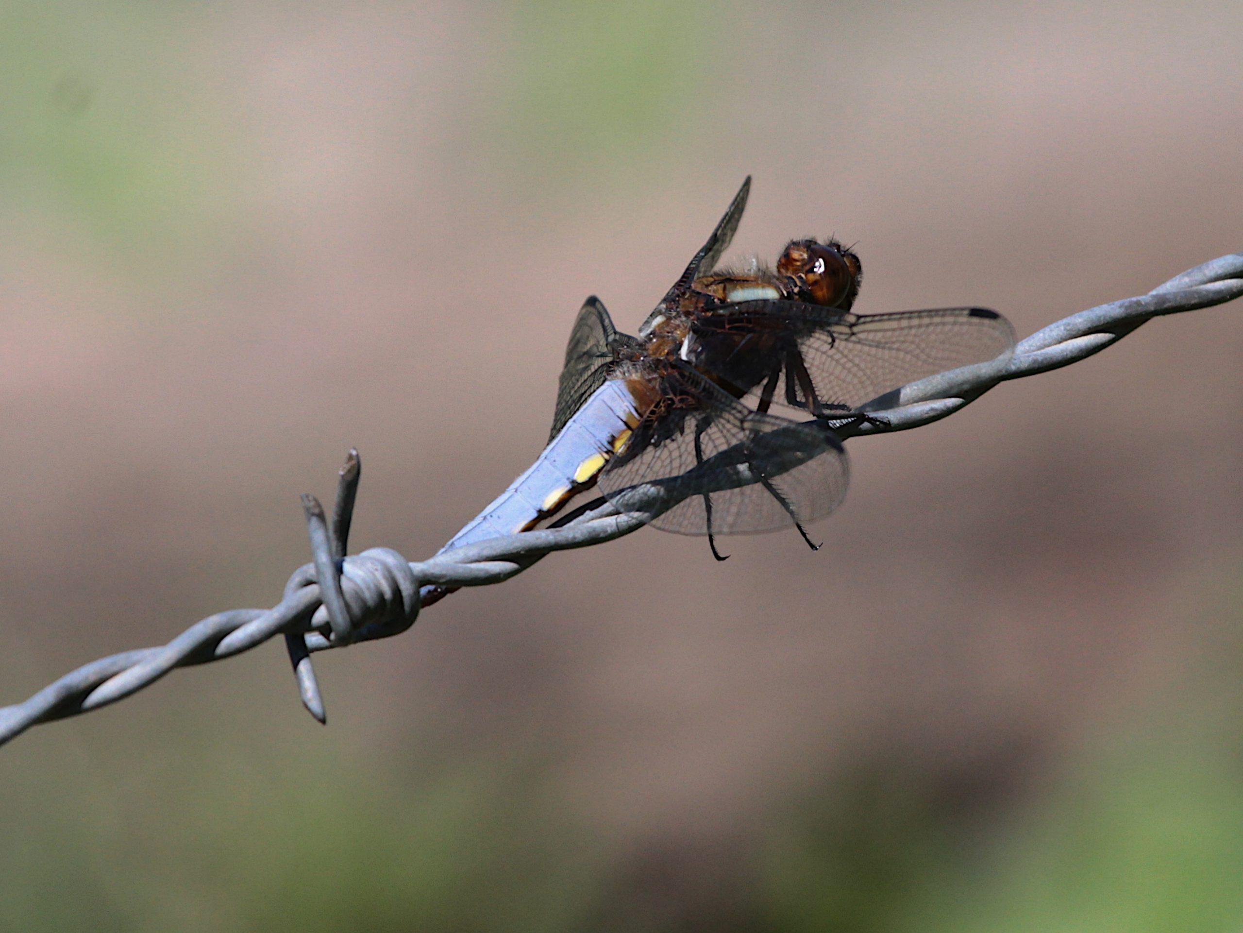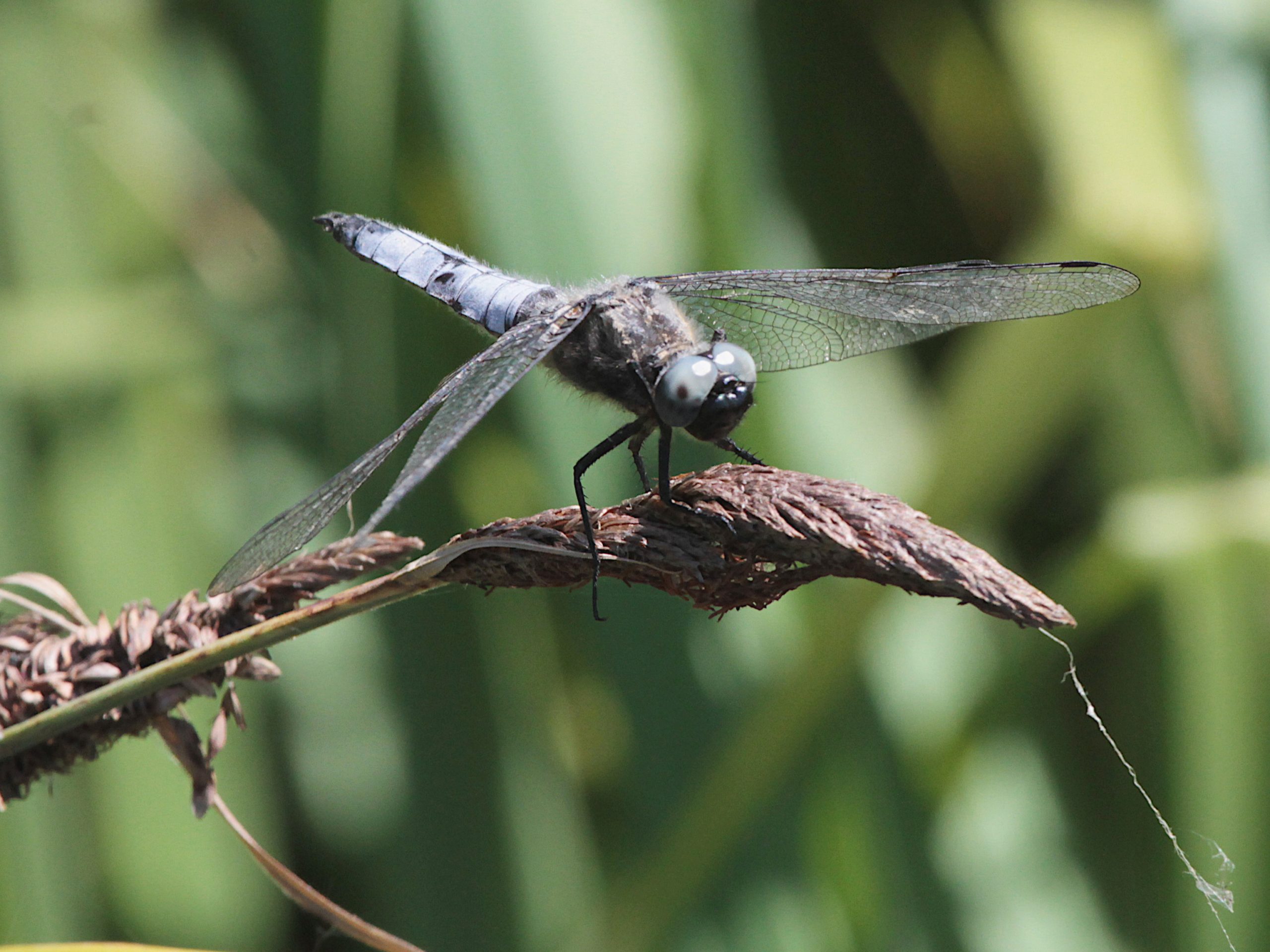 Et quelques libellules, pour terminer. L’Orthétrum brun (pour une fois, c’est la couleur de la femelle qui donne son nom à l’espèce) m’avait intrigué par deux petits machins noirs derrière les yeux. C’est grâce au gros plan que j’ai pu voir que cette libellule tient ses deux pattes avant repliées derrière la tête. Curieux !
