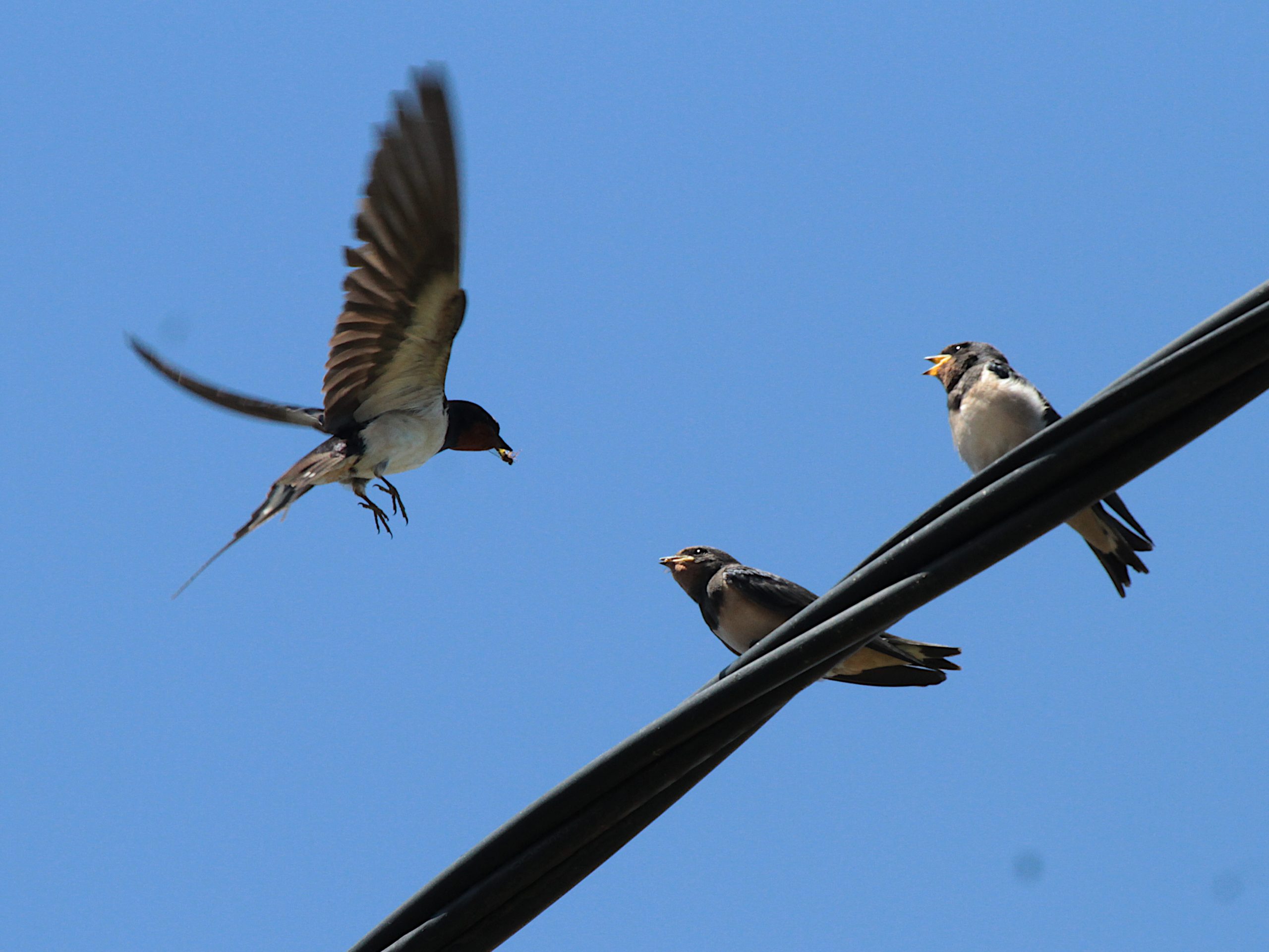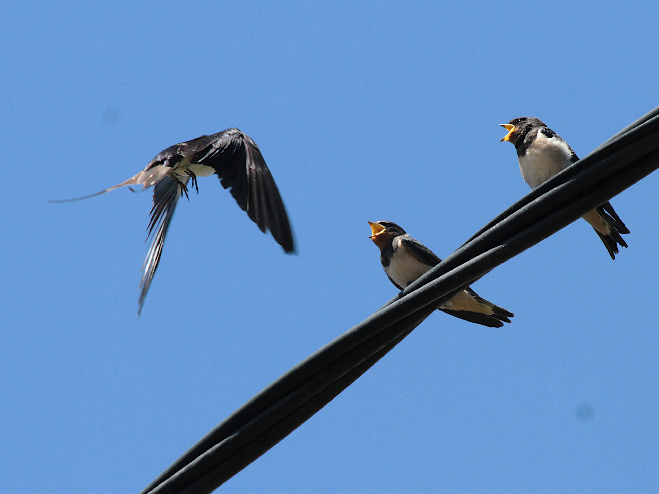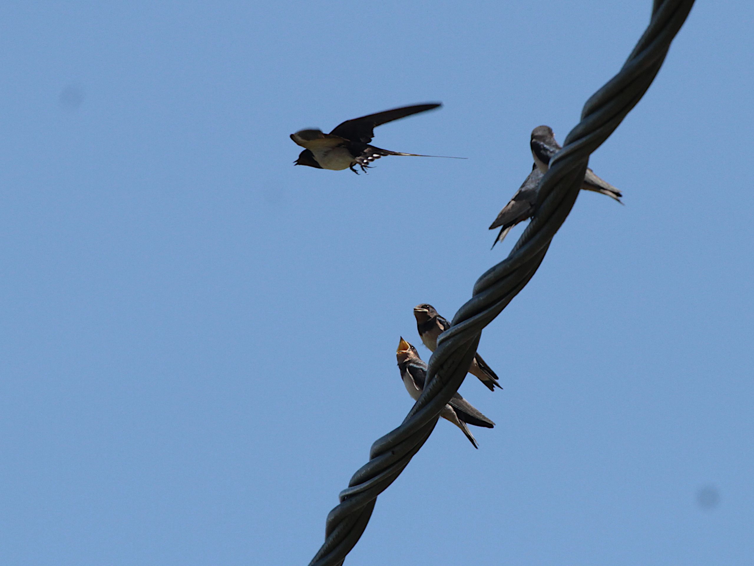 Les parents Hirondelles rustiques se donnent à fond pour leur progéniture, même quand les jeunes sont sortis du nid et sont capables de voler. Je suppose qu’il faut tout de même de l’entraînement avant de pouvoir passer sa journée en vol à chasser les insectes à grande vitesse.