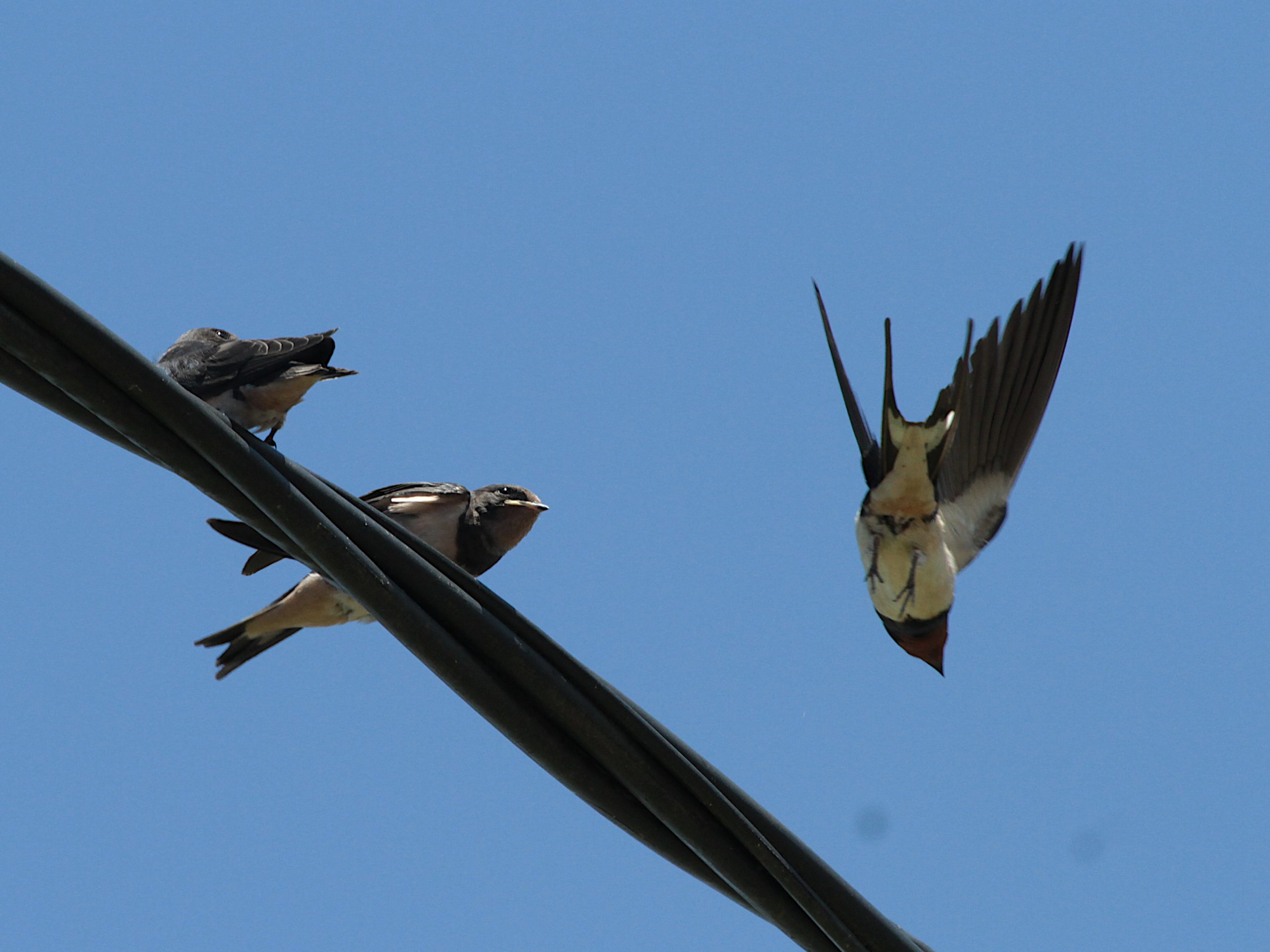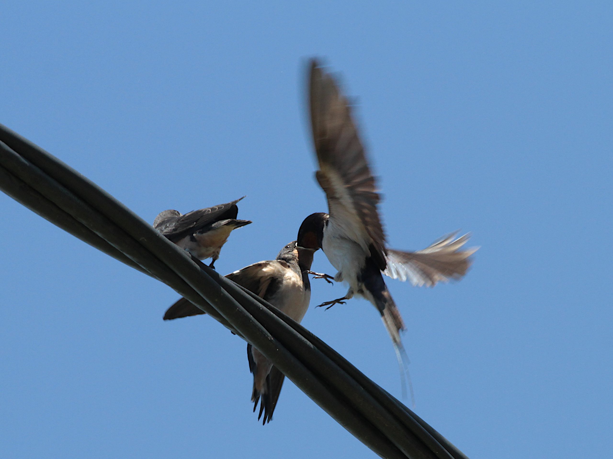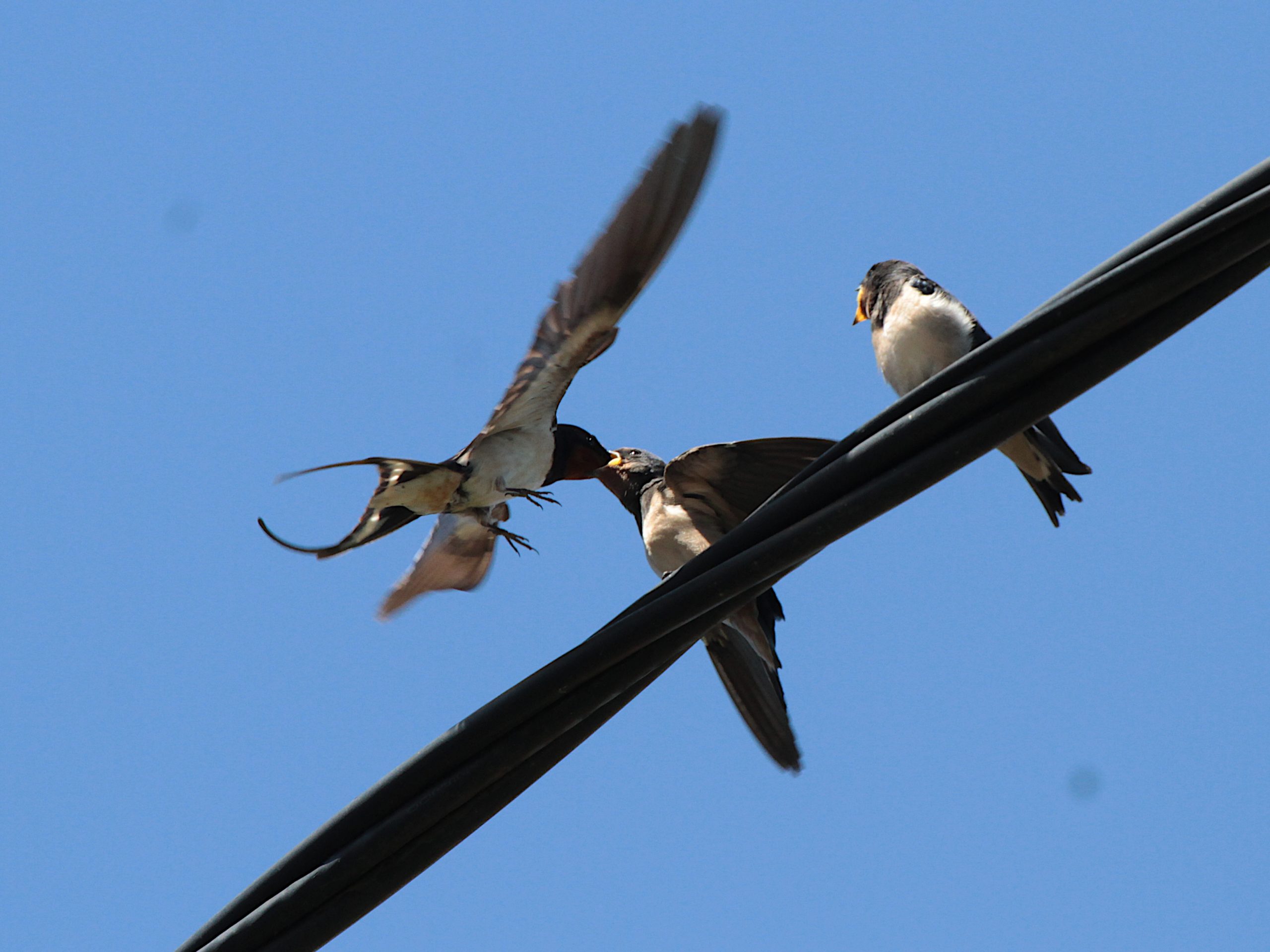 Les parents Hirondelles rustiques se donnent à fond pour leur progéniture, même quand les jeunes sont sortis du nid et sont capables de voler. Je suppose qu’il faut tout de même de l’entraînement avant de pouvoir passer sa journée en vol à chasser les insectes à grande vitesse.