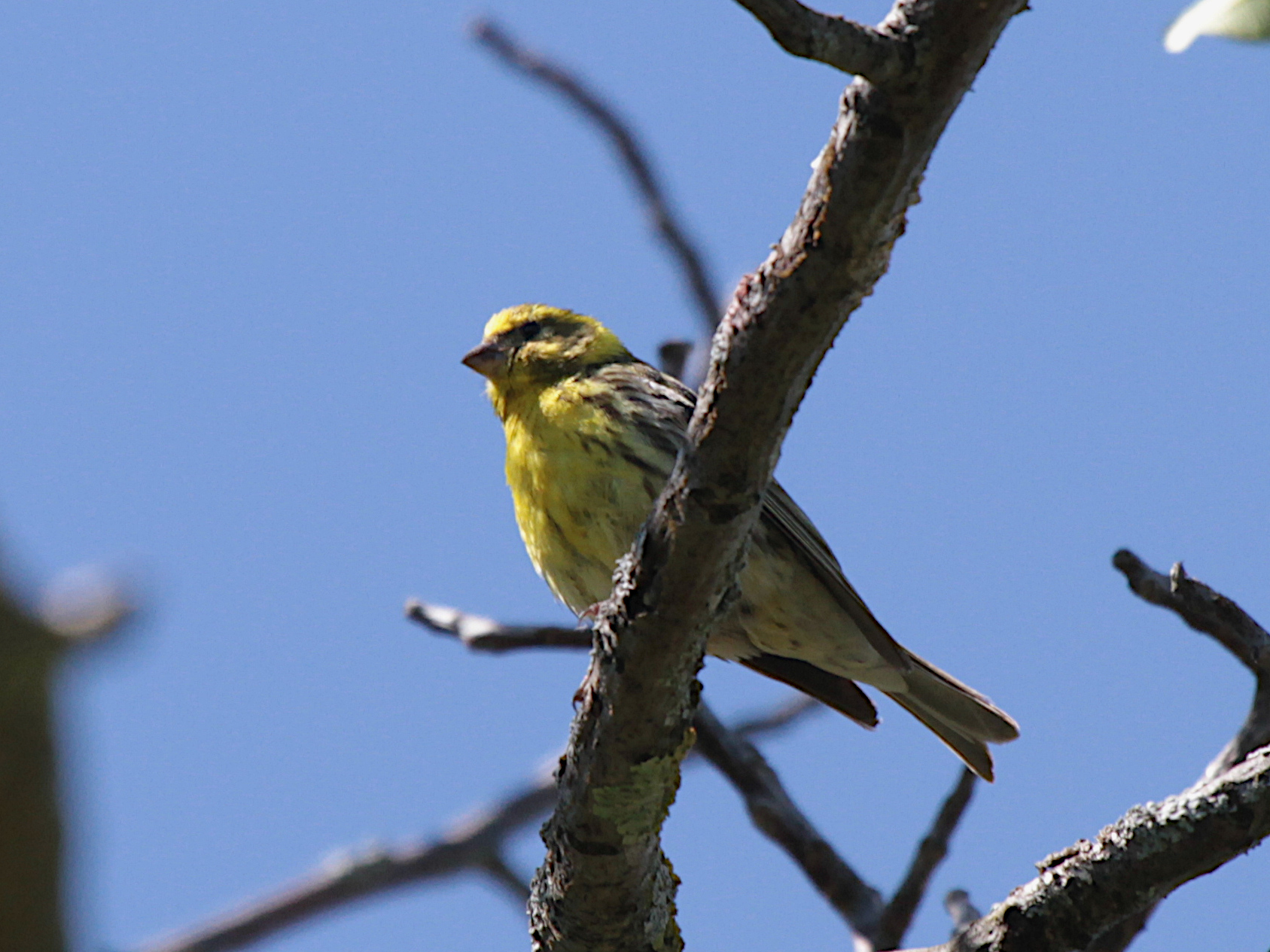 Et voici le Serin cini mâle adulte qui, malgré ses couleurs, est difficile à voir dans les arbres.