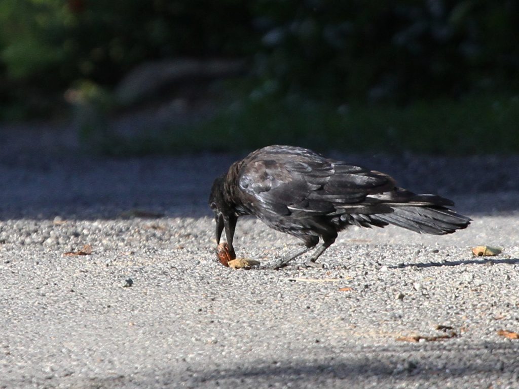 C’est la saison des noix, pour le régal des Corneilles noires. Encore faut-il ouvrir la coque. J’attendais pour voir si l’oiseau avait une technique particulière mais l’arrivée d’une voiture a mis fin à l’observation.