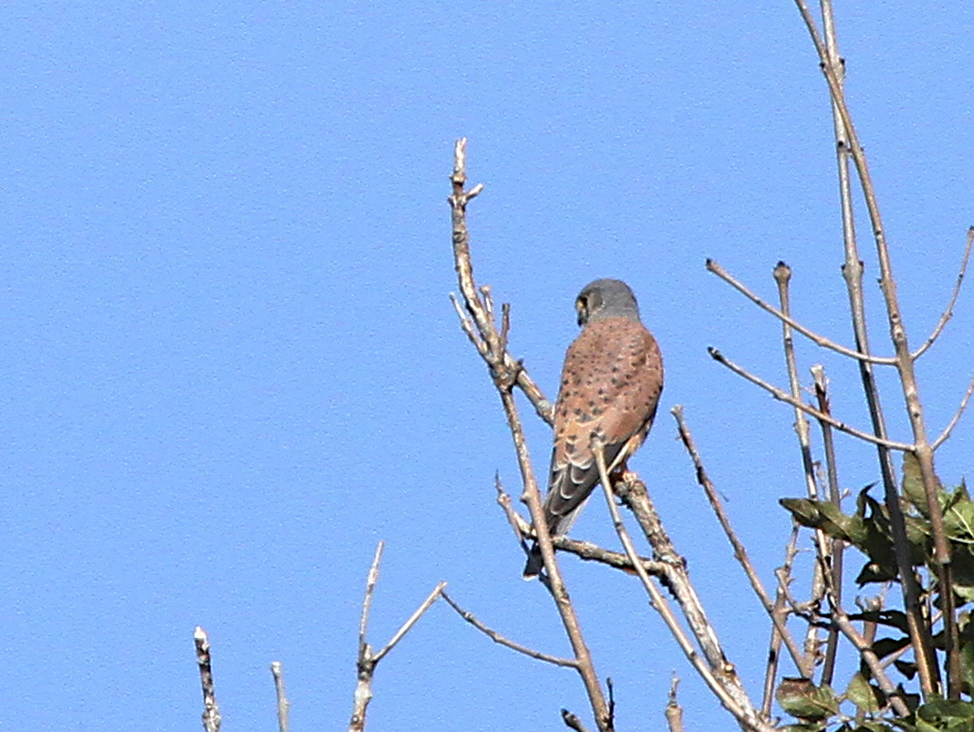 Pour revenir aux oiseaux, voici un mâle – tête grise – de Faucon crécerelle. Je prends souvent ma première photo à distance puis je me rapproche pour de meilleures images tant que l’oiseau ne bouge pas.