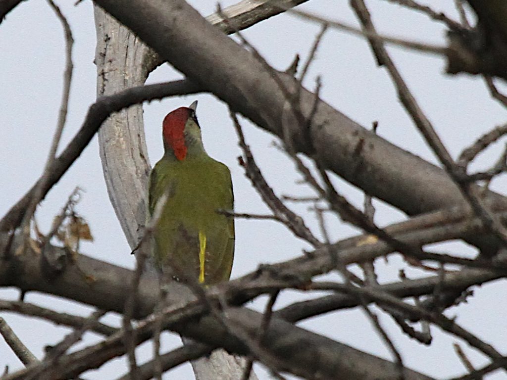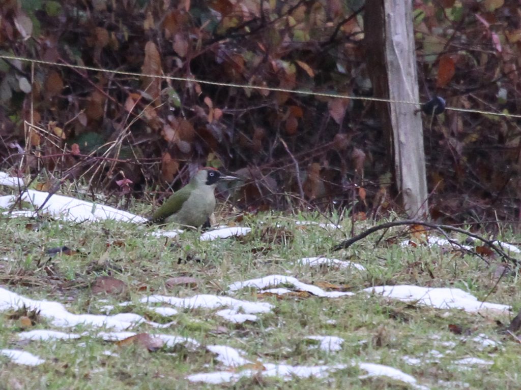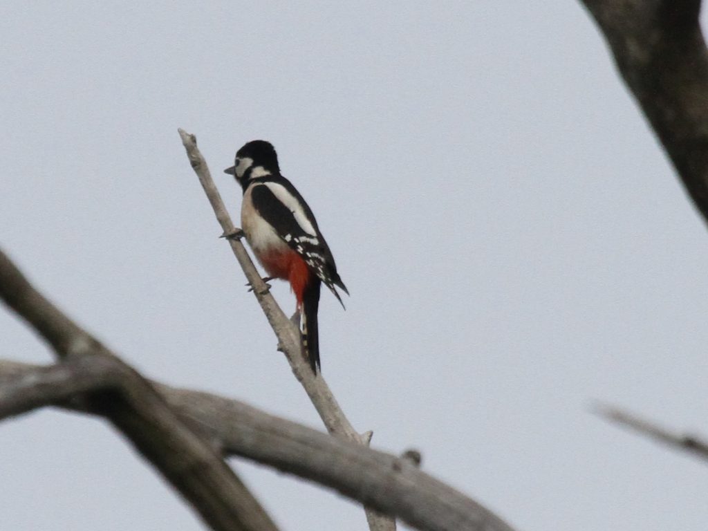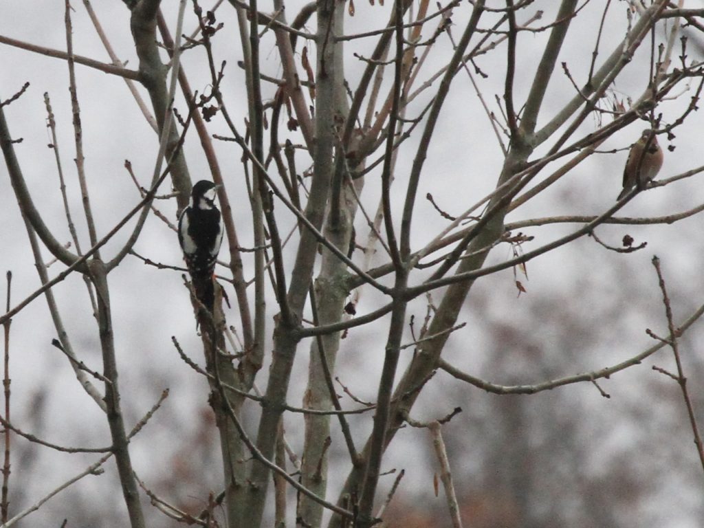 Le Pic mar au-dessus s’est séparé d’un petit groupe de Pics épeiche, ci-dessous, qui prospectait les arbres d’une haie. Le dernier oiseau est voisin d’un Pic vert, je n’ai pu obtenir de cliché des deux nets.