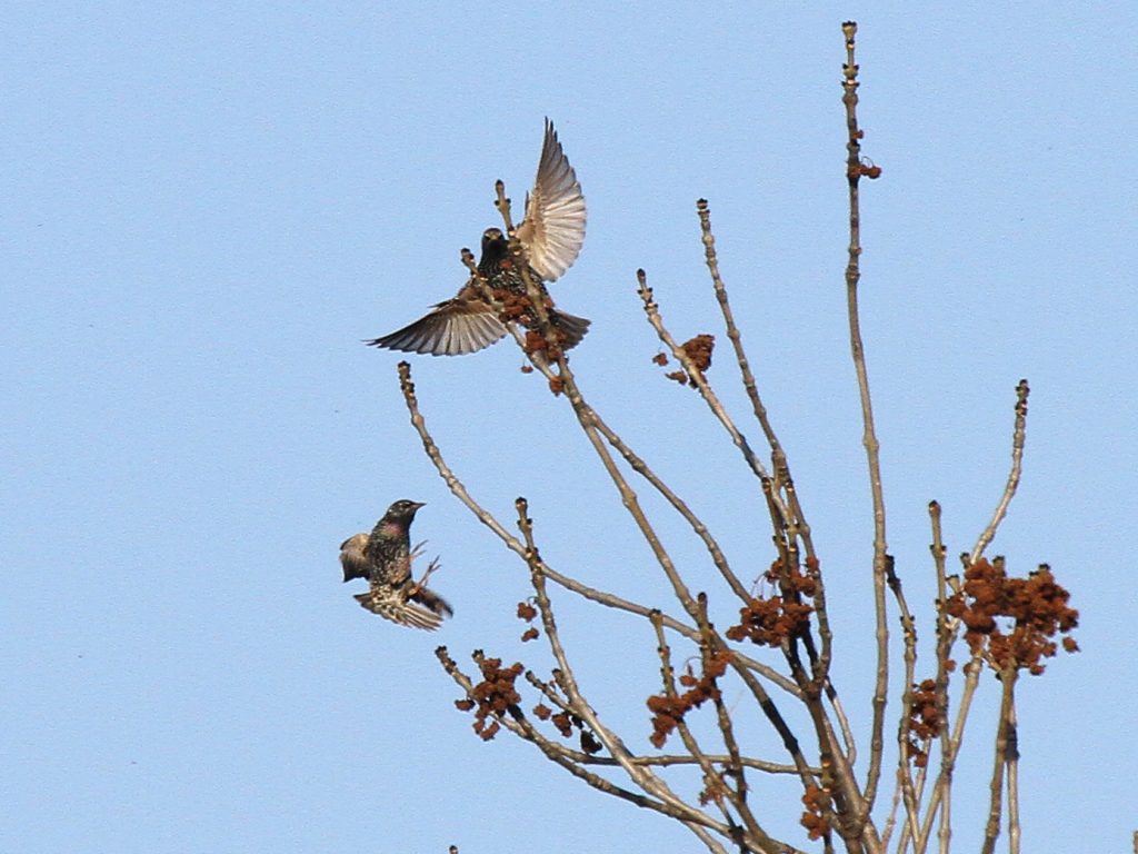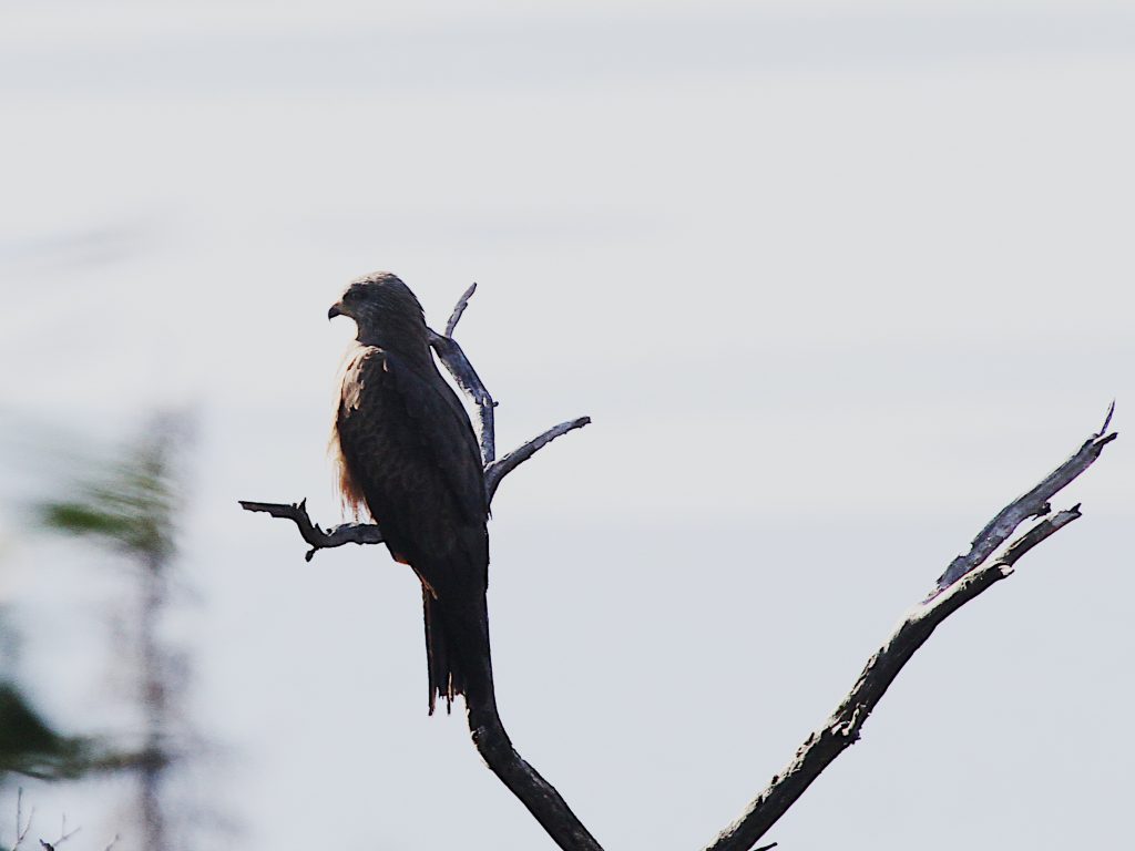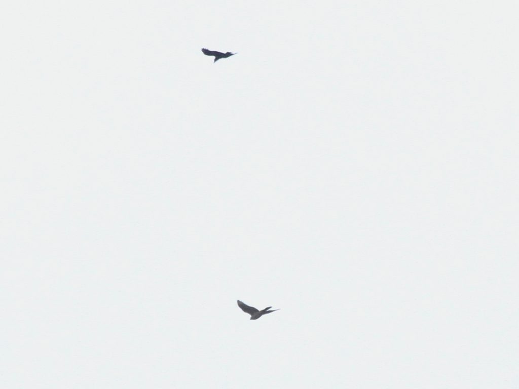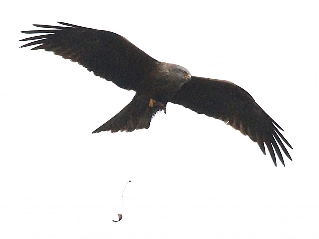 Le Milan noir passe aussi en grand nombre et certains des oiseaux « locaux » sont revenus sur leurs perchoirs préférés. Il est difficile d’affirmer que ce sont les mêmes oiseaux que l’an dernier, faute de signe distinctif, mais le comportement – utilisation d’une série de perchoirs, nuit passée auprès d’un ancien nid – donnent quelques indications. J’ai aussi vu, migrateur ou local je ne sais pas, un Milan noir se ravitailler en vol, sans réussir à identifier le casse-croûte.