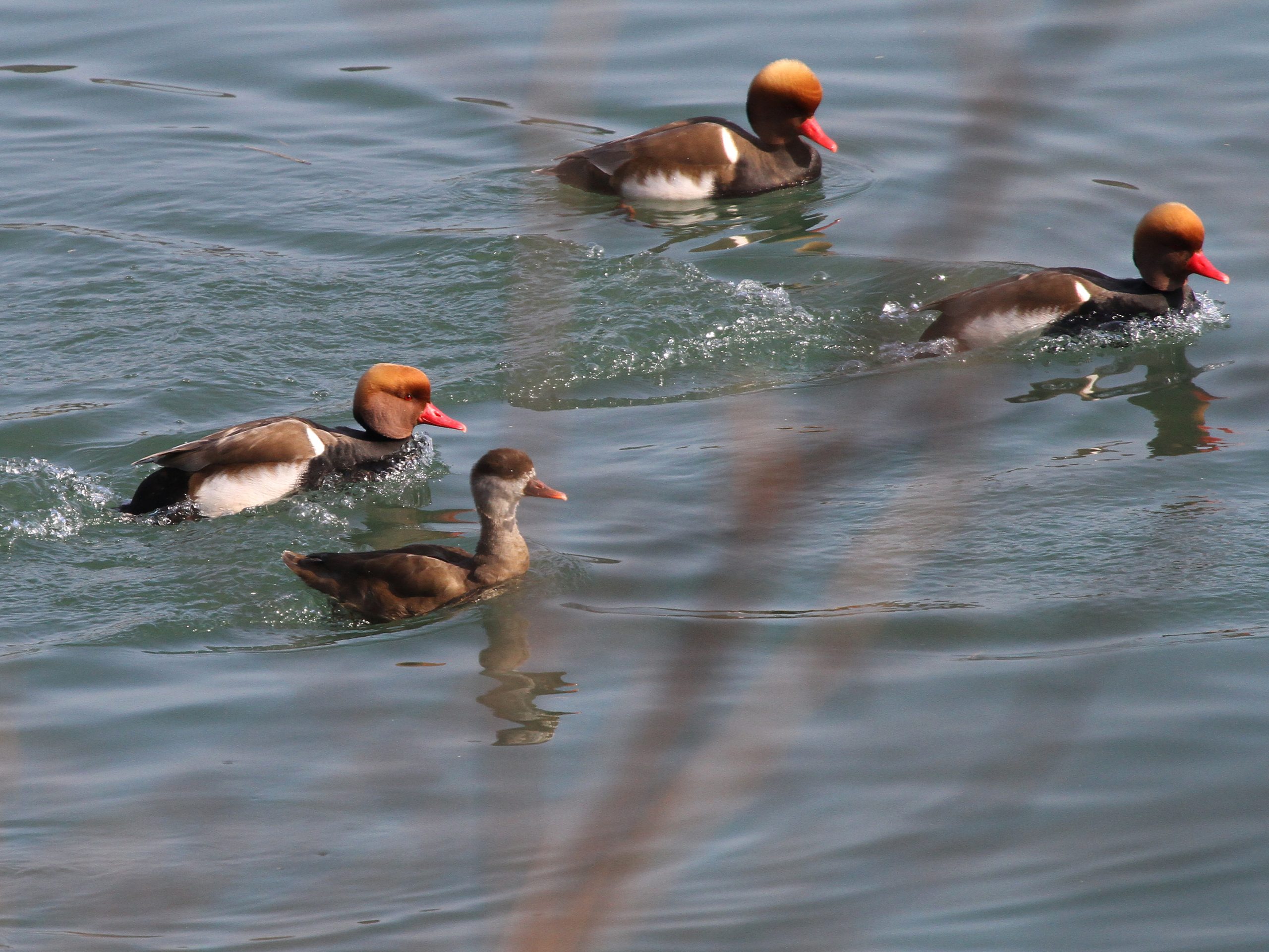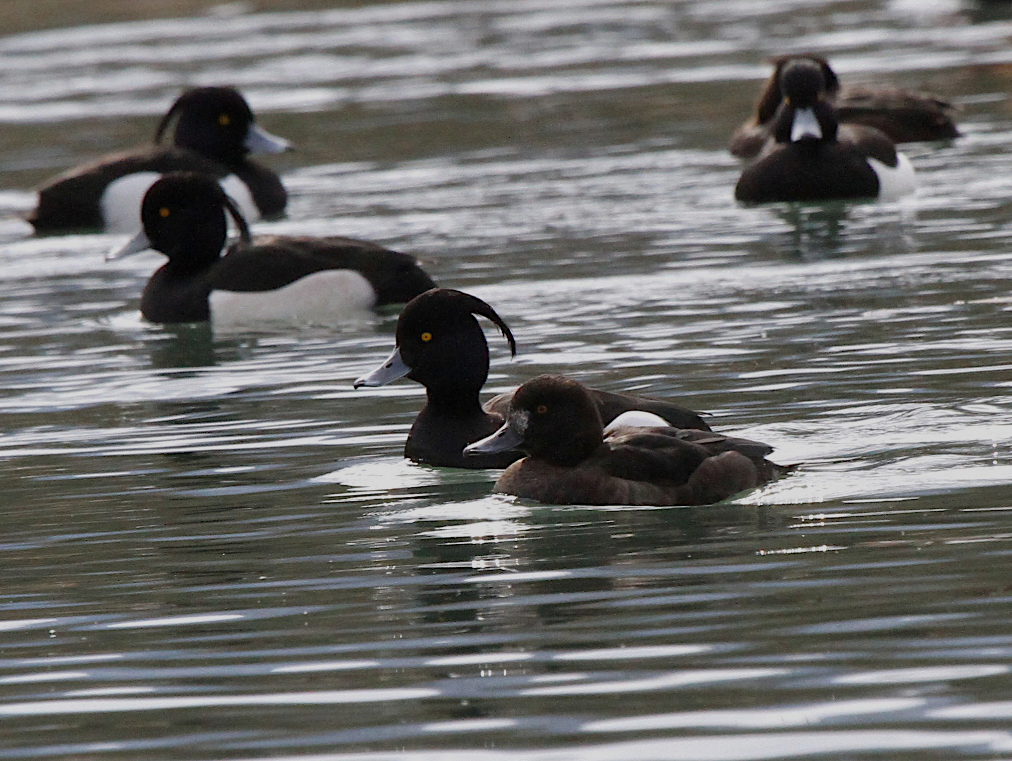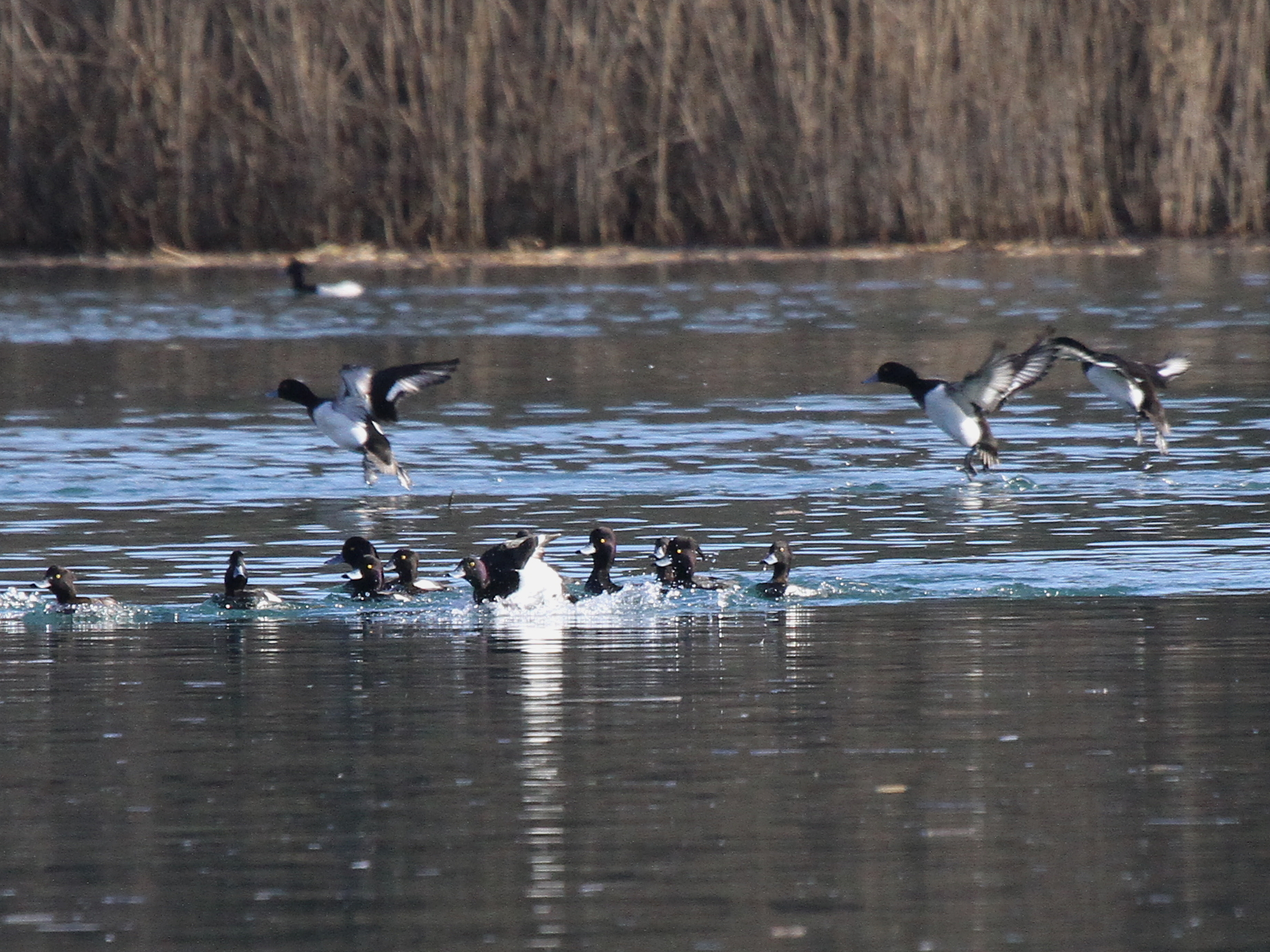 Du côté des Fuligules morillons, l’agitation autour des femelles est toujours intense. Les mâles ont enfin leur huppe bien développée, c’est certain qu’ainsi ils ont plus de chances de séduire une partenaire.