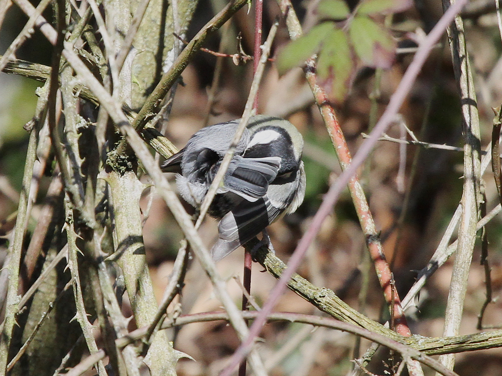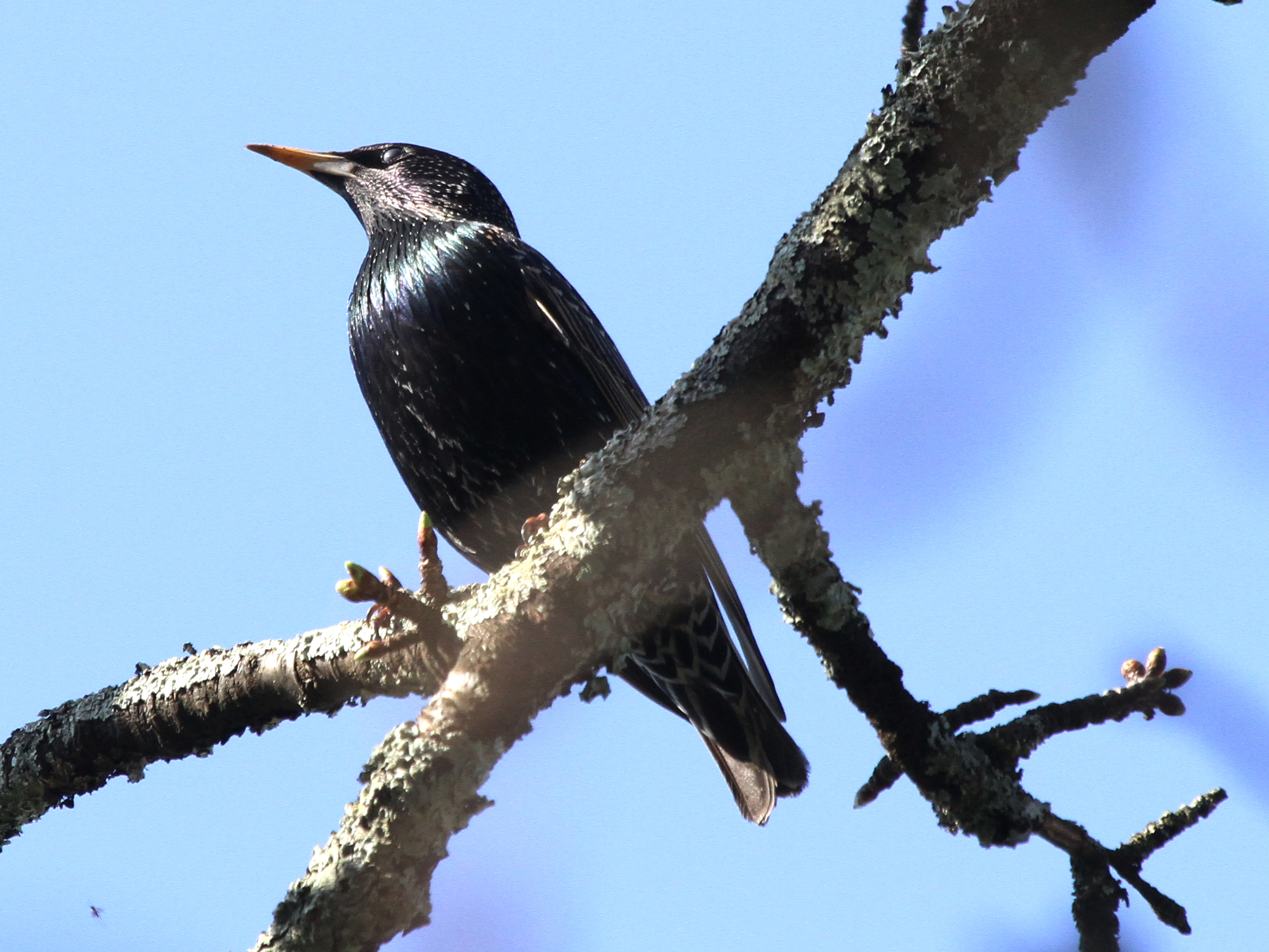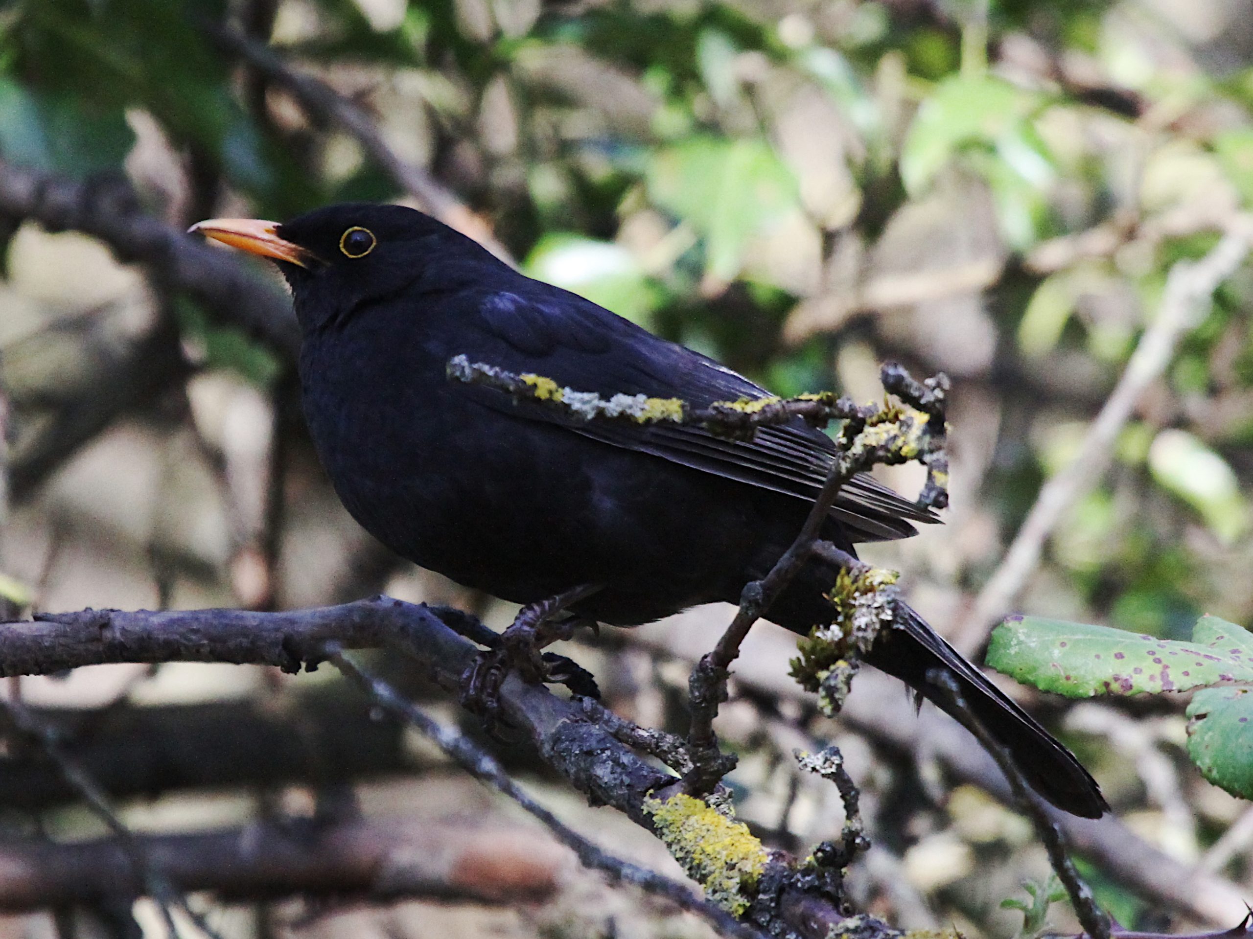 Le Merle noir est un oiseau très répandu mais aussi très farouche, qui sert de signal d’alarme aux autres oiseaux car il s’enfuit en criant fort. Celui-ci, dont la patte gauche demeure curieusement pliée au-dessus de la branche, est resté un bon moment à me surveiller avant de décider que je constituais un risque et de partir en donnant l’alerte.