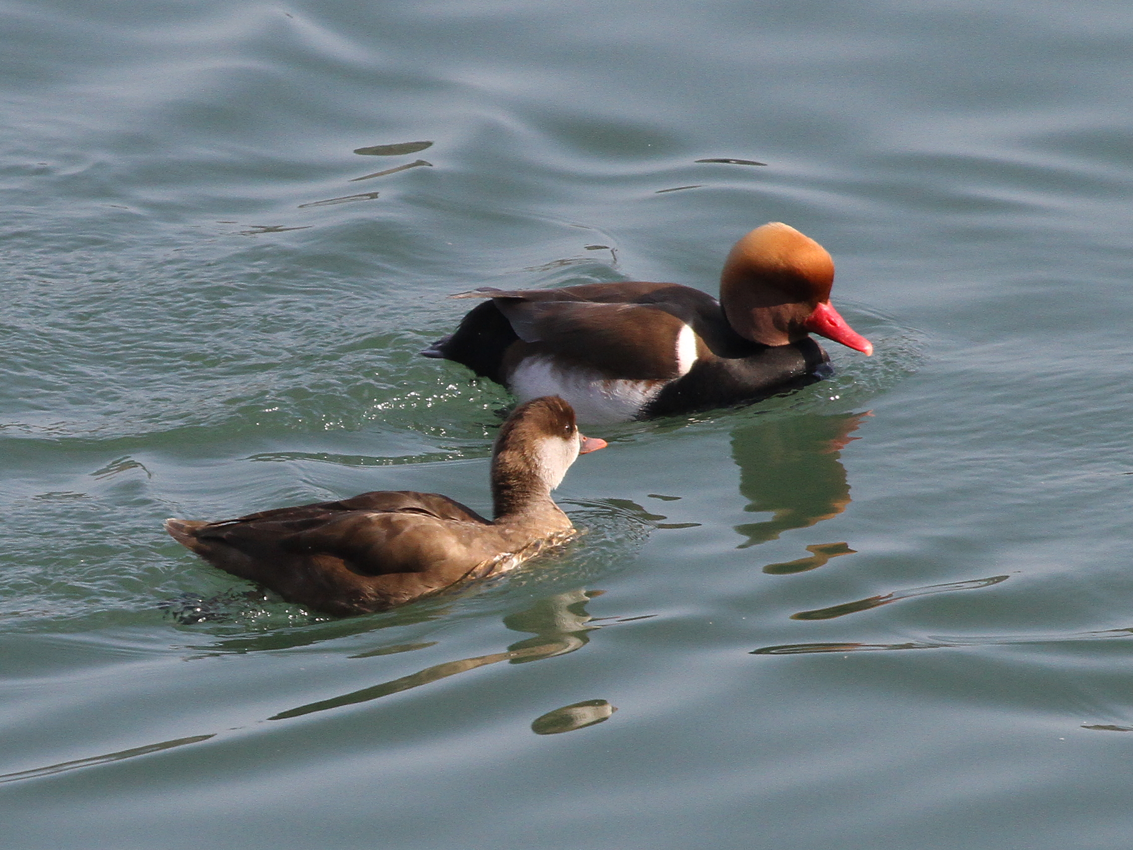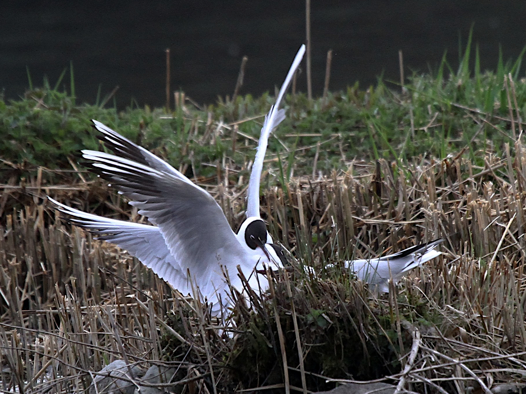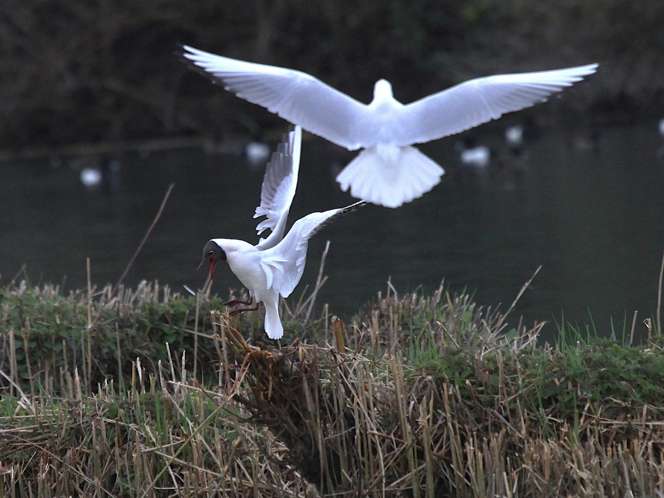 Les Nettes rousses femelles sont toujours suivies de leurs prétendants. Certaines semblent avoir trouvé un partenaire, comme la deuxième photo. Mais tout autour il règne une cacophonie assourdissante : les Mouettes rieuses sont en formation de couples. Ce sont des courses poursuites en plein ciel qui finissent sur leur petit ilôt. Ce sont des concerts de séduction, cou tendu, comme la quatrième photo. Jusqu’aux accouplements, comme en cinquième photo.