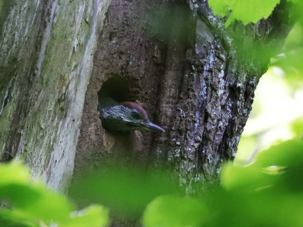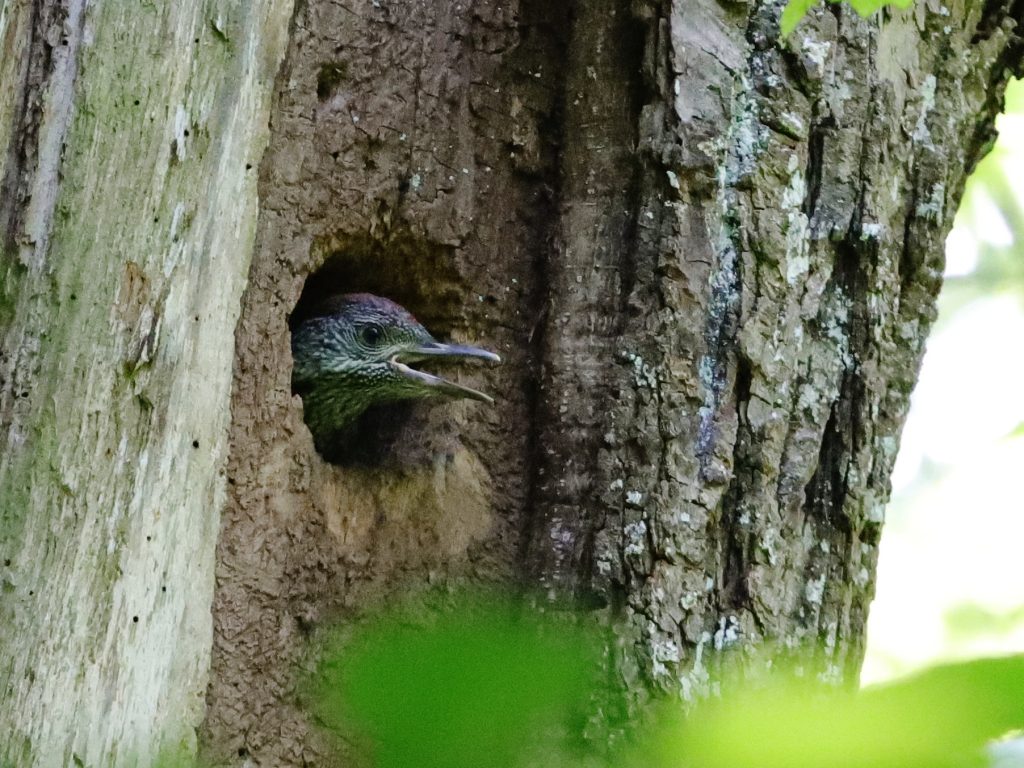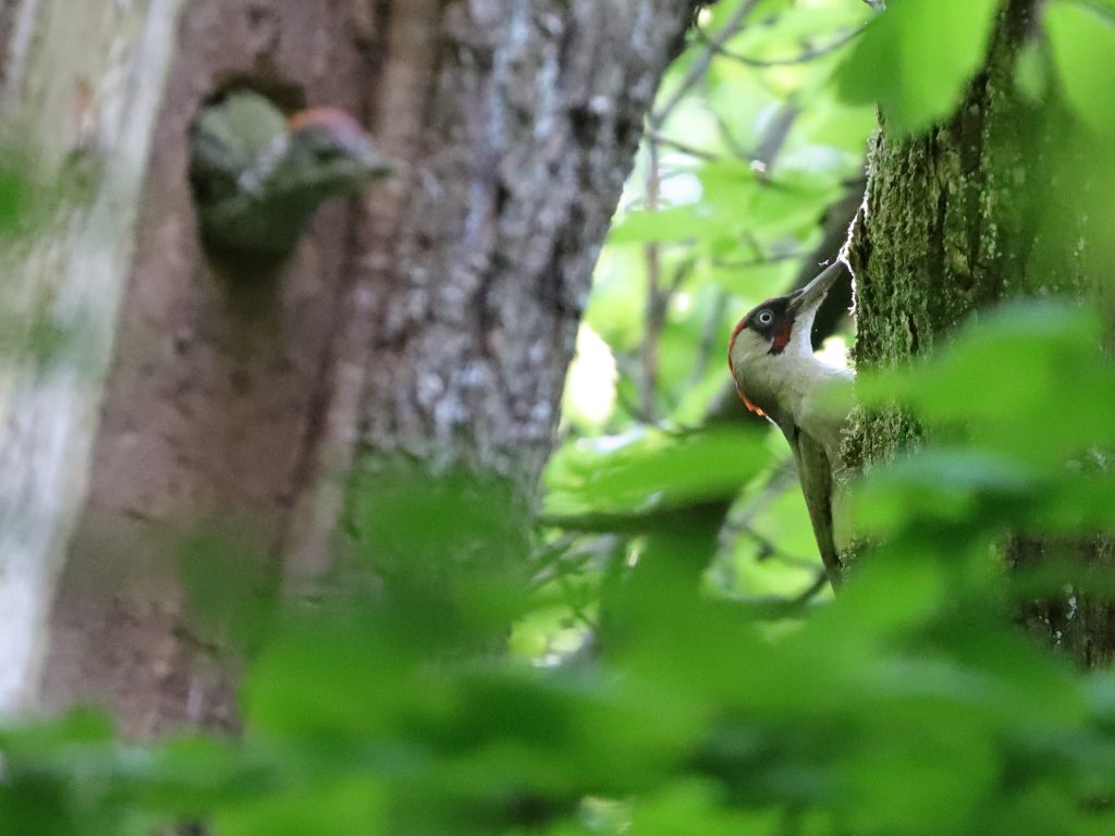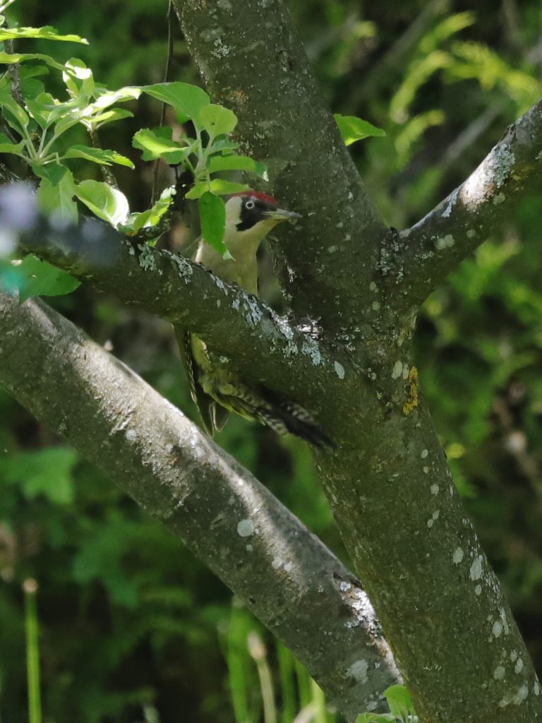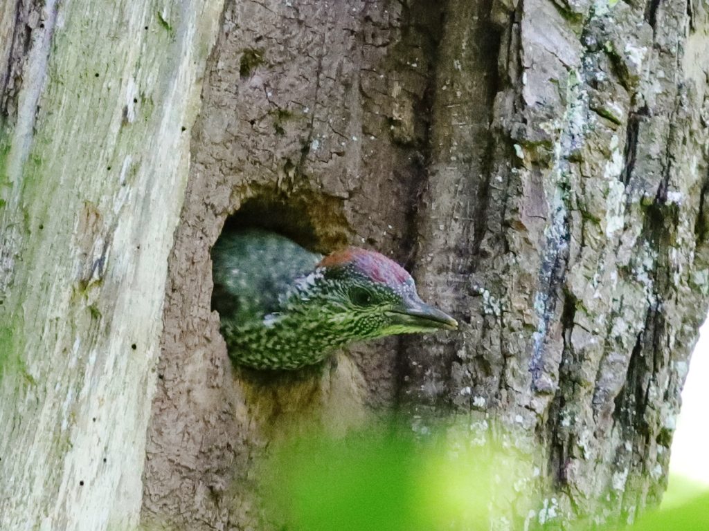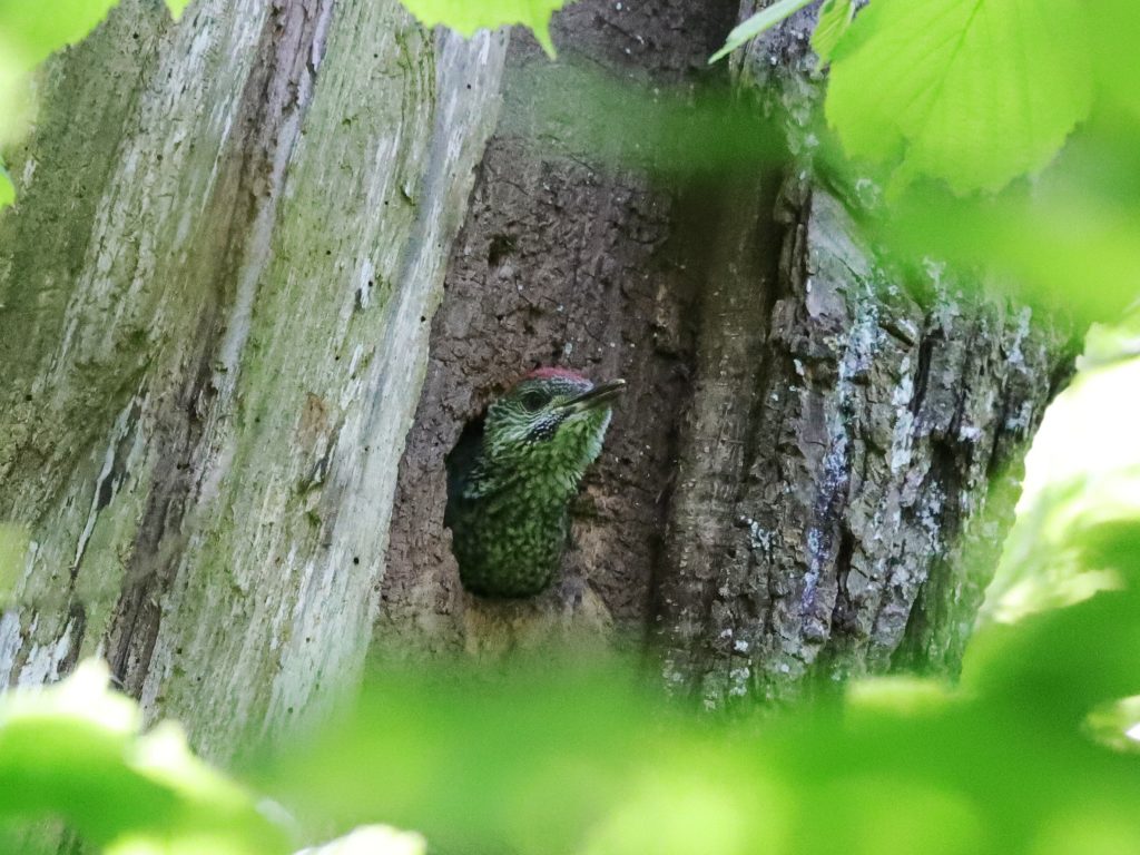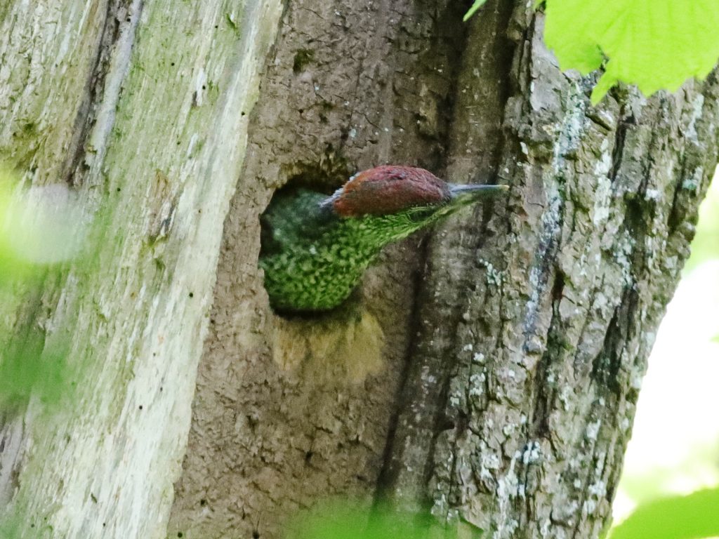 Et voici le fruit de plus de deux heures de station debout, il n’y avait qu’un seul espace entre les feuilles pour observer ce nid de Pic vert. Les jeunes appelaient avec insistance et j’attendais qu’un adulte vienne donner la becquée. Mais les adultes restaient en retrait et appelaient aussi. J’ai enfin compris que c’était pour faire sortir les jeunes. J’ai pu assister aux premiers pas, hésitants, d’un jeune Pic vert. Le deuxième jeune n’a pas osé sortir plus que les épaules, malgré les encouragements du mâle – tache rouge dans la moustache – et j’ai choisi de partir me dégourdir la nuque et les jambes.