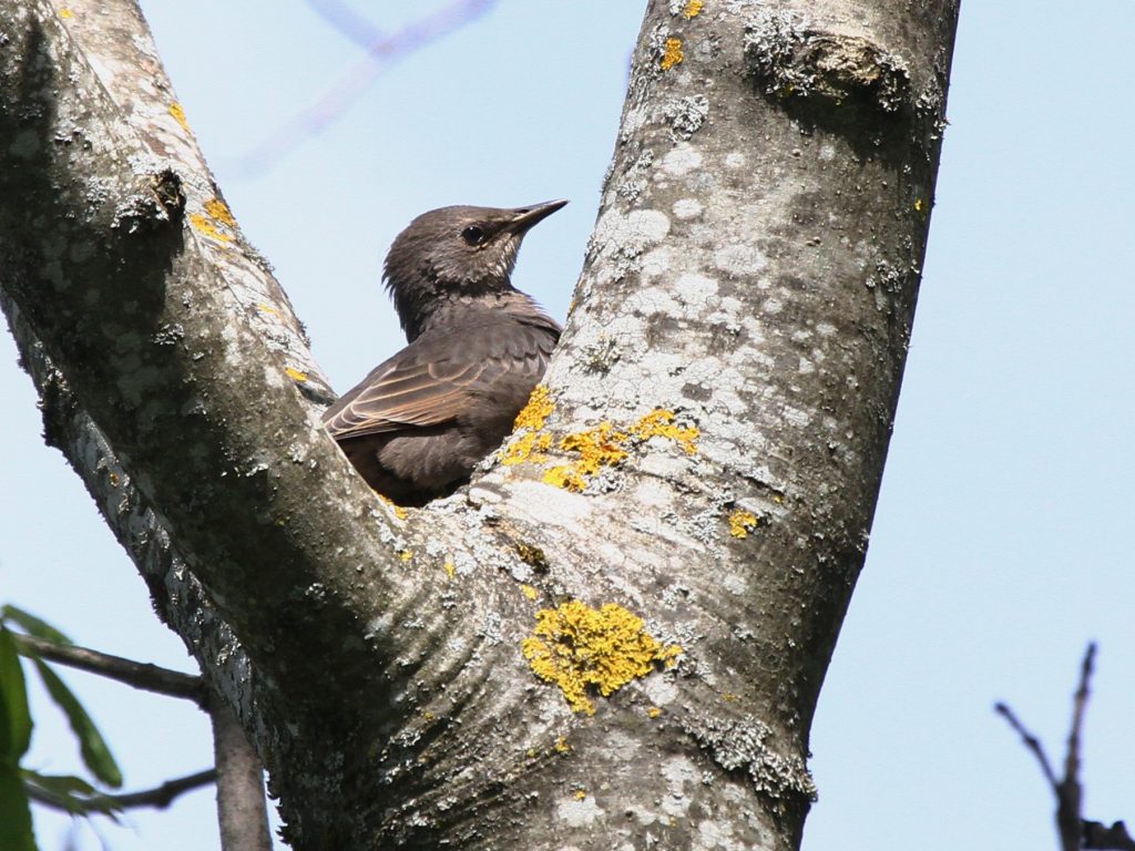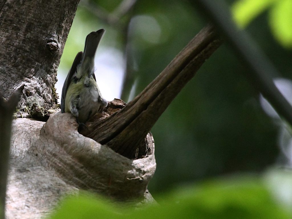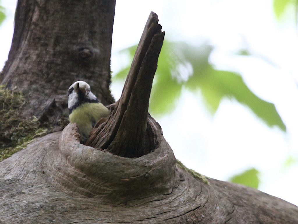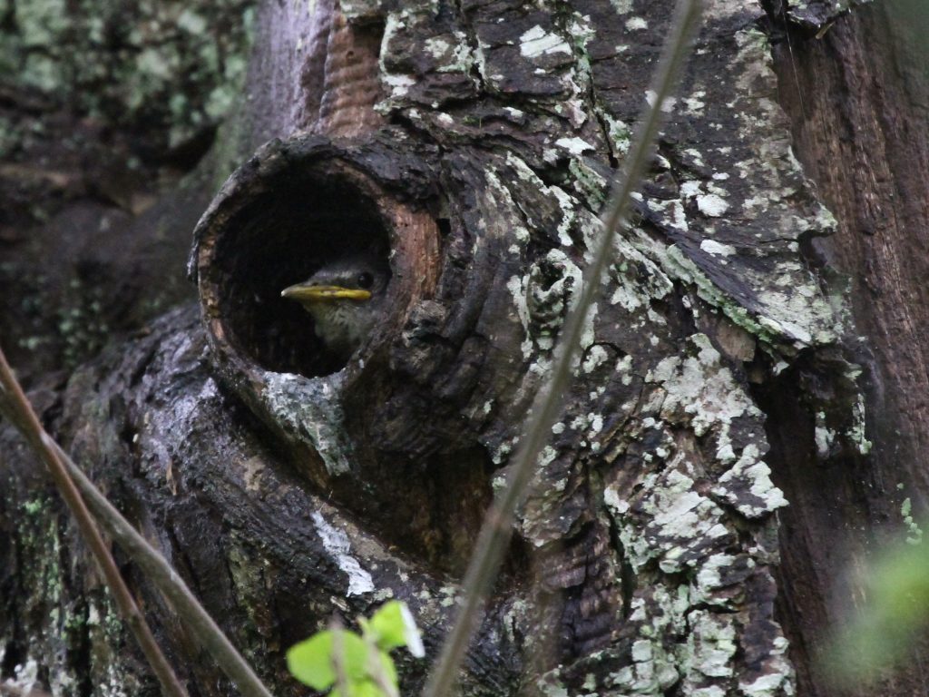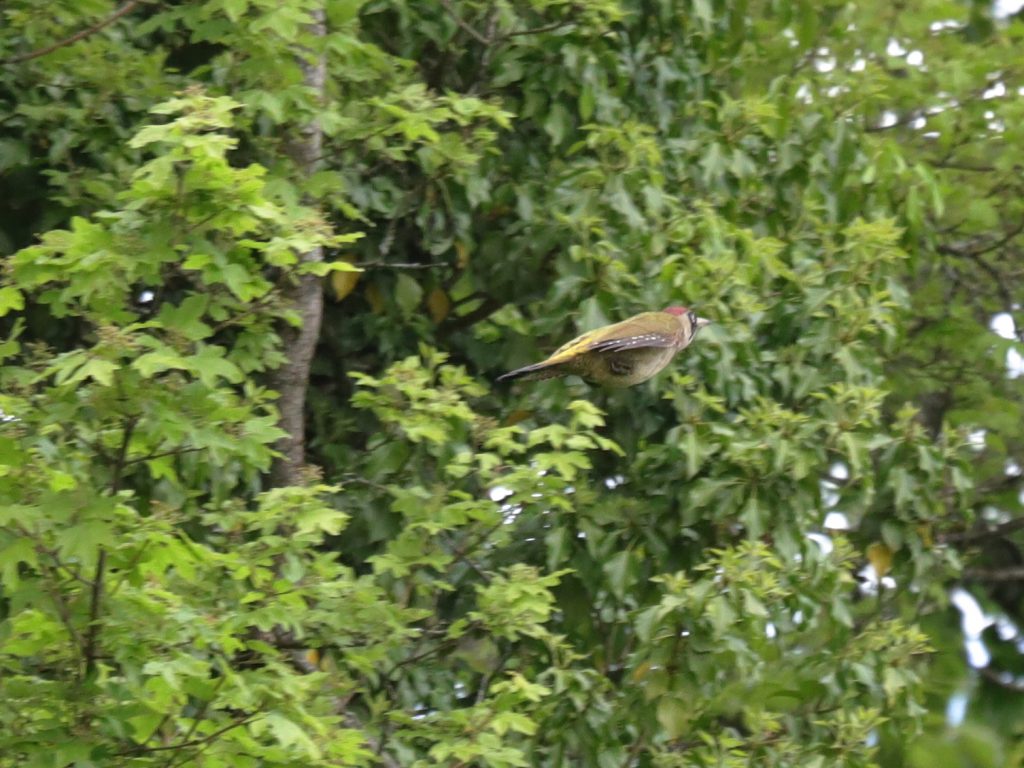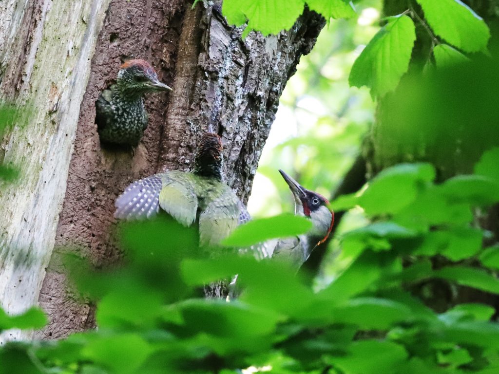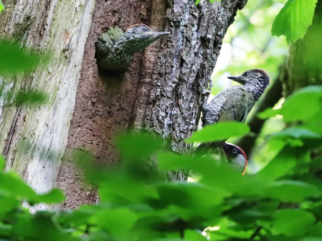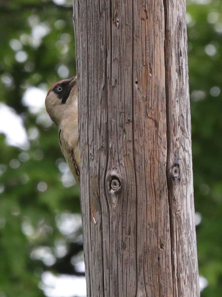 Et voici le fruit de plus de deux heures de station debout, il n’y avait qu’un seul espace entre les feuilles pour observer ce nid de Pic vert. Les jeunes appelaient avec insistance et j’attendais qu’un adulte vienne donner la becquée. Mais les adultes restaient en retrait et appelaient aussi. J’ai enfin compris que c’était pour faire sortir les jeunes. J’ai pu assister aux premiers pas, hésitants, d’un jeune Pic vert. Le deuxième jeune n’a pas osé sortir plus que les épaules, malgré les encouragements du mâle – tache rouge dans la moustache – et j’ai choisi de partir me dégourdir la nuque et les jambes.