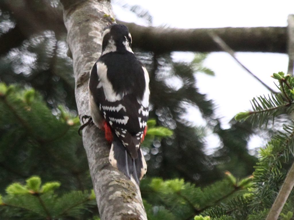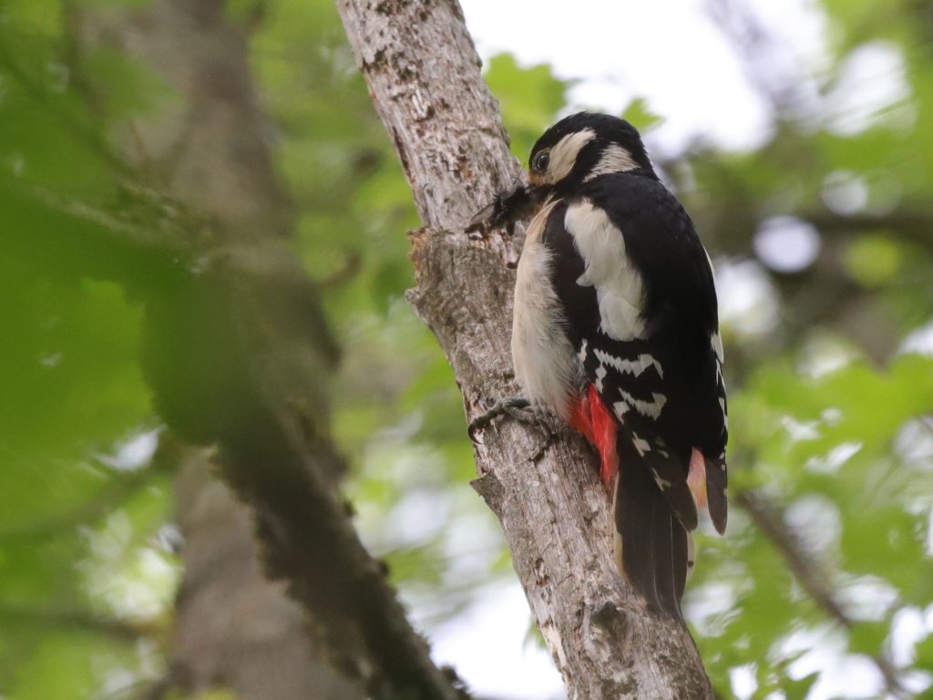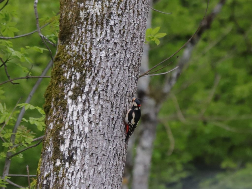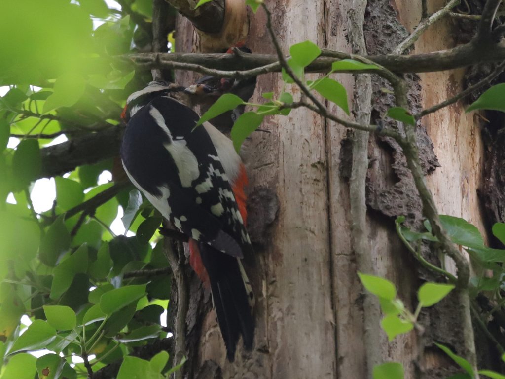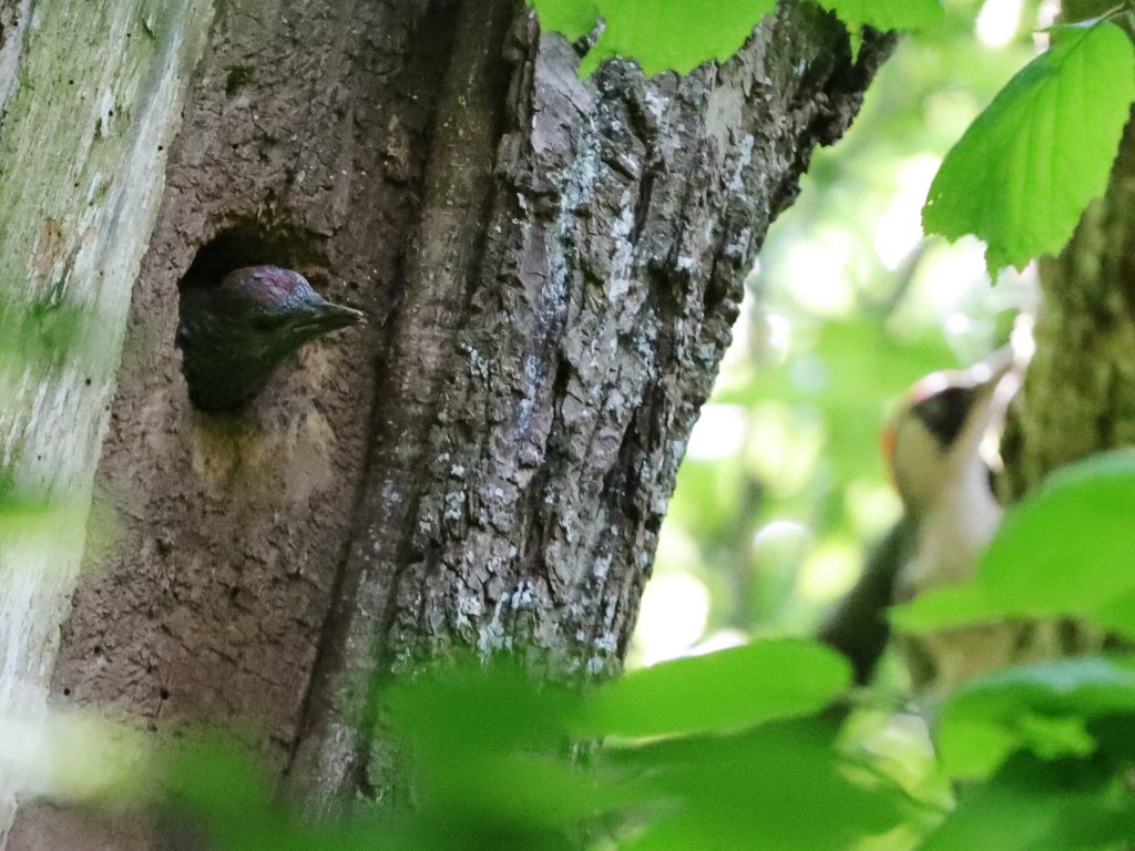 Trouver un nid de Pic épeiche n’est pas trop difficile, les jeunes appellent sans cesse. Par contre, les adultes sont très méfiants et il faut du temps pour qu’ils osent s’approcher et nourrir le ou les oisillons. Il y a d’abord eu la femelle – arrière de la tête noire – puis le mâle – arrière de la tête rouge.