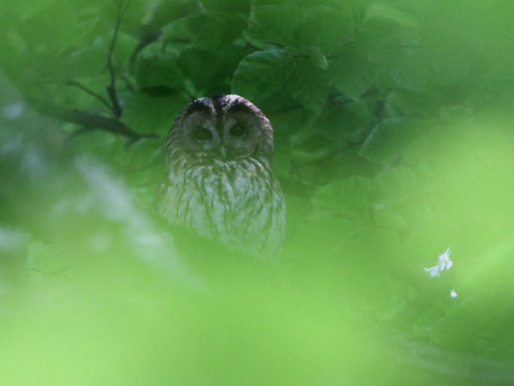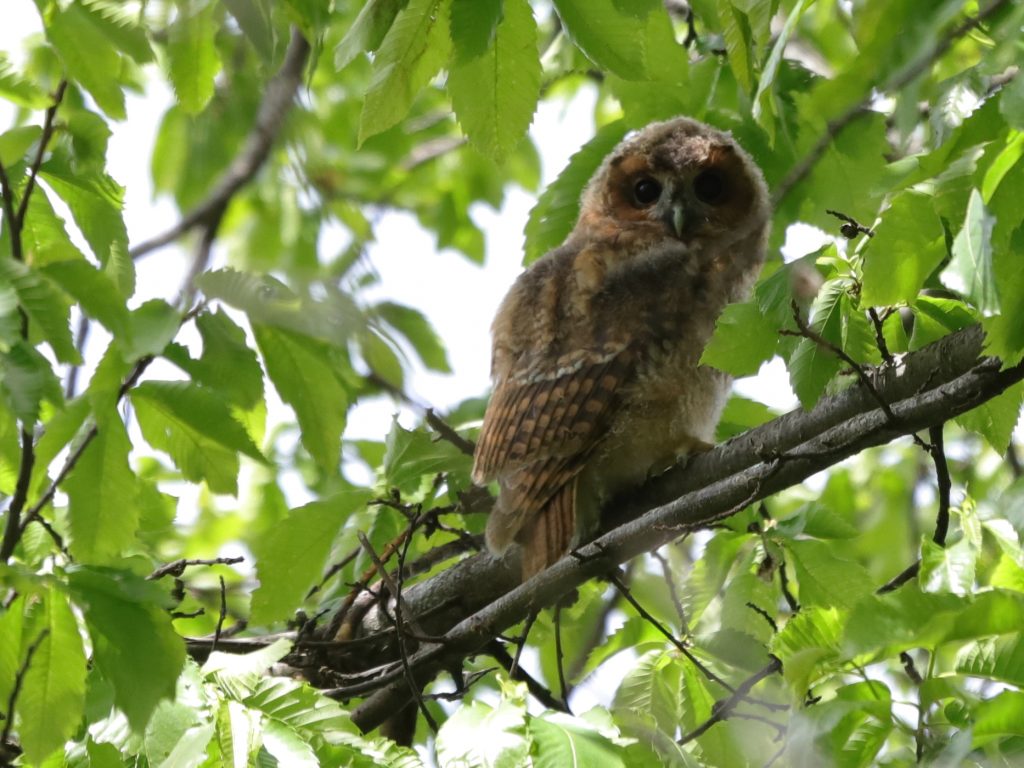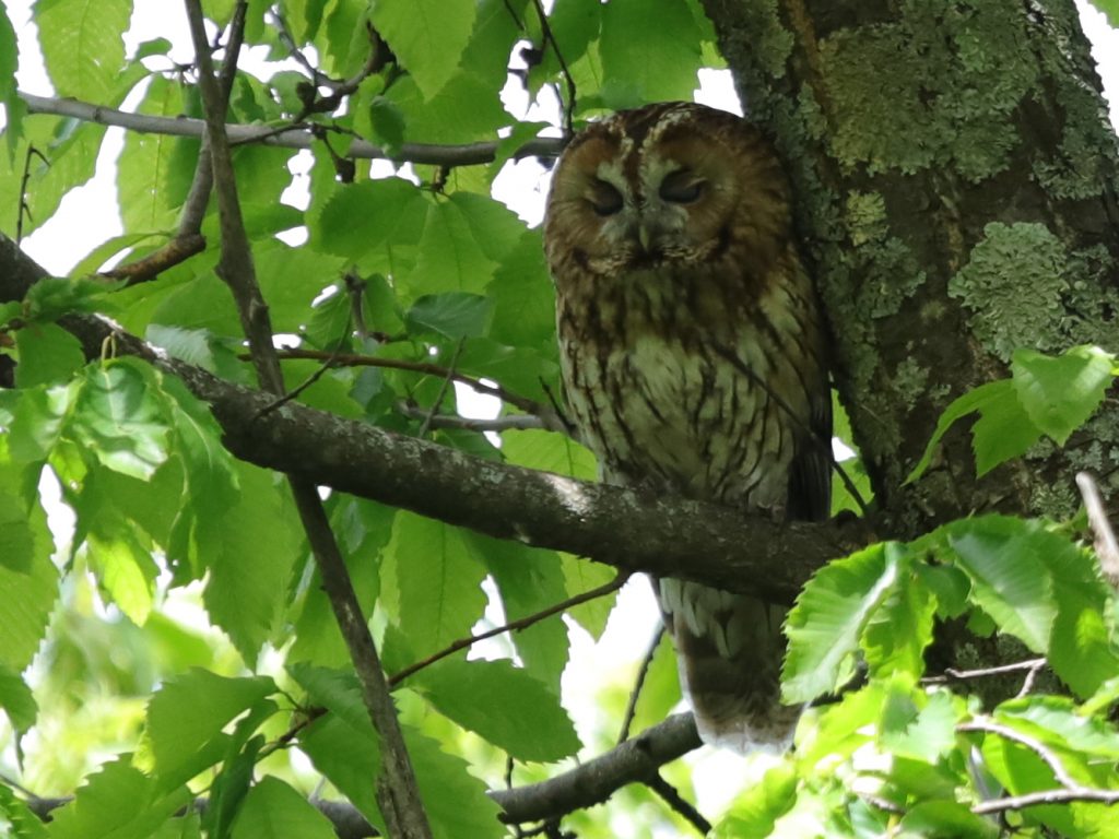 Tout d’abord une nichée de Chouettes hulottes. Au moins trois petits, peut-être quatre ou cinq et les deux adultes à leur côté. Impossible de cadrer tout ce monde, qui s’est ensuite éparpillé dans les châtaigniers, harcelé par les merles. Quand le calme est revenu, j’ai pu retrouver deux des jeunes et un adulte, assoupi contre un tronc.