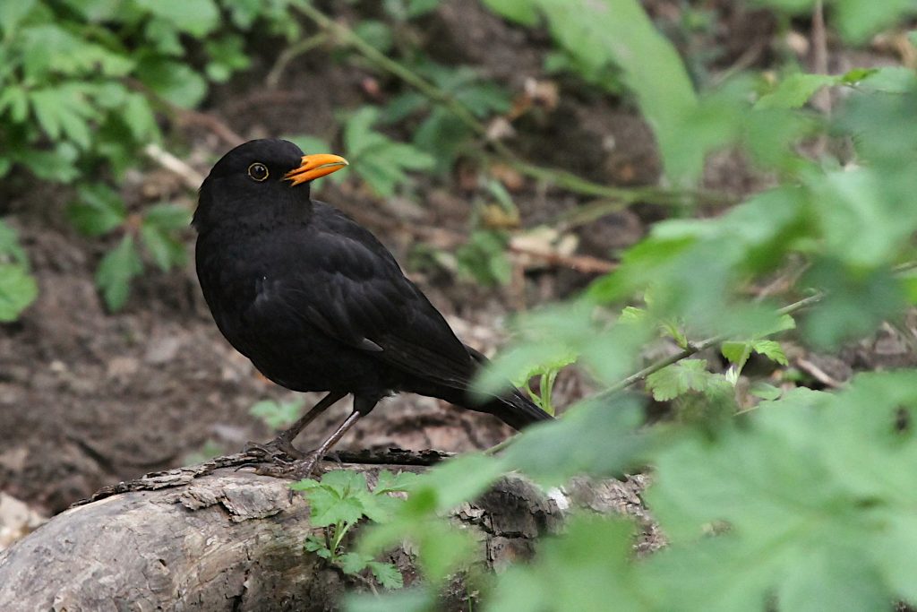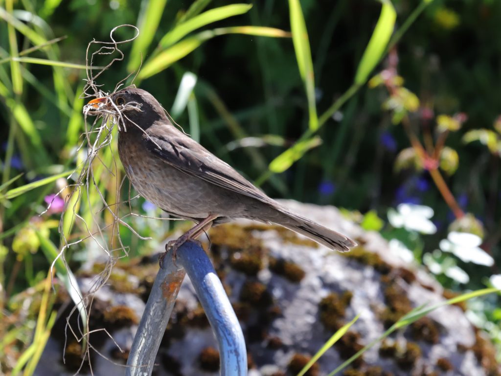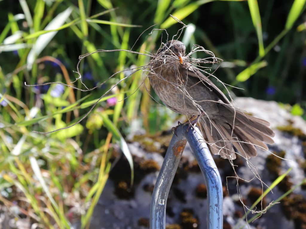 Certains Merles noirs préparent une nichée, ici c’est une femelle qui rassemble des fibres, perchée sur l’arceau d’une benne à verre – pas très bucolique mais au moins photogénique.