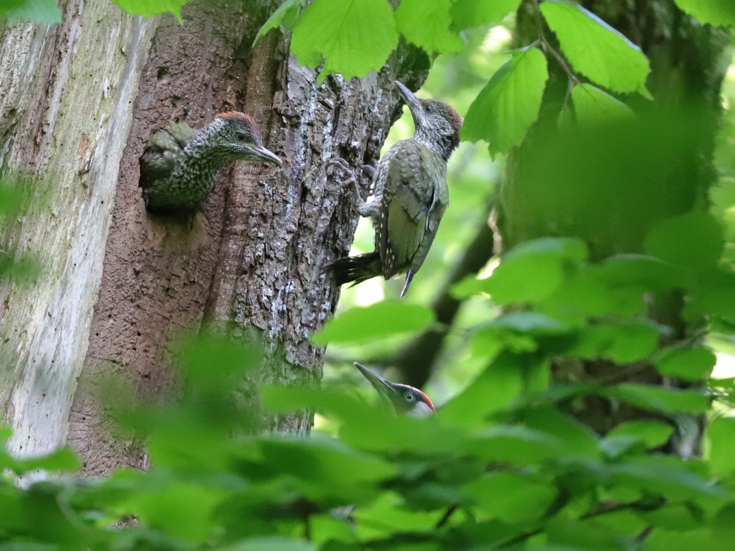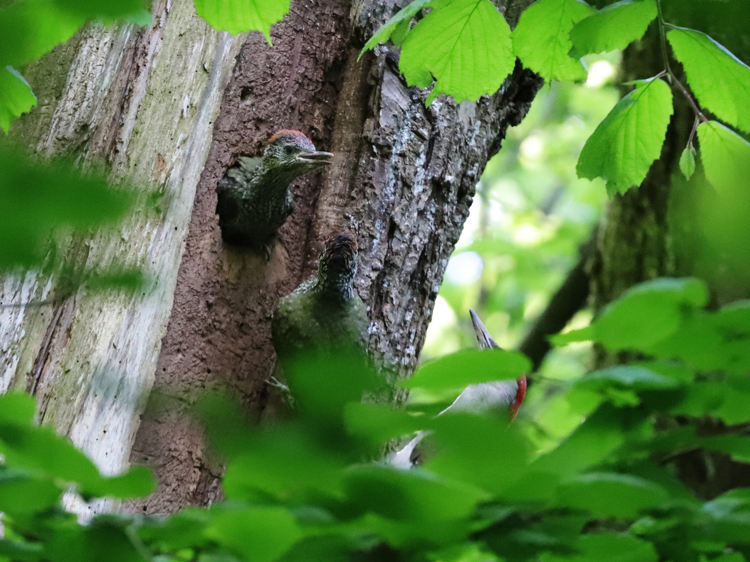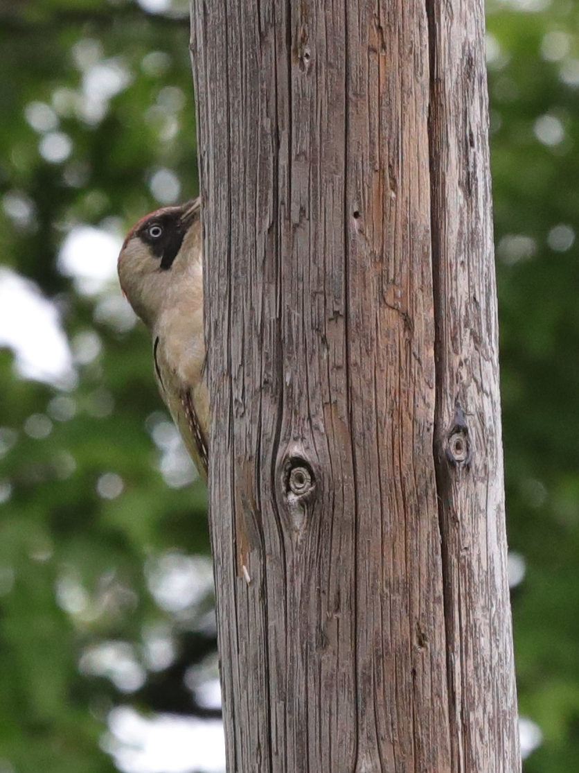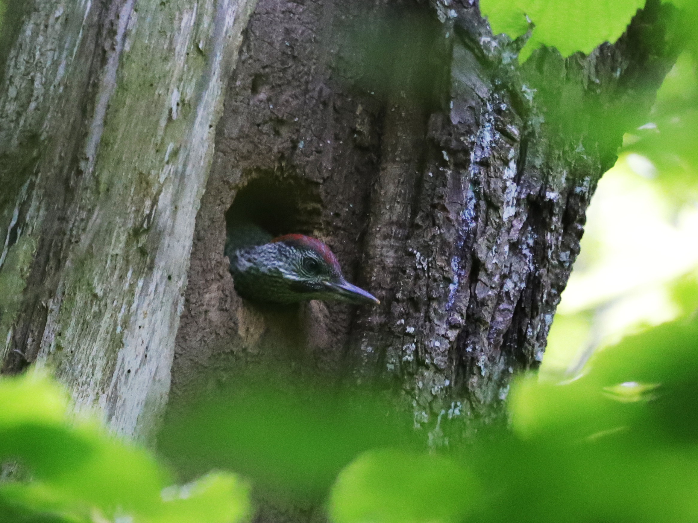 Et voici le fruit de plus de deux heures de station debout, il n’y avait qu’un seul espace entre les feuilles pour observer ce nid de Pic vert. Les jeunes appelaient avec insistance et j’attendais qu’un adulte vienne donner la becquée. Mais les adultes restaient en retrait et appelaient aussi. J’ai enfin compris que c’était pour faire sortir les jeunes. J’ai pu assister aux premiers pas, hésitants, d’un jeune Pic vert. Le deuxième jeune n’a pas osé sortir plus que les épaules, malgré les encouragements du mâle – tache rouge dans la moustache – et j’ai choisi de partir me dégourdir la nuque et les jambes.