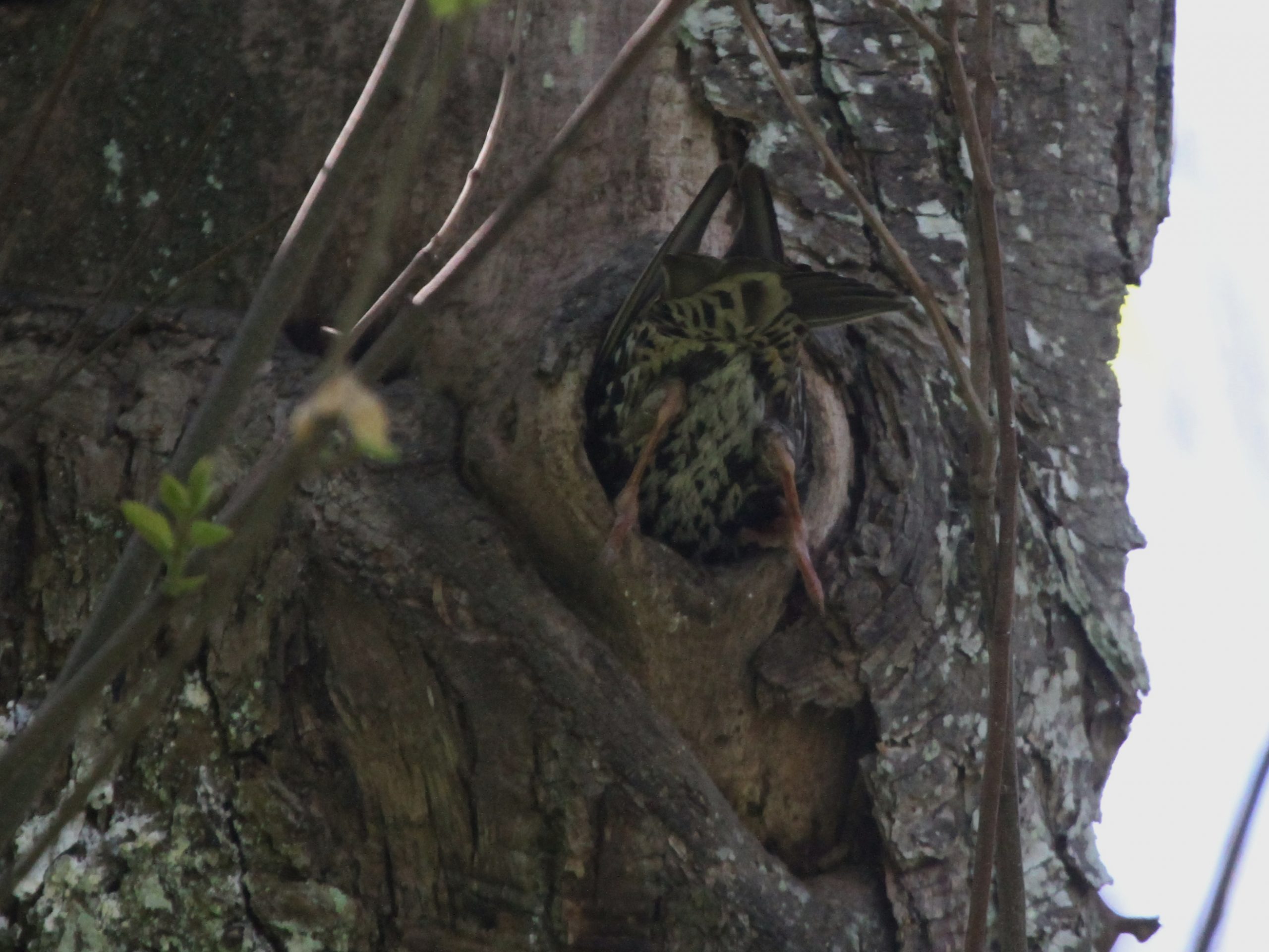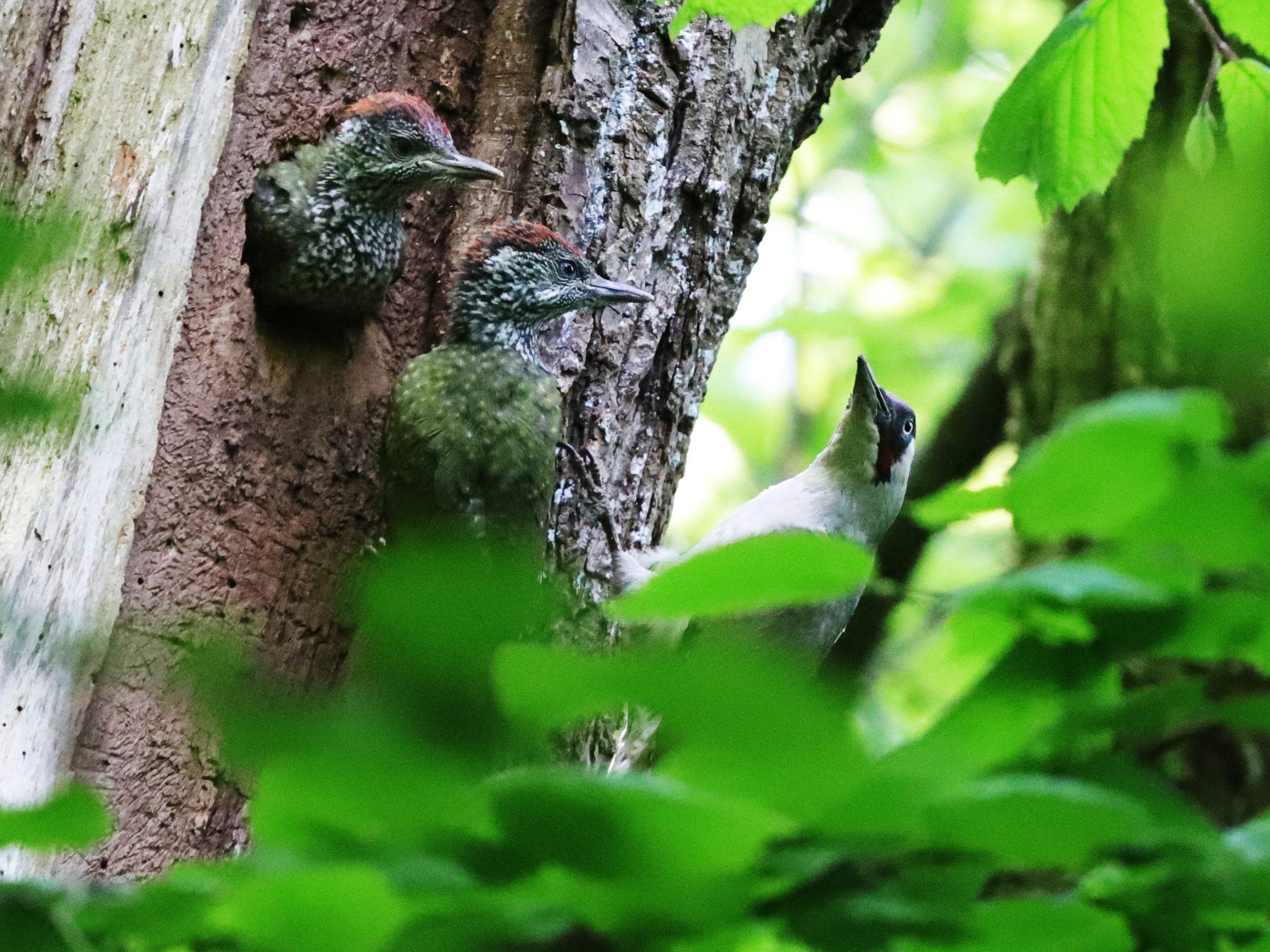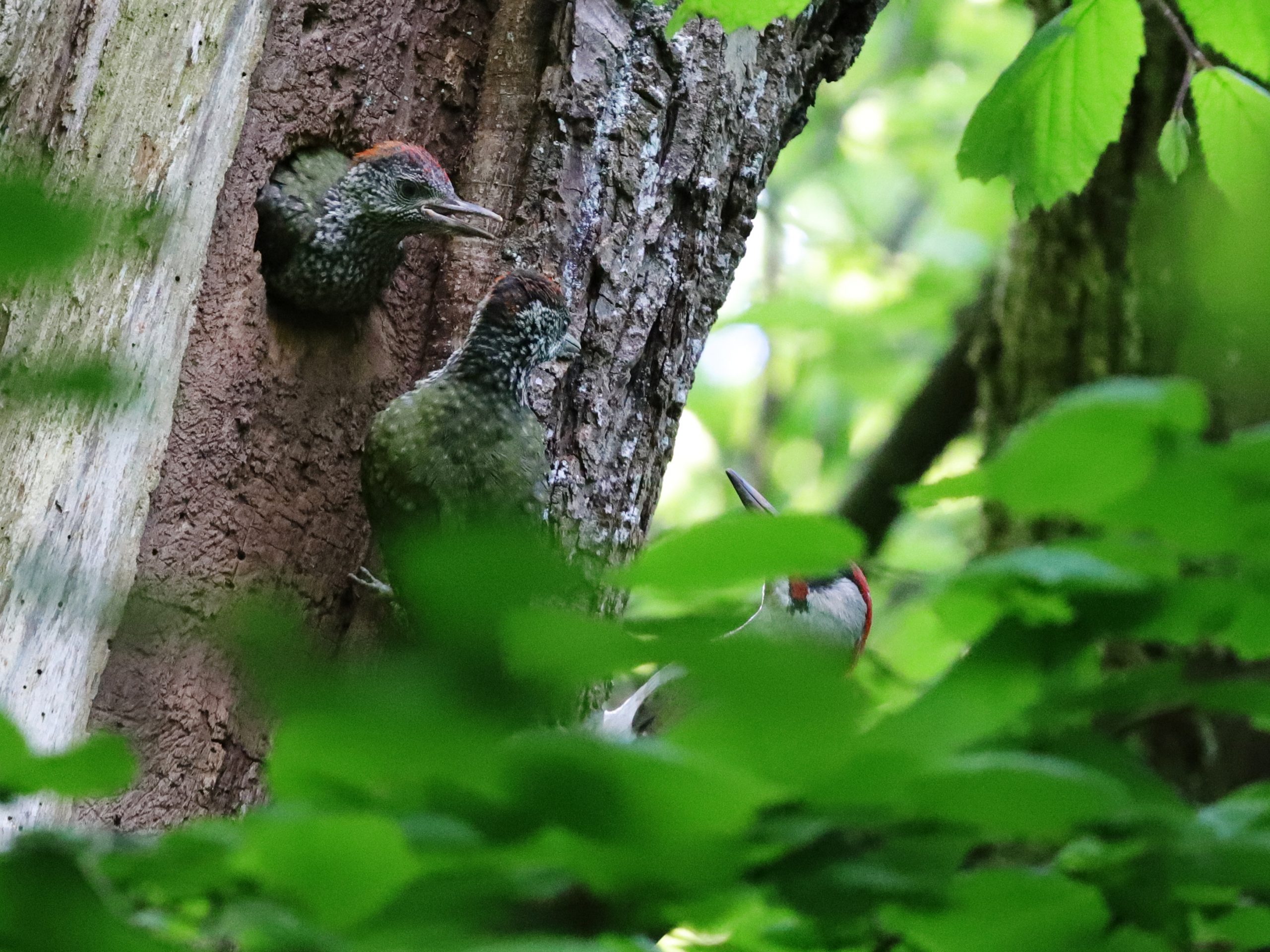 Et voici le fruit de plus de deux heures de station debout, il n’y avait qu’un seul espace entre les feuilles pour observer ce nid de Pic vert. Les jeunes appelaient avec insistance et j’attendais qu’un adulte vienne donner la becquée. Mais les adultes restaient en retrait et appelaient aussi. J’ai enfin compris que c’était pour faire sortir les jeunes. J’ai pu assister aux premiers pas, hésitants, d’un jeune Pic vert. Le deuxième jeune n’a pas osé sortir plus que les épaules, malgré les encouragements du mâle – tache rouge dans la moustache – et j’ai choisi de partir me dégourdir la nuque et les jambes.